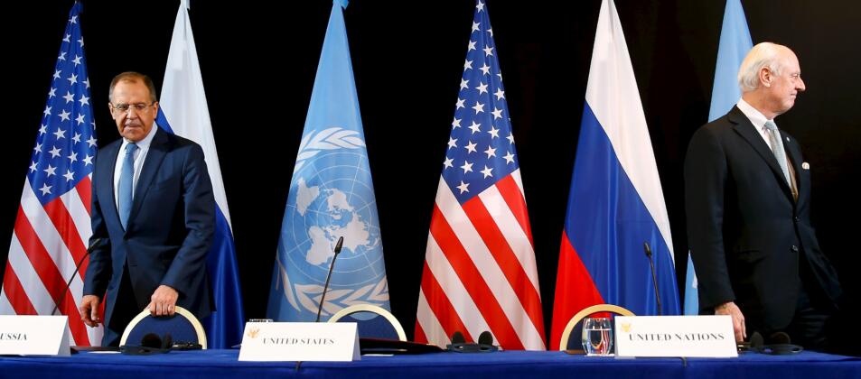 Perdana Menteri Rusia Sergei Lavrov (kiri) dan Utusan Khusus PBB untuk Suriah, Staffan de Mistura tiba di konferensi pers setelah pertemuan Grup Pendukung Suriah Internasional (ISSG( di Munich, Jerman, Jumat (12/2). ANTARA FOTO/REUTERS/Michael Dalder/cfo/16
