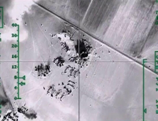 Gambar diambil dari rekaman udara yang dirilis oleh Kementerian Pertahanan Rusia, Kamis (11/2), menunjukkan serangan udara yang dilakukan oleh angkatan udara negara tersebut dan mengenai yang menurut Kementerian Pertahanan adalah fasilitas penyimpanan minyak milik Islamic State, di sebuah lokasi yang tidak diketahui di Suriah. ANTARA FOTO/REUTERS/Ministry of Defence of the Russian Federation/Handout via Reuters/cfo/16