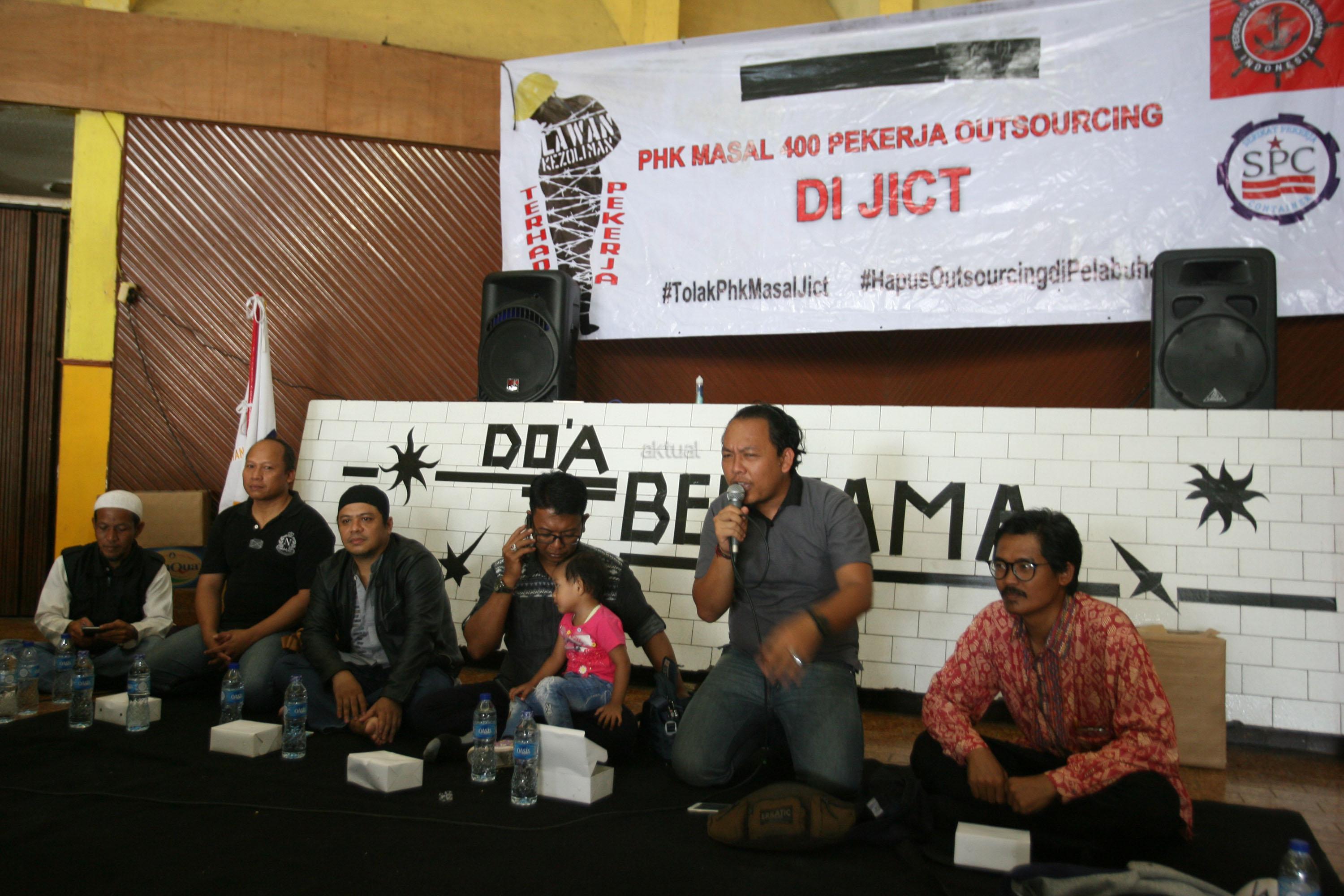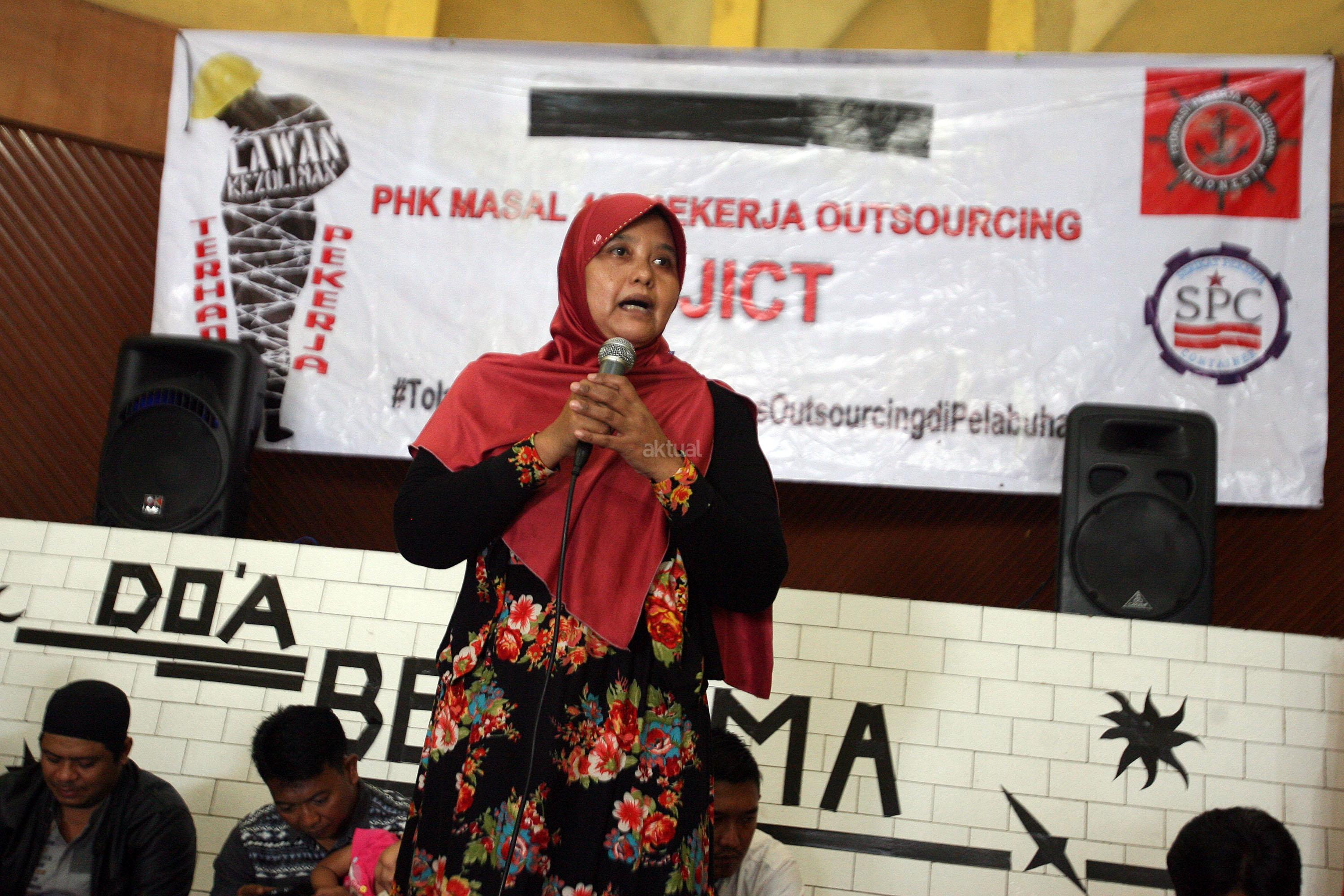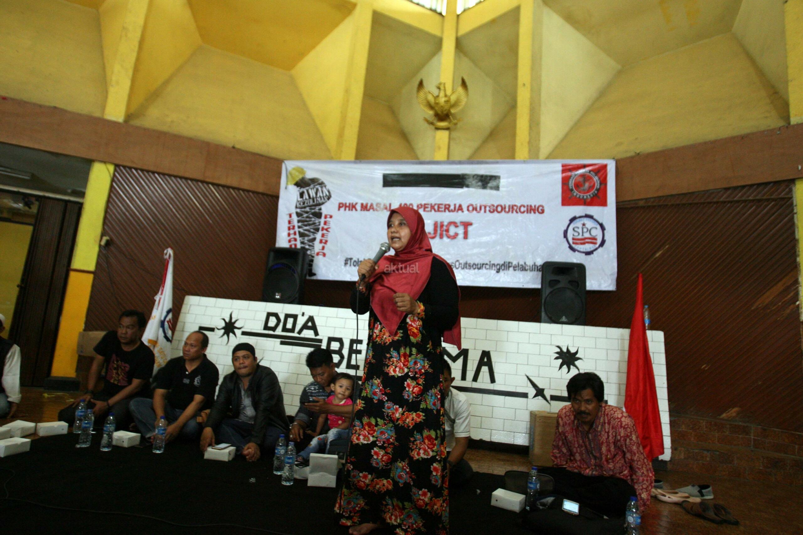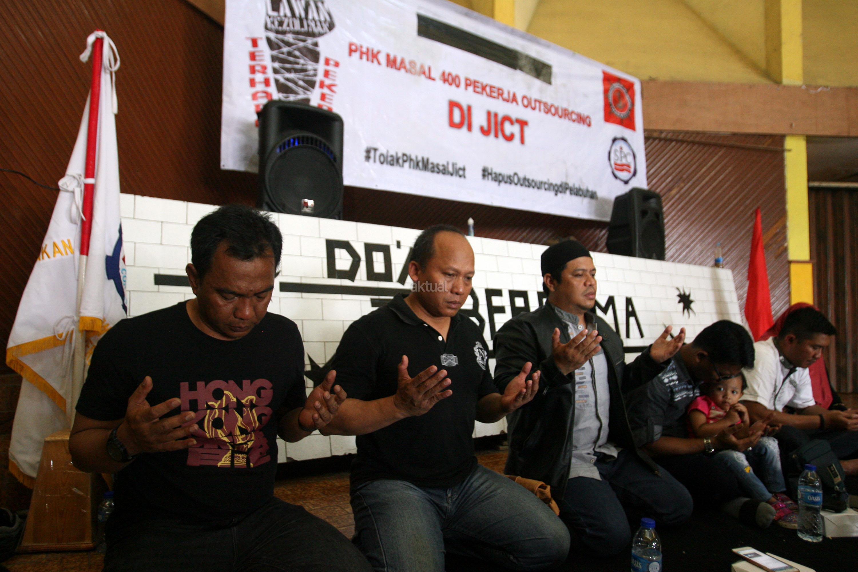 Sejumlah pekerja outsourcing JICT terdampak PHK massal mengikuti doa bersama di Jakarta, Minggu (31/12). Doa bersama tersebut juga diikuti para istri korban yang juga mempertanyakan kebijakan Direksi JICT yang melakukan pemecatan terhadap suami mereka tanpa alasan yang jelas. AKTUAL/Tino Oktaviano