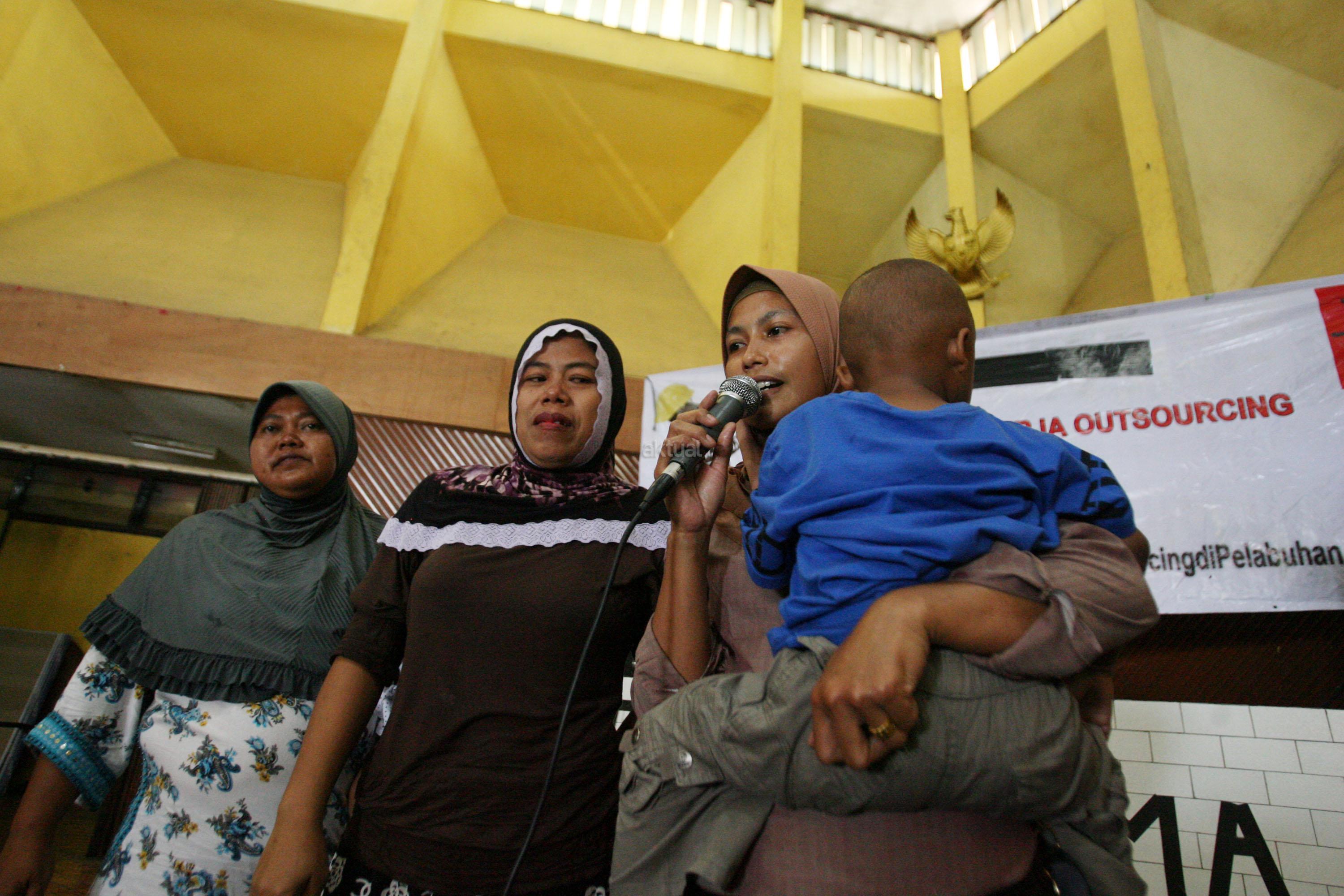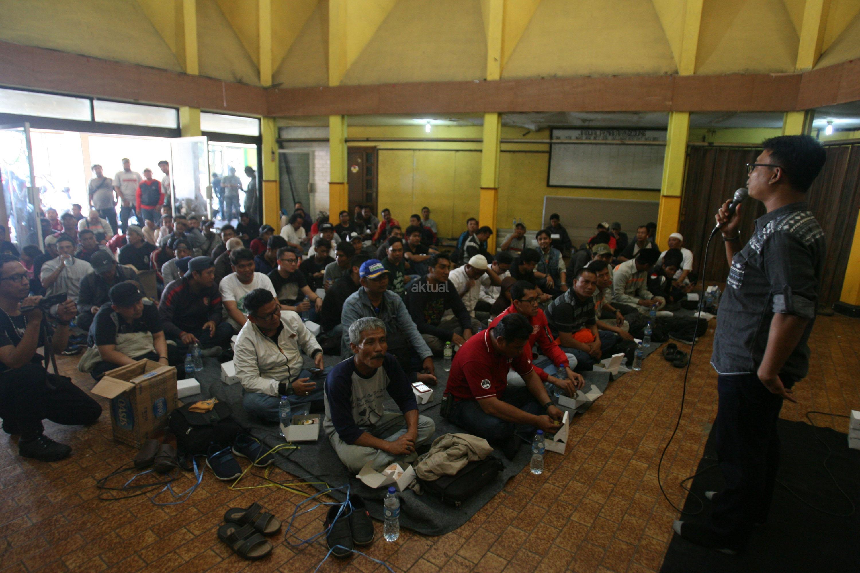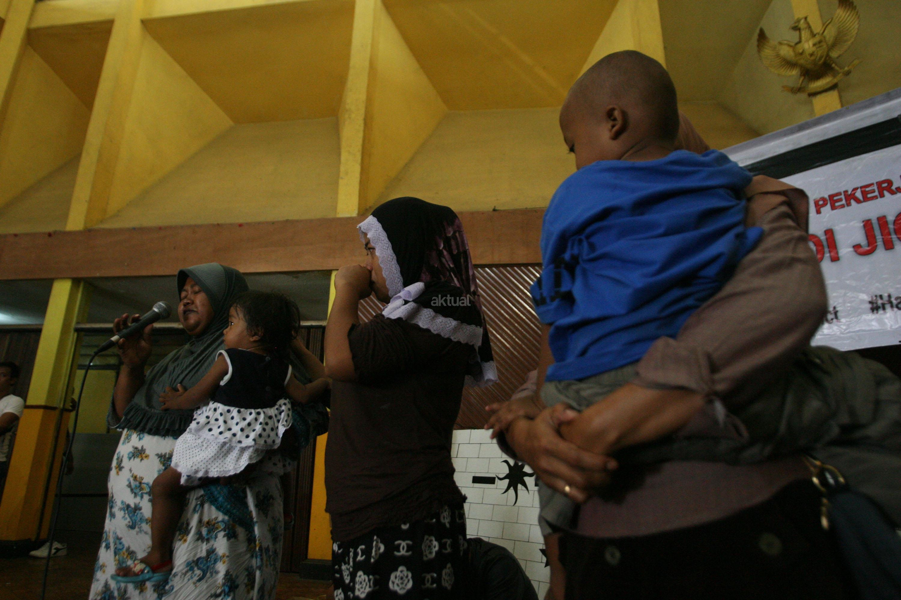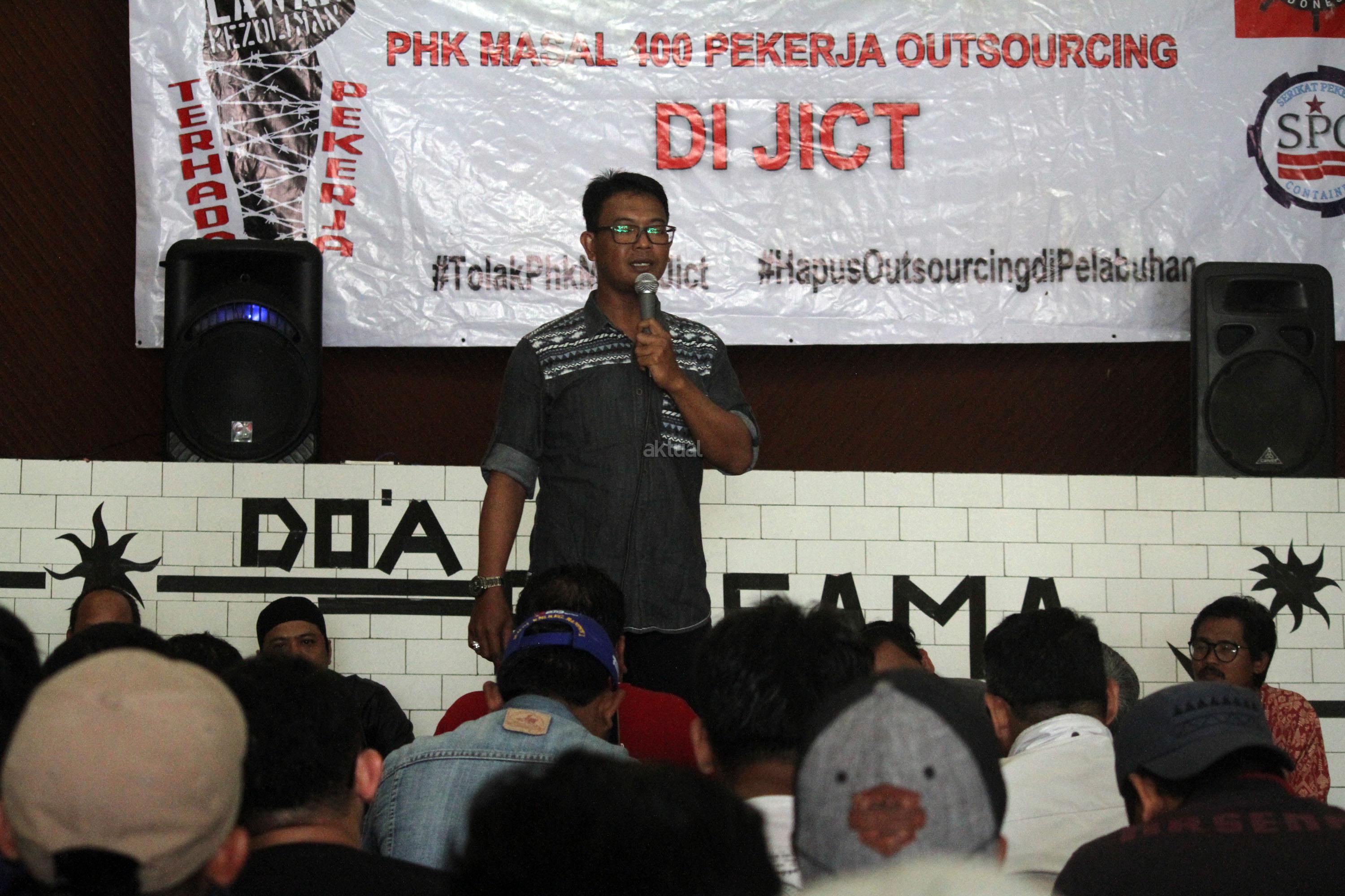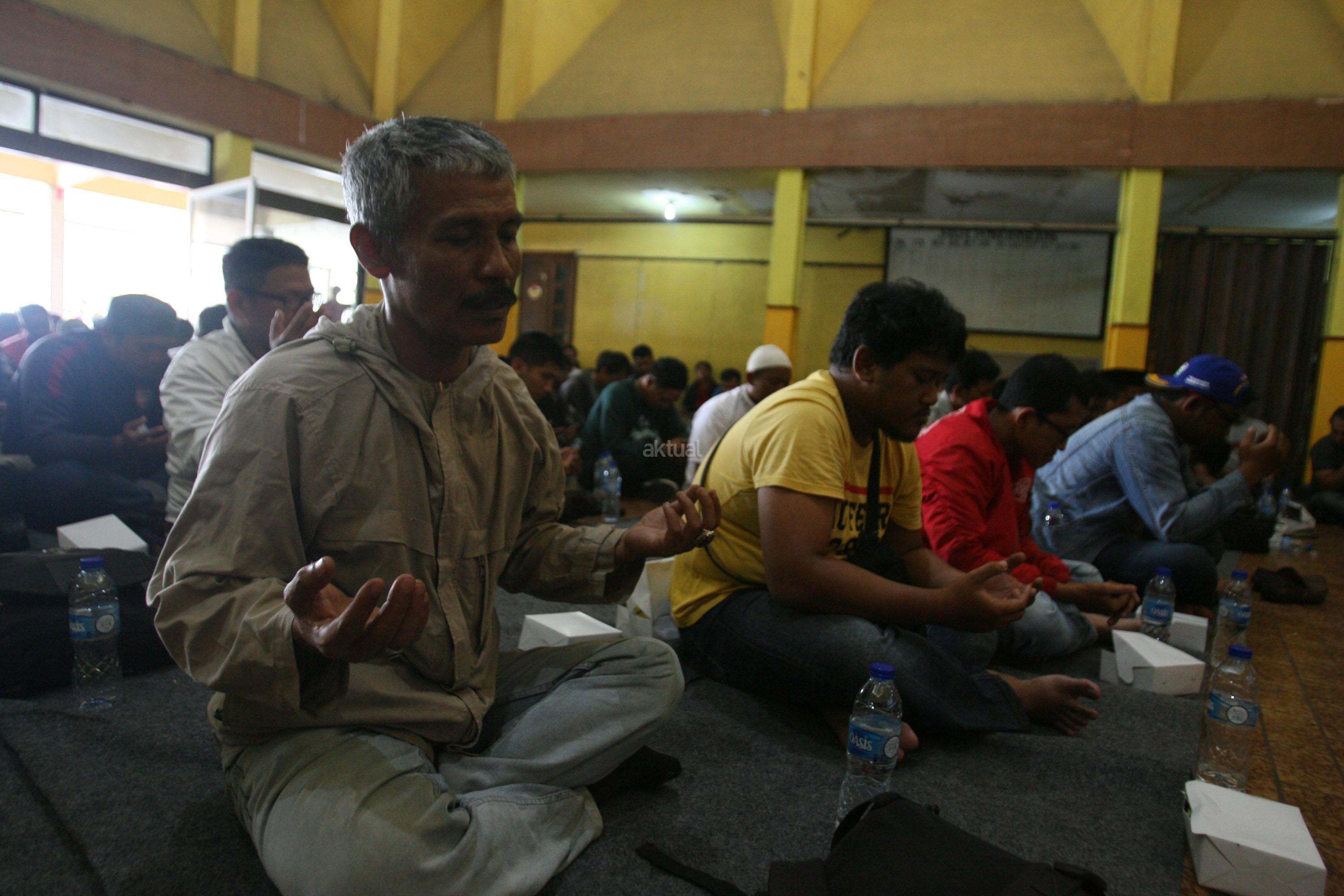 Sejumlah pekerja outsourcing JICT terdampak PHK massal mengikuti doa bersama di Jakarta, Minggu (31/12). Doa bersama tersebut juga diikuti para istri korban yang juga mempertanyakan kebijakan Direksi JICT yang melakukan pemecatan terhadap suami mereka tanpa alasan yang jelas. AKTUAL/Tino Oktaviano