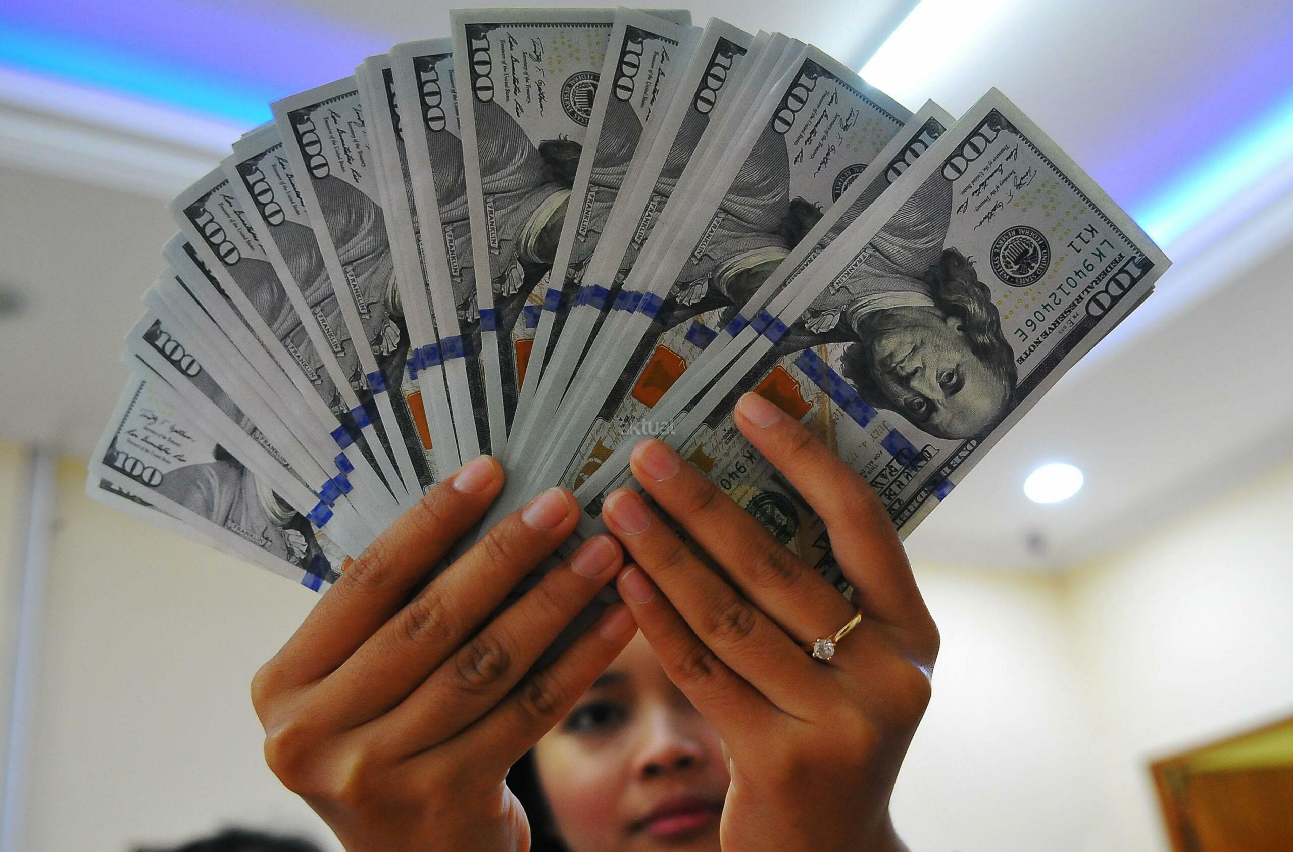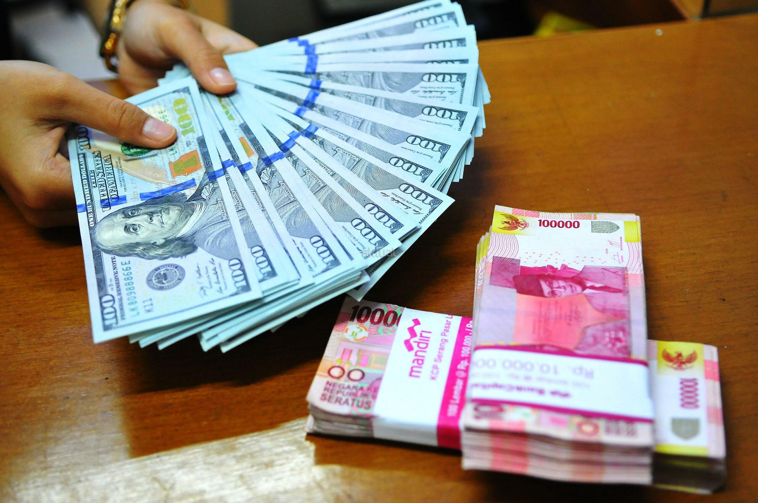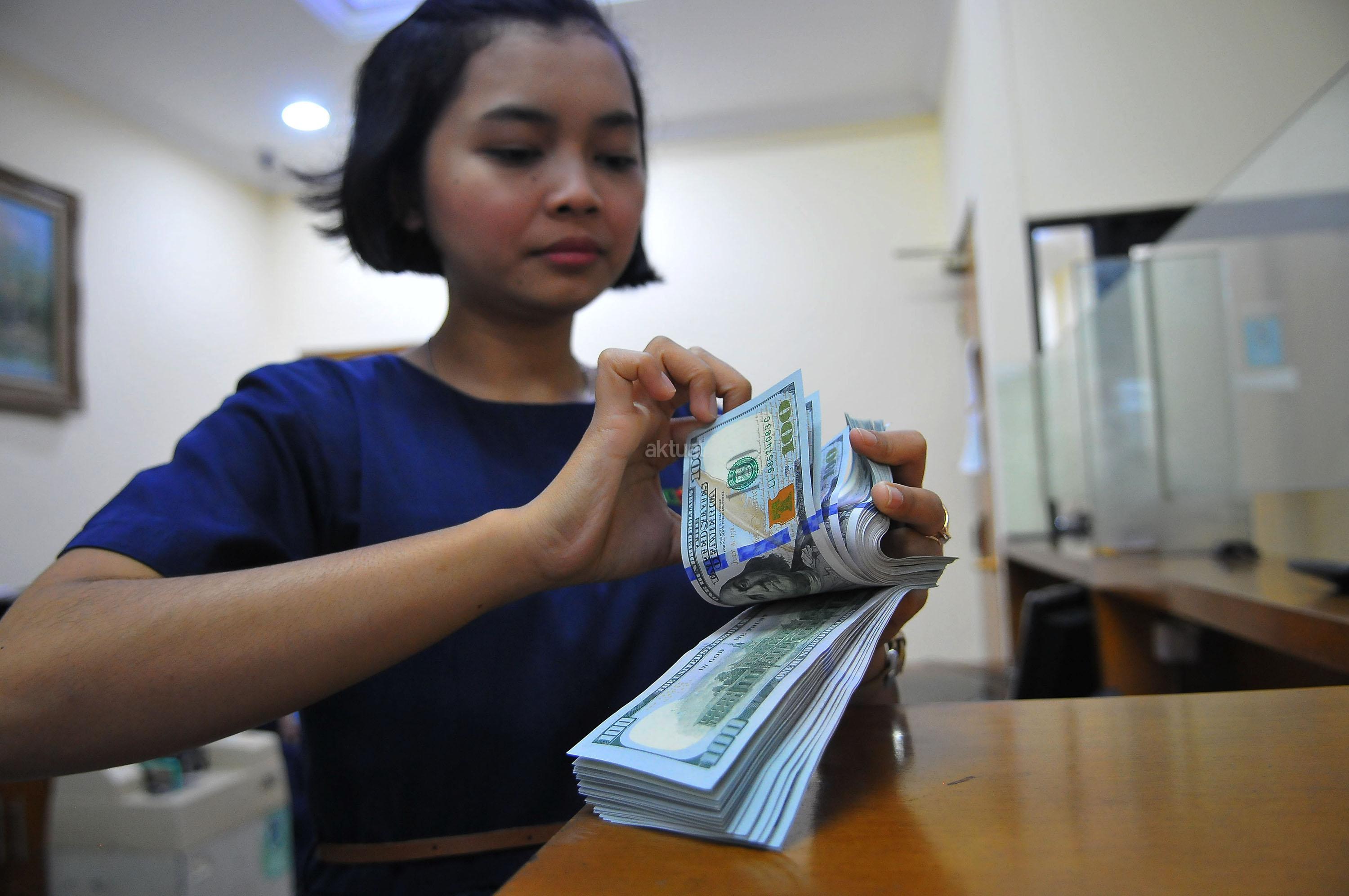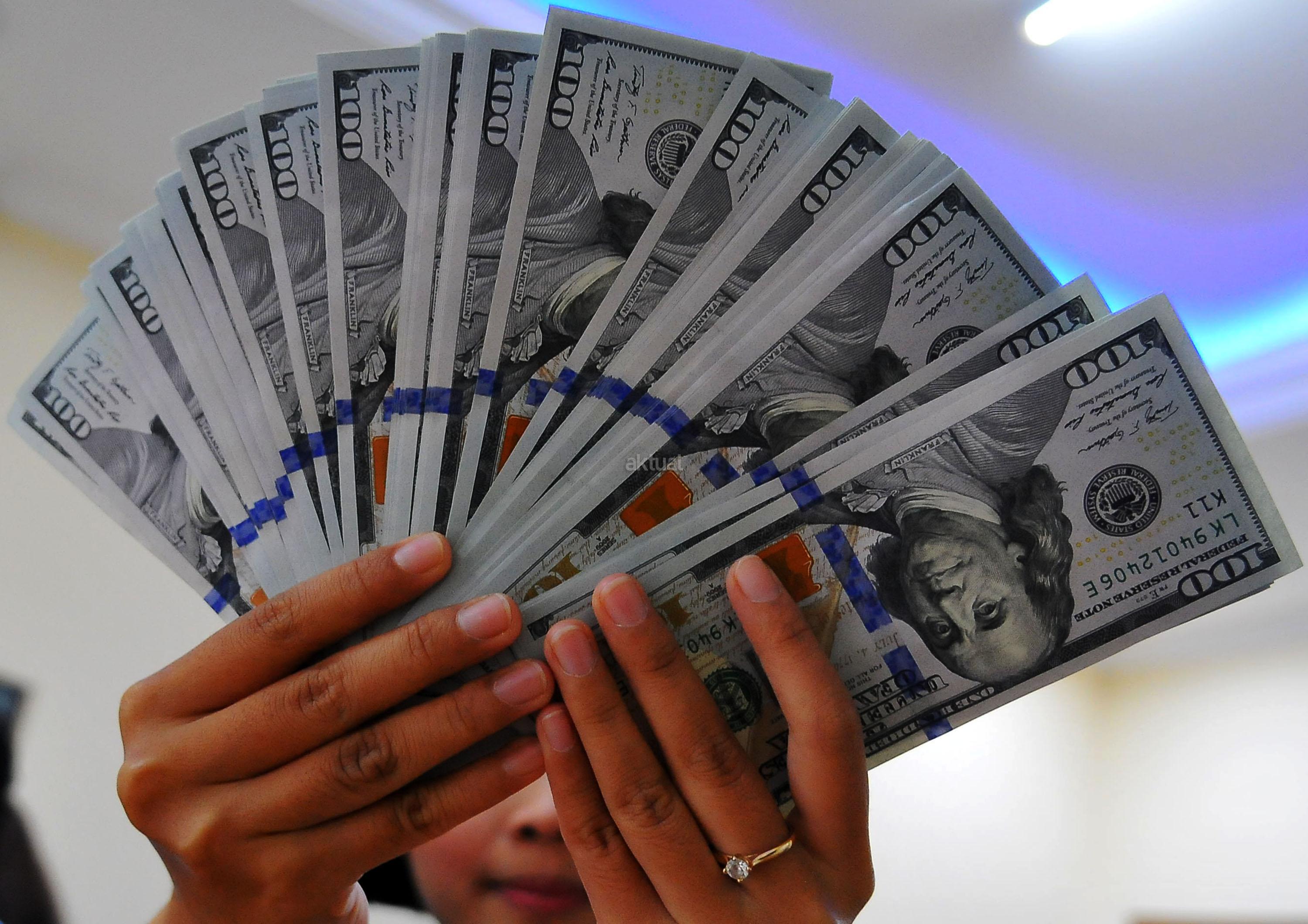 Karyawan penukaran mata uang asing menunjukkan mata uang dolar dan mata uang rupiah di penukaran uang di Jakarta, Rabu (9/11). Nilai tukar rupiah terhadap dolar Amerika Serikat (AS) pada saat jeda siang ini kian terpuruk di zona merah. Rupiah ditutup terapresiasi tipis 0,02% atau 2 poin ke level Rp13.084 per dolar AS setelah diperdagangkan pada kisaran Rp13.058 – Rp13.099 per dolar AS. AKTUAL/Tino Oktaviano