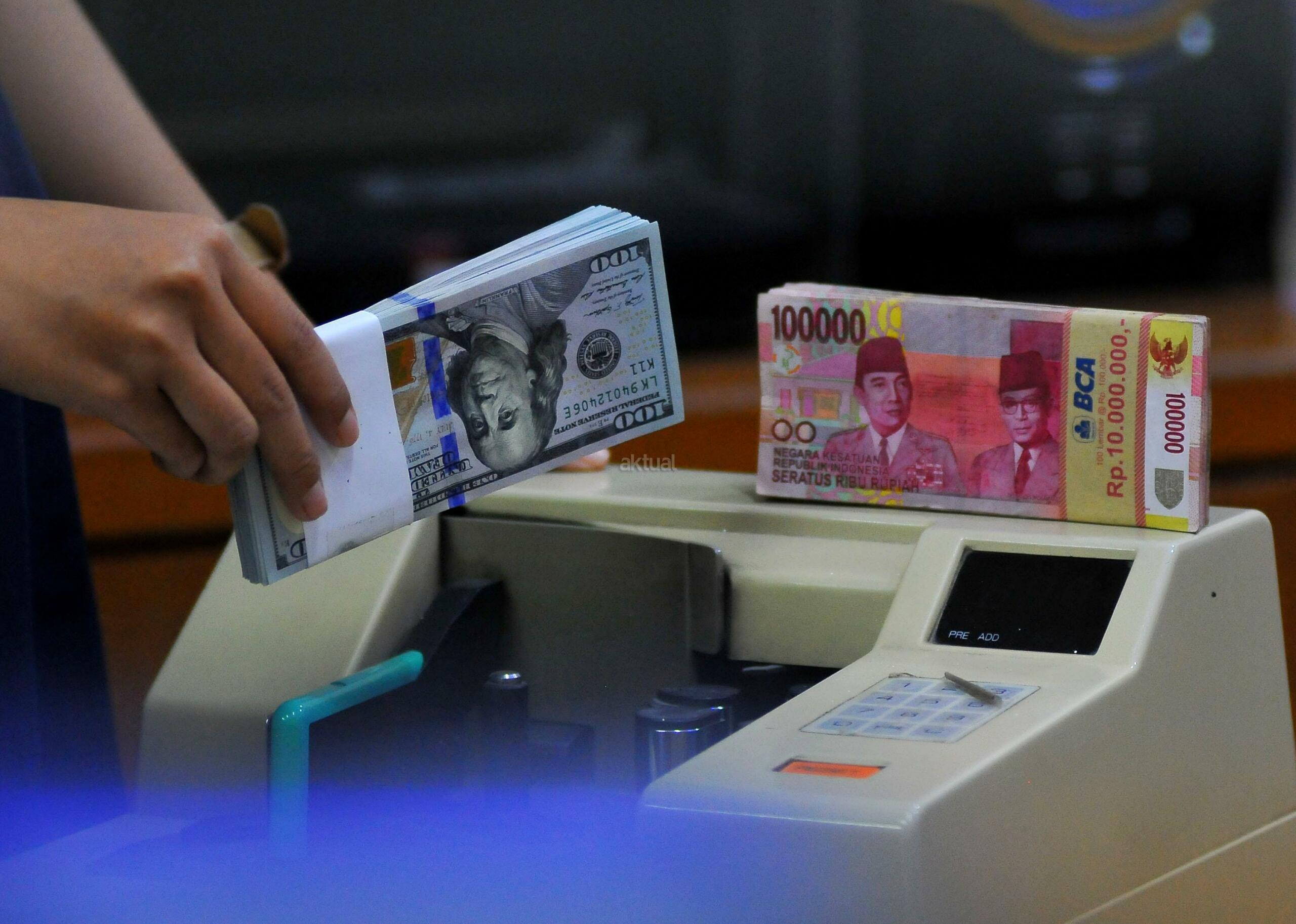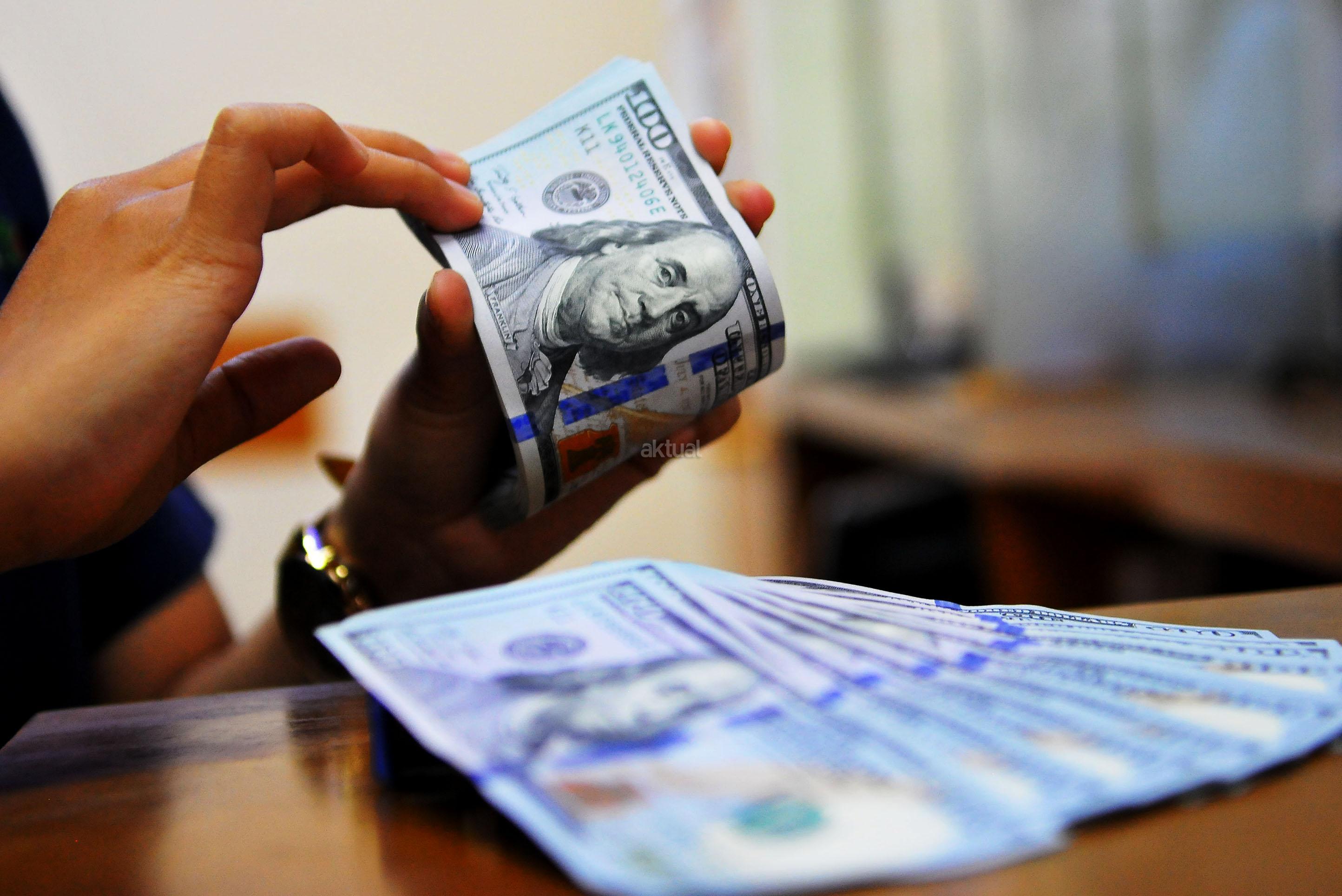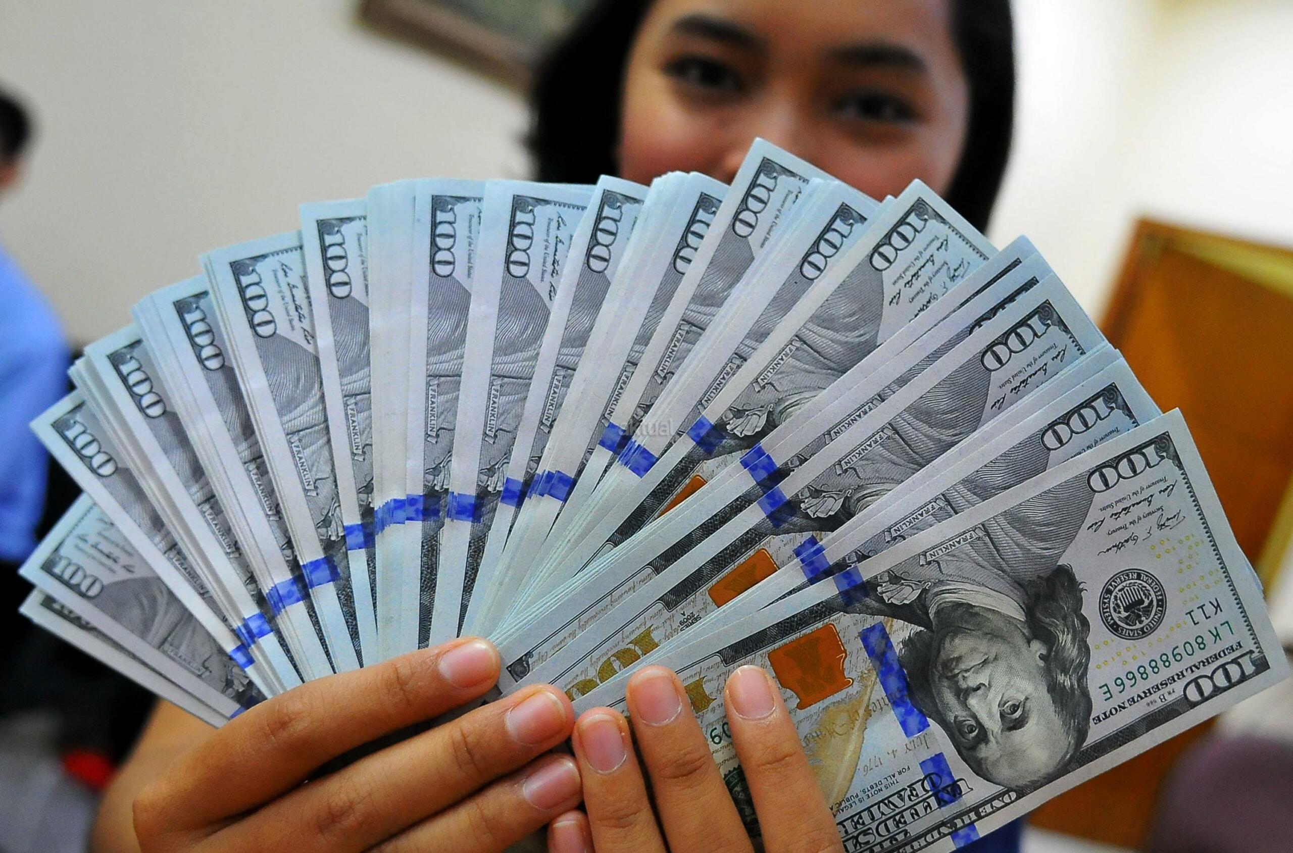 Karyawan penukaran mata uang asing menunjukkan mata uang dolar dan mata uang rupiah di penukaran uang di Jakarta, Rabu (9/11). Nilai tukar rupiah terhadap dolar Amerika Serikat (AS) pada saat jeda siang ini kian terpuruk di zona merah. Rupiah ditutup terapresiasi tipis 0,02% atau 2 poin ke level Rp13.084 per dolar AS setelah diperdagangkan pada kisaran Rp13.058 – Rp13.099 per dolar AS. AKTUAL/Tino Oktaviano