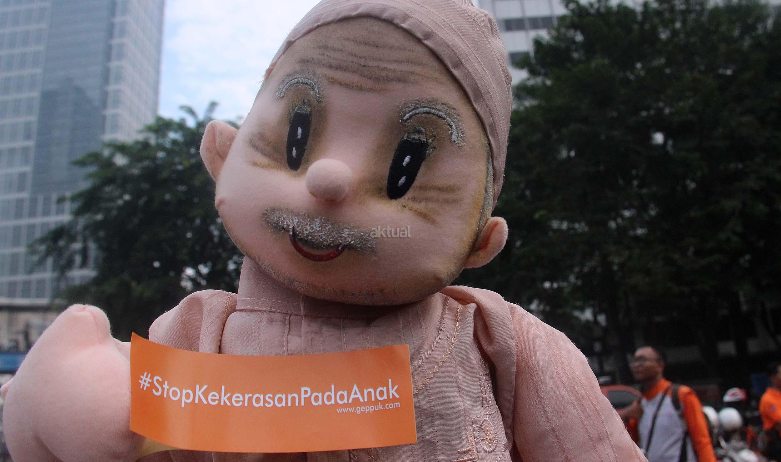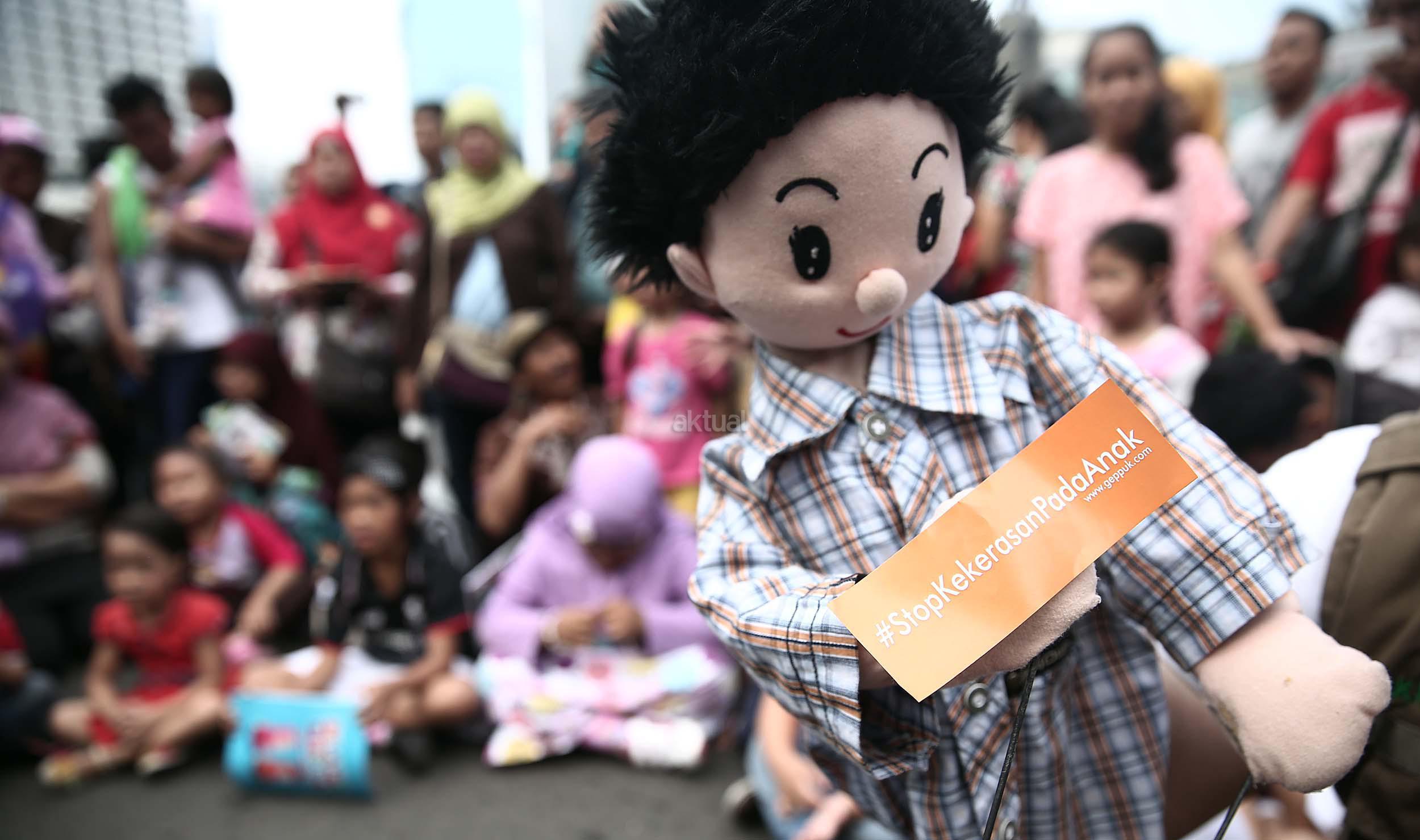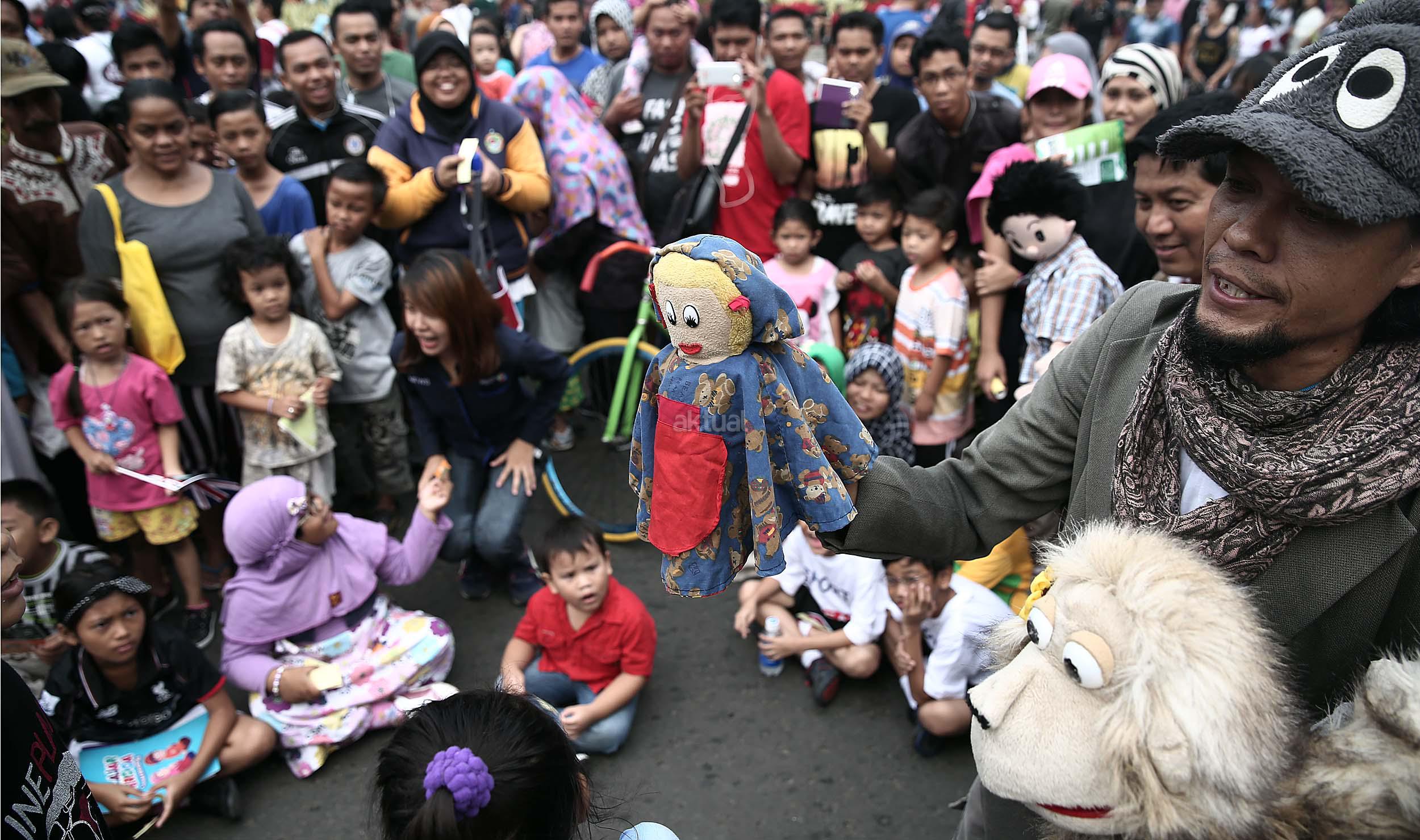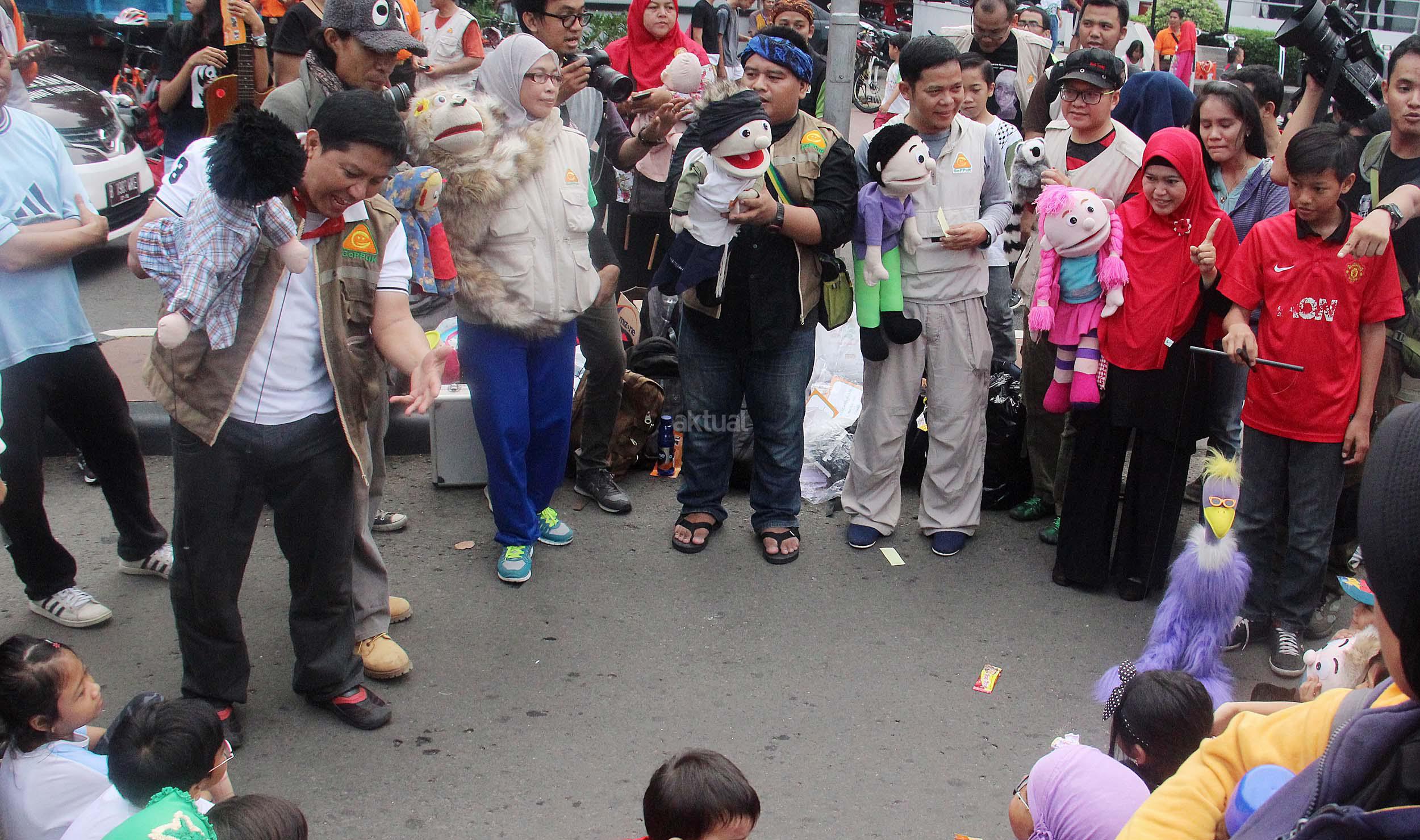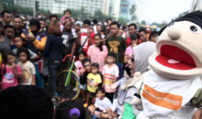 Terlihat anak-anak asyik mendengarkan dongeng dari Gerakan Para Pendongeng Untuk Kemanusiaan (Geppuk) di acara Car Free Day, Bunderan HI, Jakarta, Minggu (5/6/2016). Relawan Gerakan Para Pendongeng Untuk Kemanusiaan (Geppuk) melakukan kampanye Stop Kekerasan Pada Anak dalam cara berdongeng boneka, dongeng ventriloque, dongeng gambar, dongeng marrionette, dongeng interaktif-atraktif, dan beragam gaya mendongeng yang lainnya.