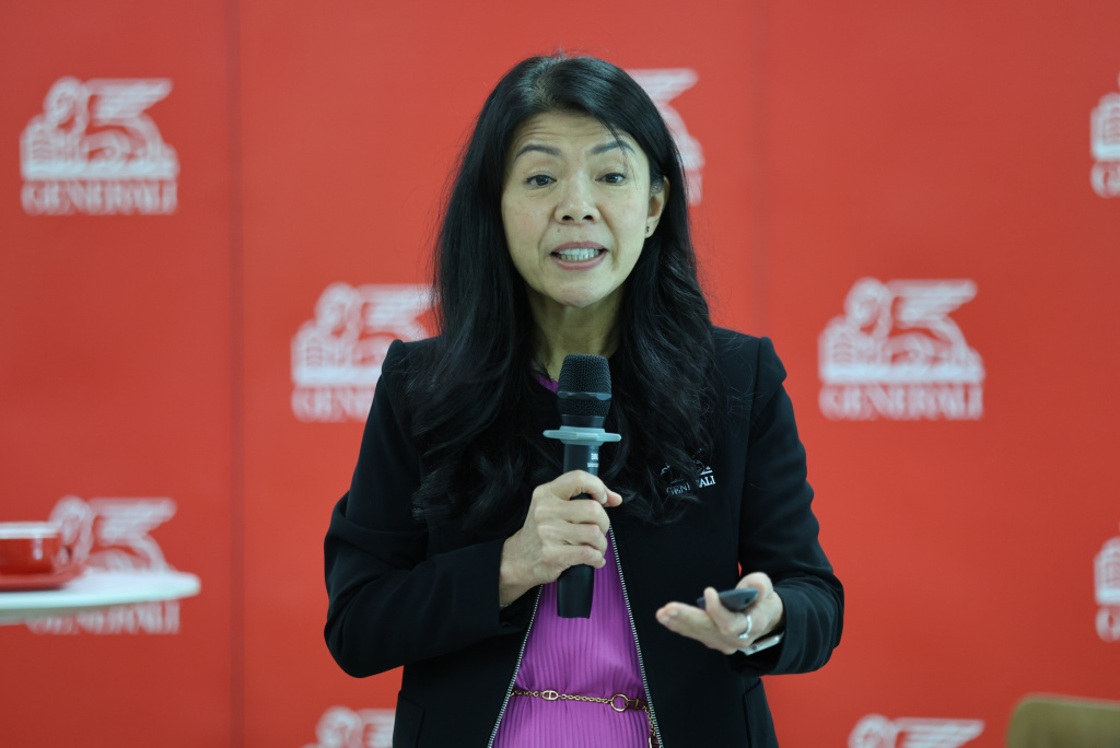 President Director & CEO Generali Indonesia, Rebecca Tan menyampaikan sambutan acara talkshow dengan tema ‘Women Leading with Impact’ yang diselenggarakan di Kantor Pusat Generali Indonesia, Jakarta, Rabu (1/4/2026).