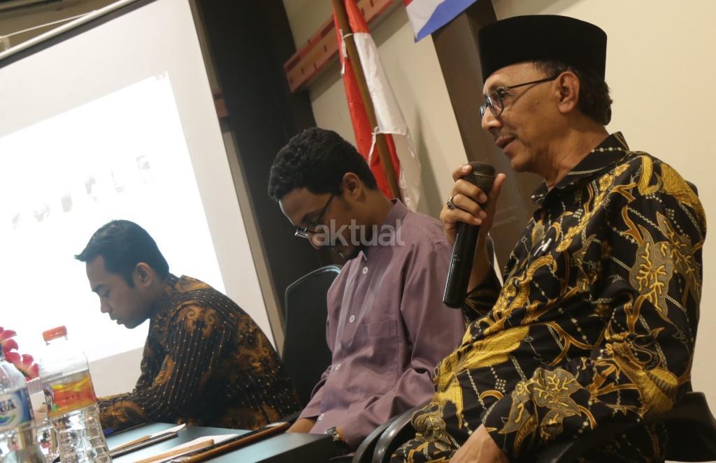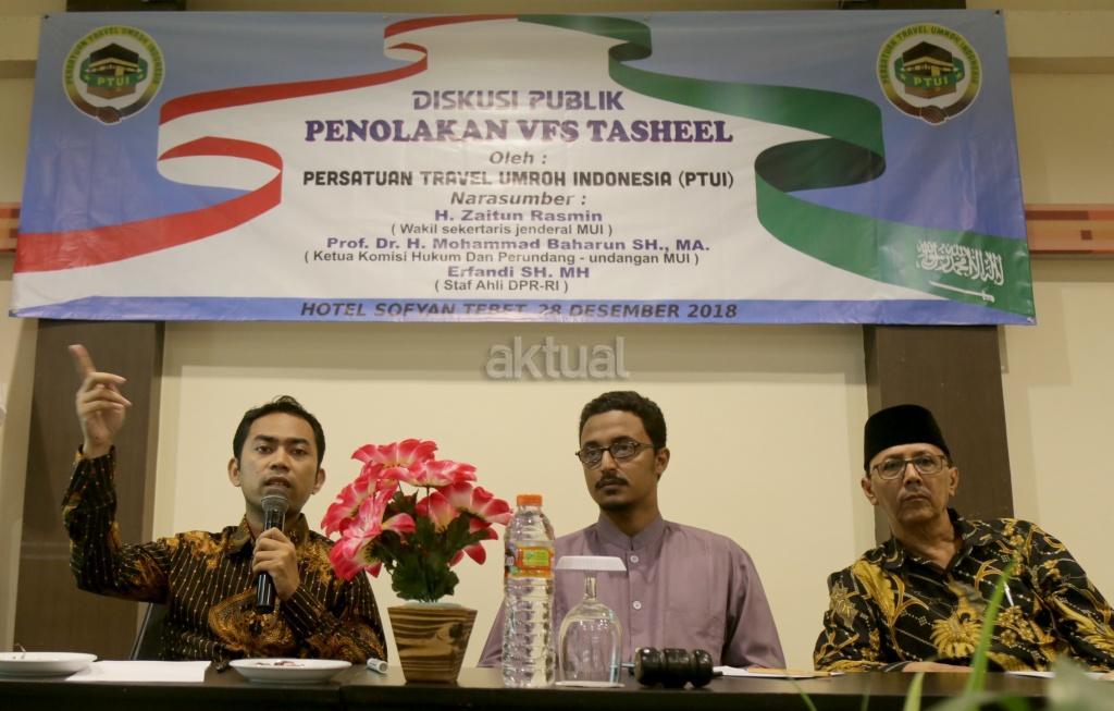 Ketua Komisi Hikum dan Perundang Undangan MUI Muhammad Baharun (kanan) dan Staf Ahli DPR RI Erfandi (kiri) saat Diskusi Penolakan VFS Tasheel di Hotel Sopyan, Jalan Soepomo, Jakarta Selatan, Jumat (28/12/2018). Dalam diskusi tersebut sejumlah pemilik travel umrah mendorong pemerintah melalui DPR untuk menolak VFS Tasheel terkait penerbitan visa haji dan umrah yang dikaitkan dengan perekaman biometrik. Agar tidak membebani calon jemaah haji, Indonesia meminta agar Pemerintah Saudi Arabia tidak menerapkan kebijakan tersebut. AKTUAL/Tino Oktaviano