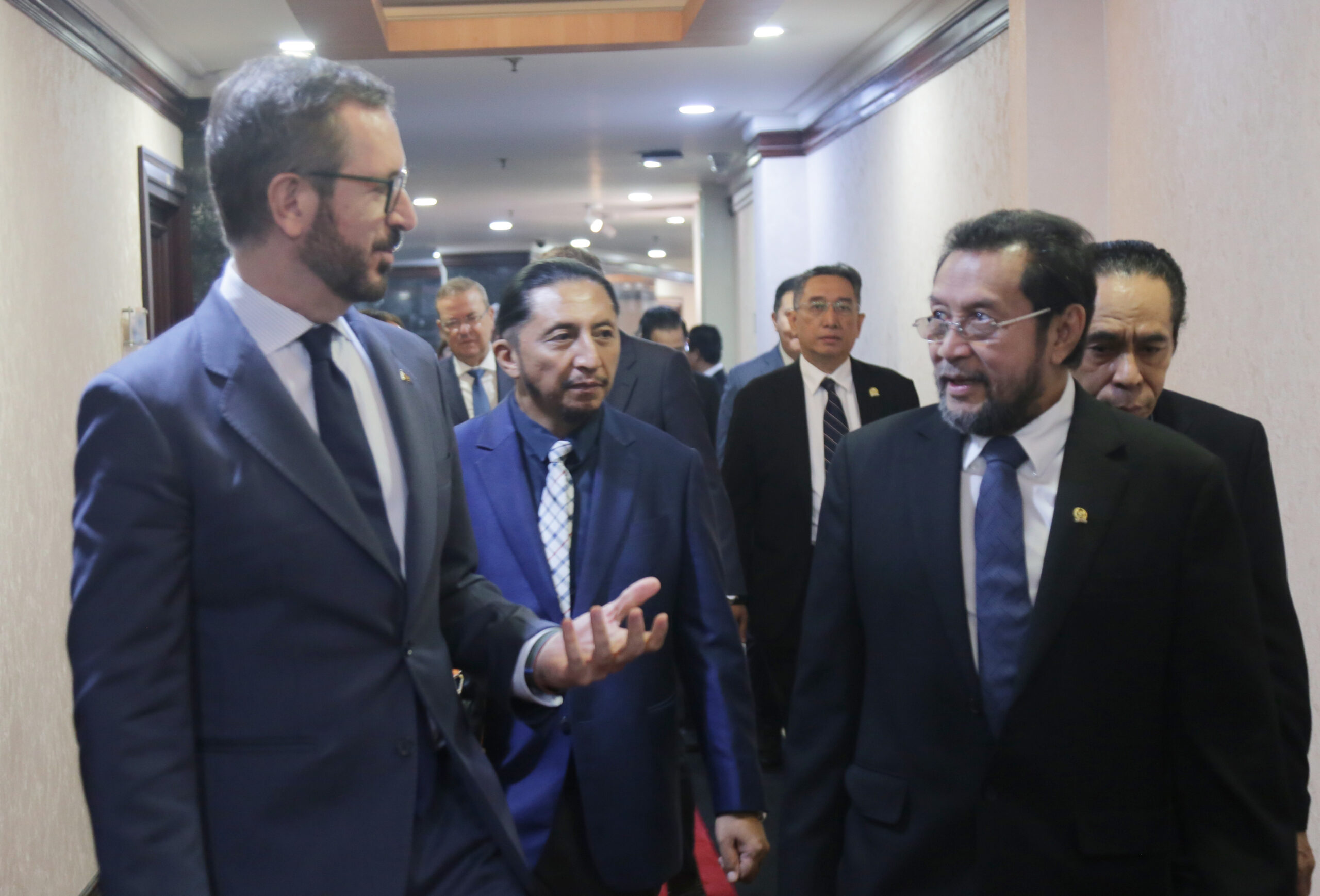 Wakil Ketua DPD RI Yorris Raweyai (kanan) berbincang dengan Delegasi Senator Spanyol yang dipimpin Javier Maroto Aranzabal saat akan melakukan pertemuan di ruang Delegasi DPD RI, Senayan, Jakarta, Jumat (20/6/2025).