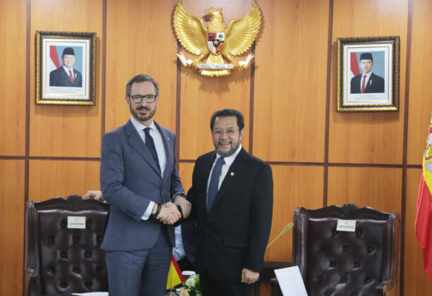 Wakil Ketua DPD RI Yorris Raweyai (kanan) bersalaman dengan Delegasi Senator Spanyol yang dipimpin Javier Maroto Aranzabal di ruang Delegasi DPD RI, Senayan, Jakarta, Jumat (20/6/2025).