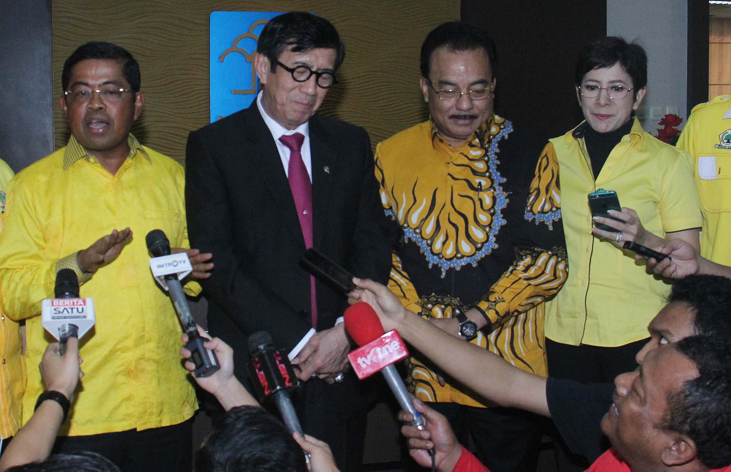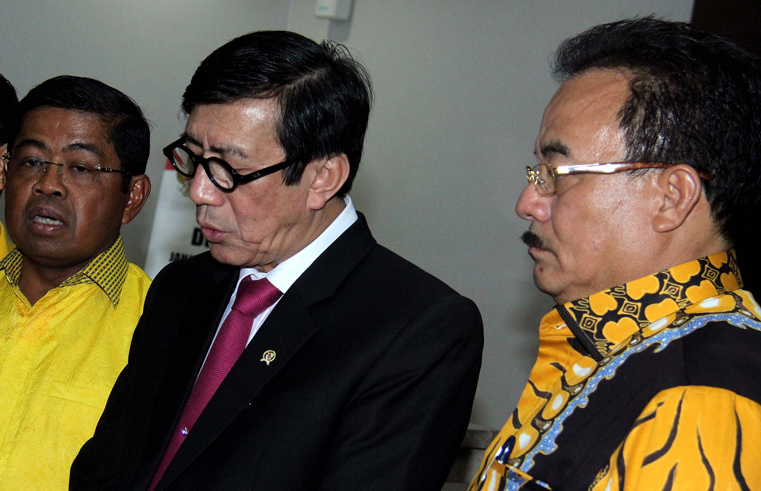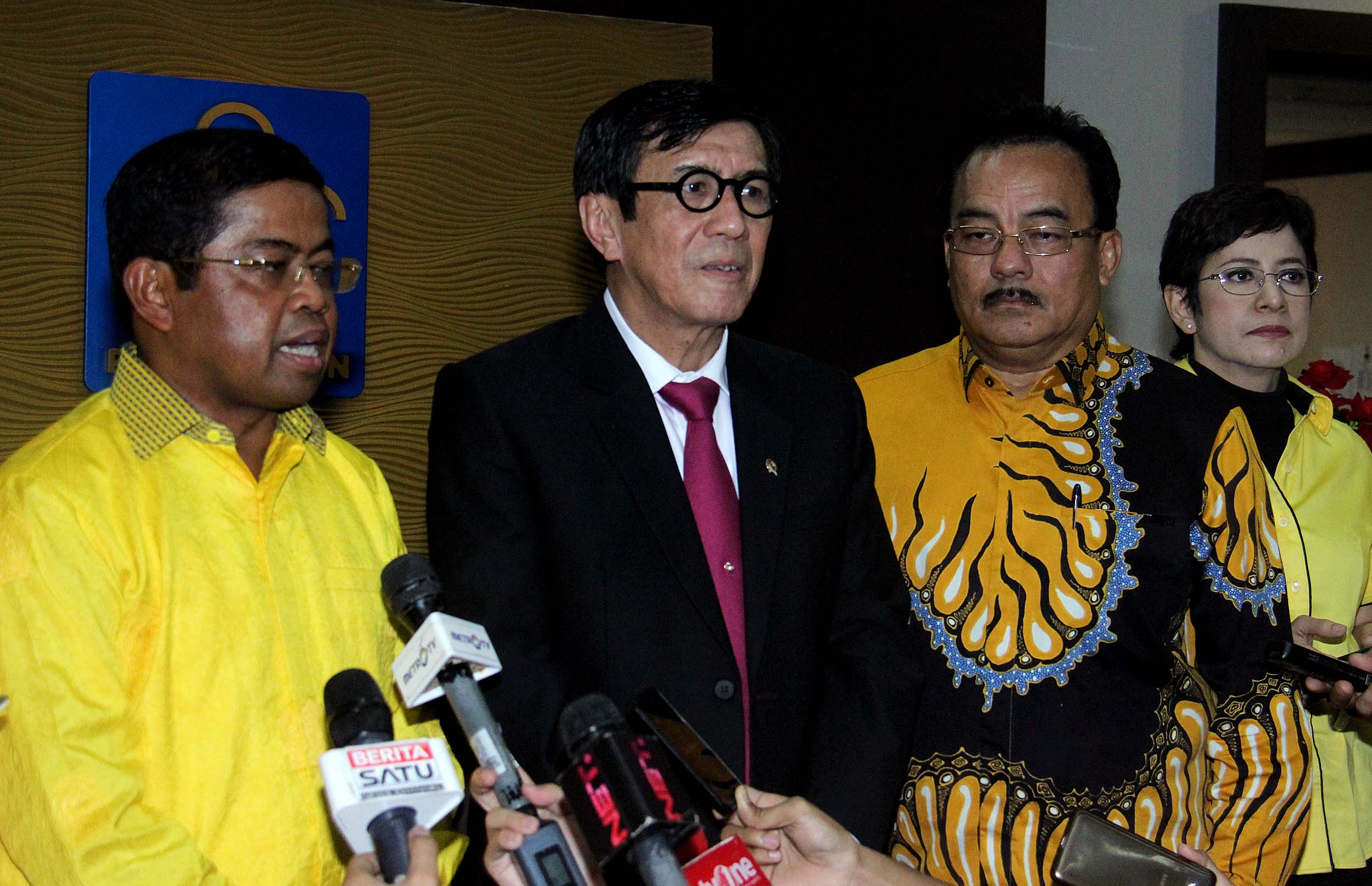 Kiri-kanan ; Sekjen Partai Golkar Idrus Marham, Menkumham Yasonna Hamonangan Laoly, Bendahara Umum DPP Partai Golkar Robert Kardinal saat jumpa pers di kantor Kemenkumham, Jakarta, Selasa (28/6/2016). Dewan Pimpinan Pusat (DPP) Partai Golkar mendaftarkan kepengurusan hasil Musyawarah Nasional Luar Biasa (Munaslub) ke Kementerian Hukum dan HAM (Kemenkumham).