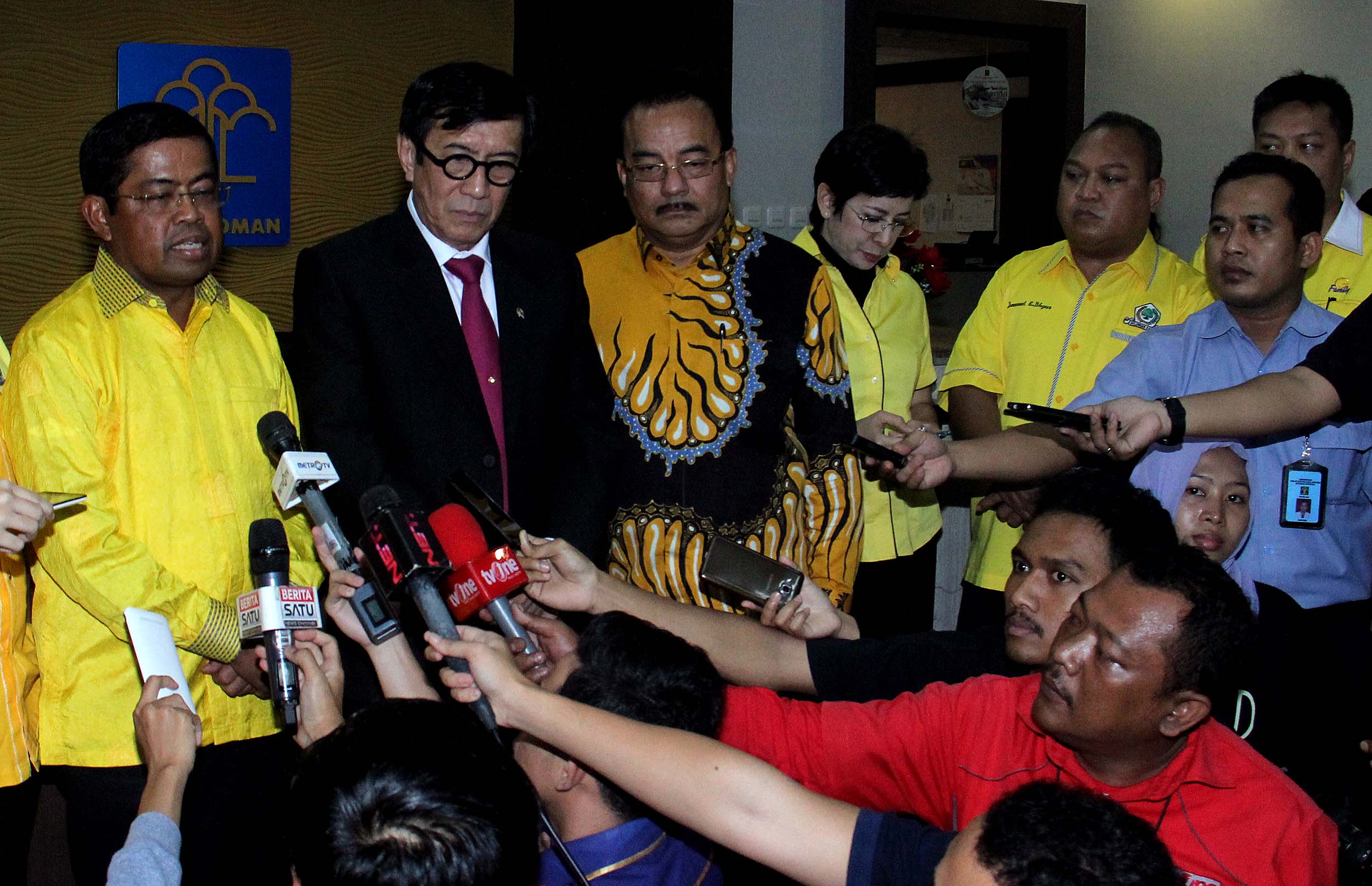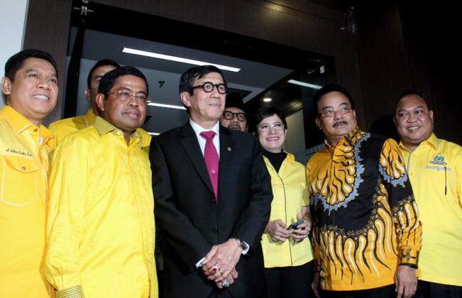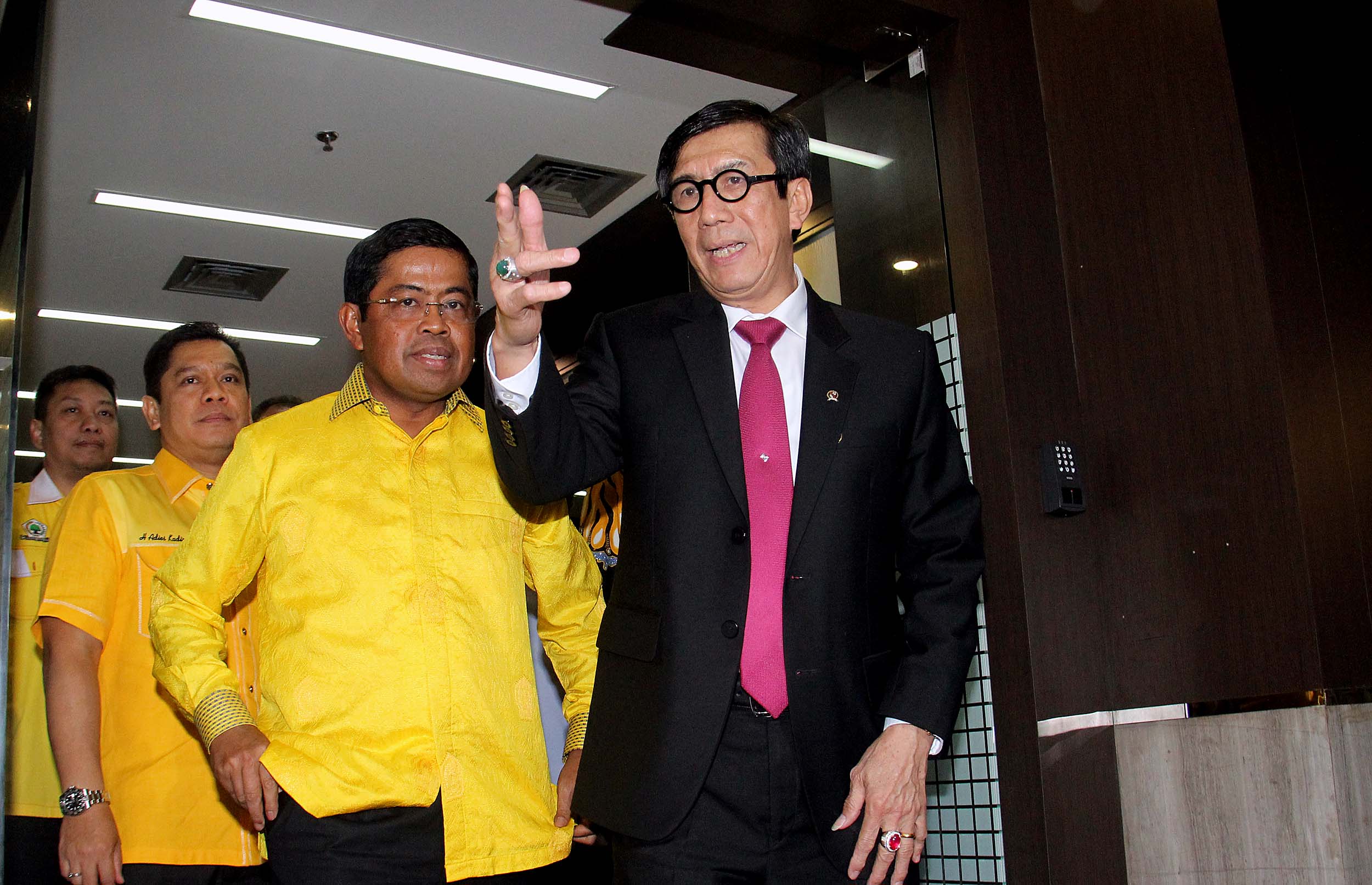 Kiri-kanan ; Sekjen Partai Golkar Idrus Marham, Menkumham Yasonna Hamonangan Laoly, Bendahara Umum DPP Partai Golkar Robert Kardinal saat jumpa pers di kantor Kemenkumham, Jakarta, Selasa (28/6/2016). Dewan Pimpinan Pusat (DPP) Partai Golkar mendaftarkan kepengurusan hasil Musyawarah Nasional Luar Biasa (Munaslub) ke Kementerian Hukum dan HAM (Kemenkumham).