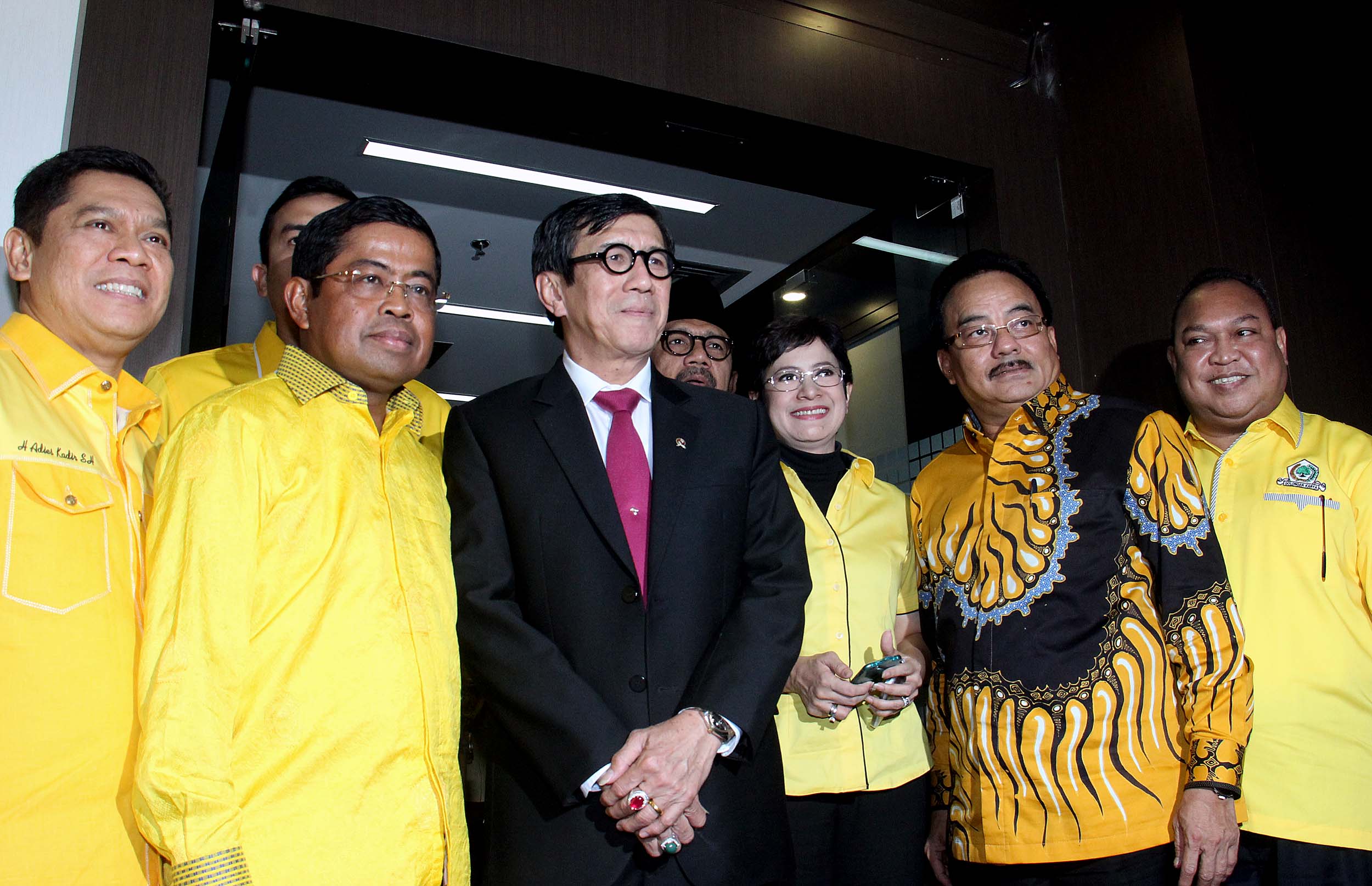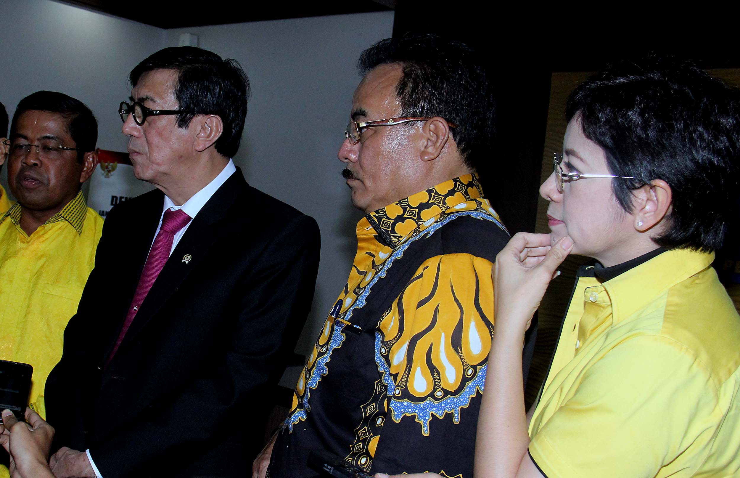 Kiri-kanan ; Sekjen Partai Golkar Idrus Marham, Menkumham Yasonna Hamonangan Laoly, Bendahara Umum DPP Partai Golkar Robert Kardinal, Kabid Media dan Penggalangan Opini Partai Golkar Nurul Arifin saat jumpa pers di kantor Kemenkumham, Jakarta, Selasa (28/6/2016). Dewan Pimpinan Pusat (DPP) Partai Golkar mendaftarkan kepengurusan hasil Musyawarah Nasional Luar Biasa (Munaslub) ke Kementerian Hukum dan HAM (Kemenkumham).