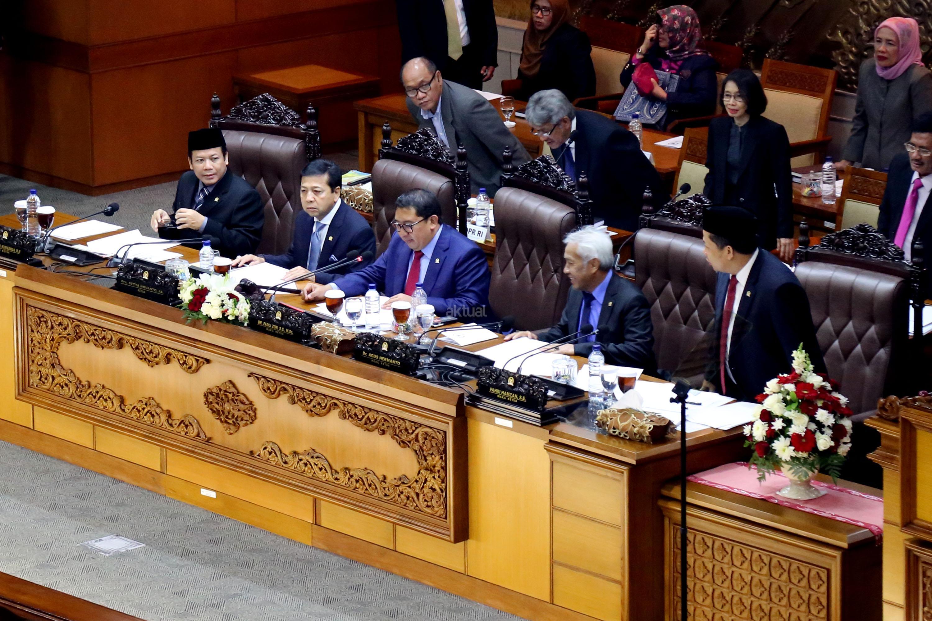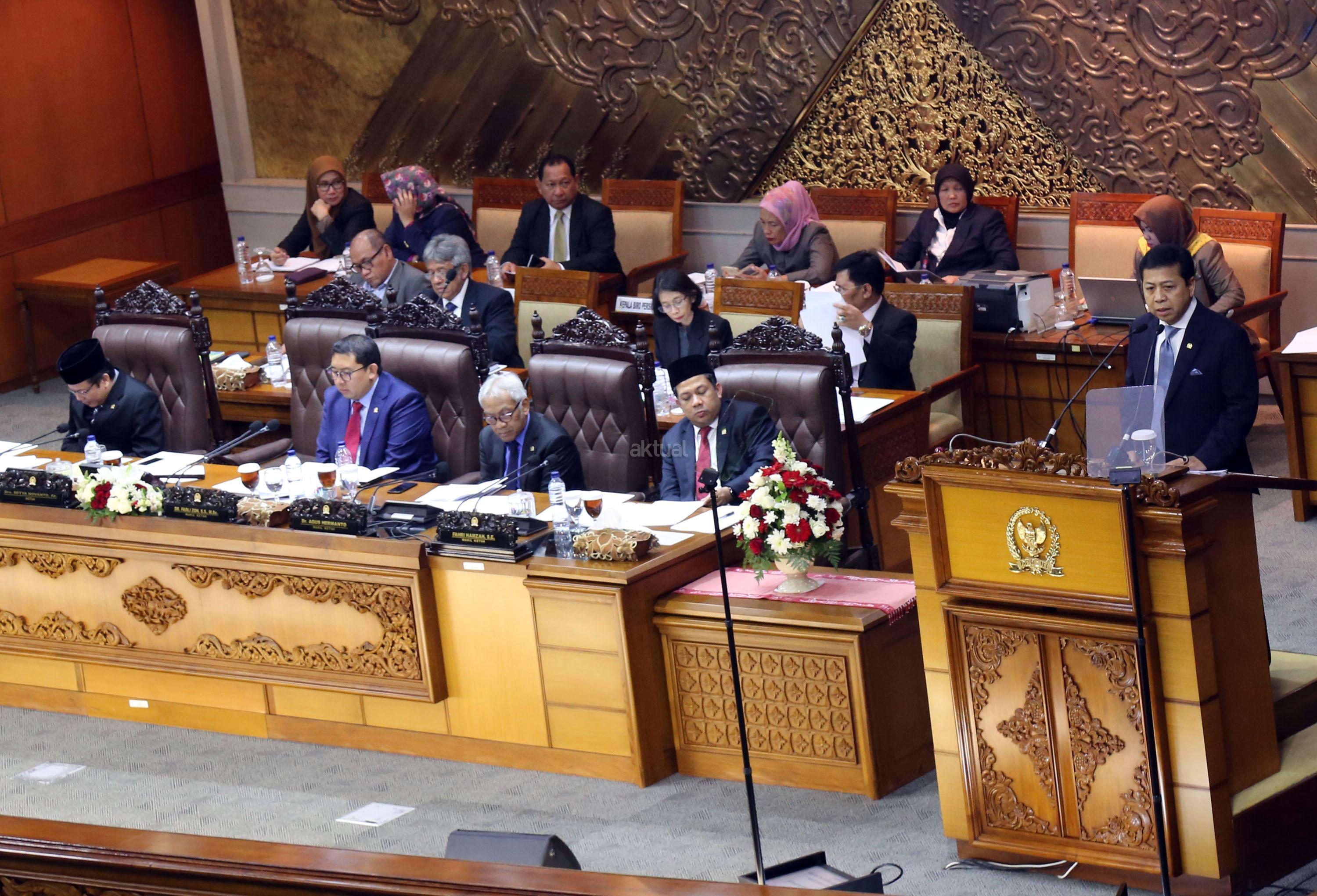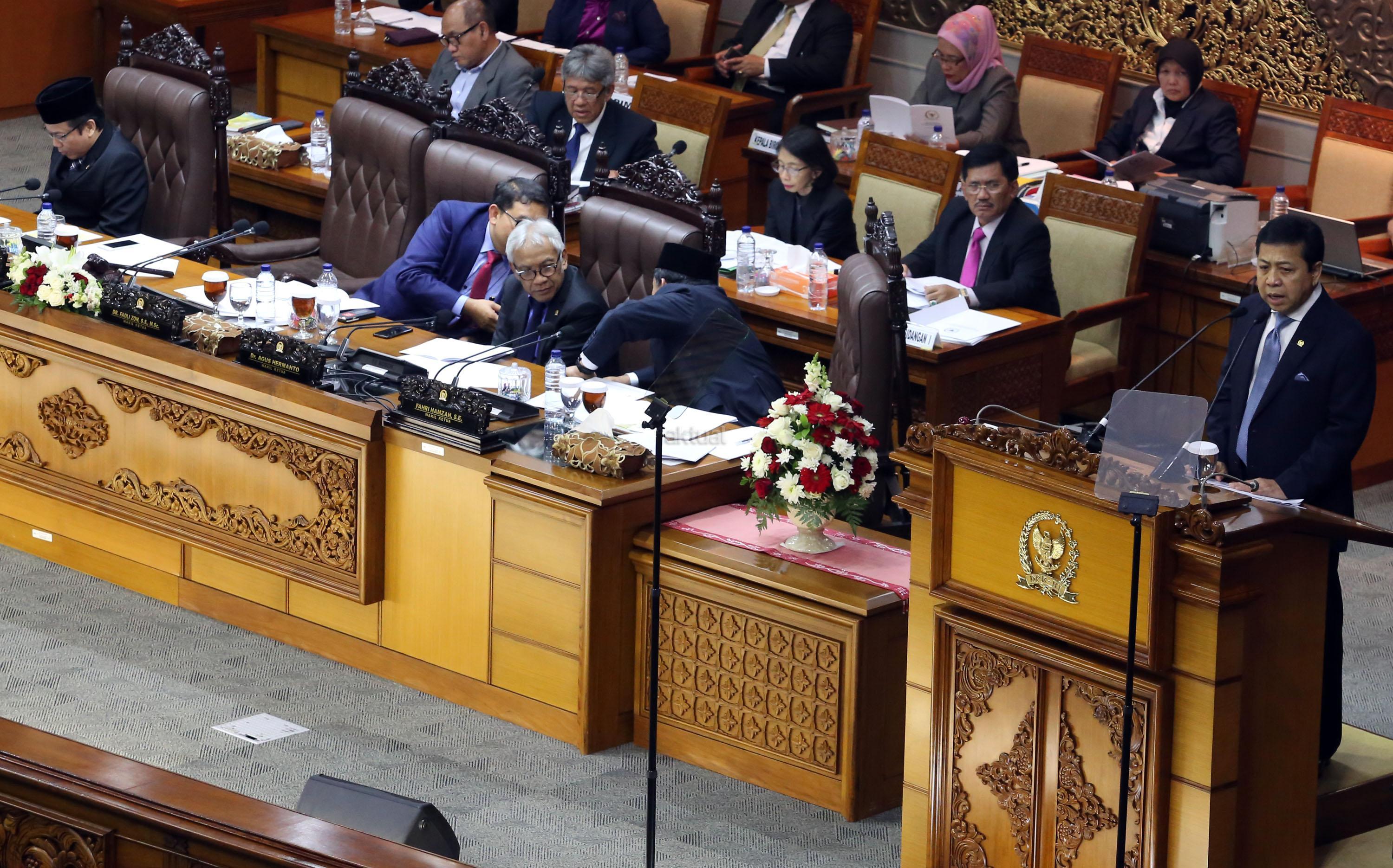 Dewan Perwakilan Rakyat (DPR) menggelar rapat paripurna sekaligus membuka masa persidangan III tahun sidang 2016-2017. Rapat Paripurna yang dipimpin oleh Ketua DPR Setya Novanto didampingi Wakil Ketua DPR Fadli Zon, Agus Hermanto, Taufik Kurniawan dan Fahri Hamzah ini dihadiri oleh 377 anggota dari seluruh fraksi di gedung Parlemen, Jakarta, Selasa (10/1/2017). DPR menetapkan Prolegnas RUU Prioritas Tahun 2017. Hasilnya, sekitar 50 RUU masuk dalam prolegnas 2017. Dengan rincian, 32 RUU dari DPR, 15 RUU berasal dari pemerintah dan 3 lainnya dari DPD. Serta pelantikan beberapa anggota baru atau PAW. AKTUAL/Tino Oktaviano