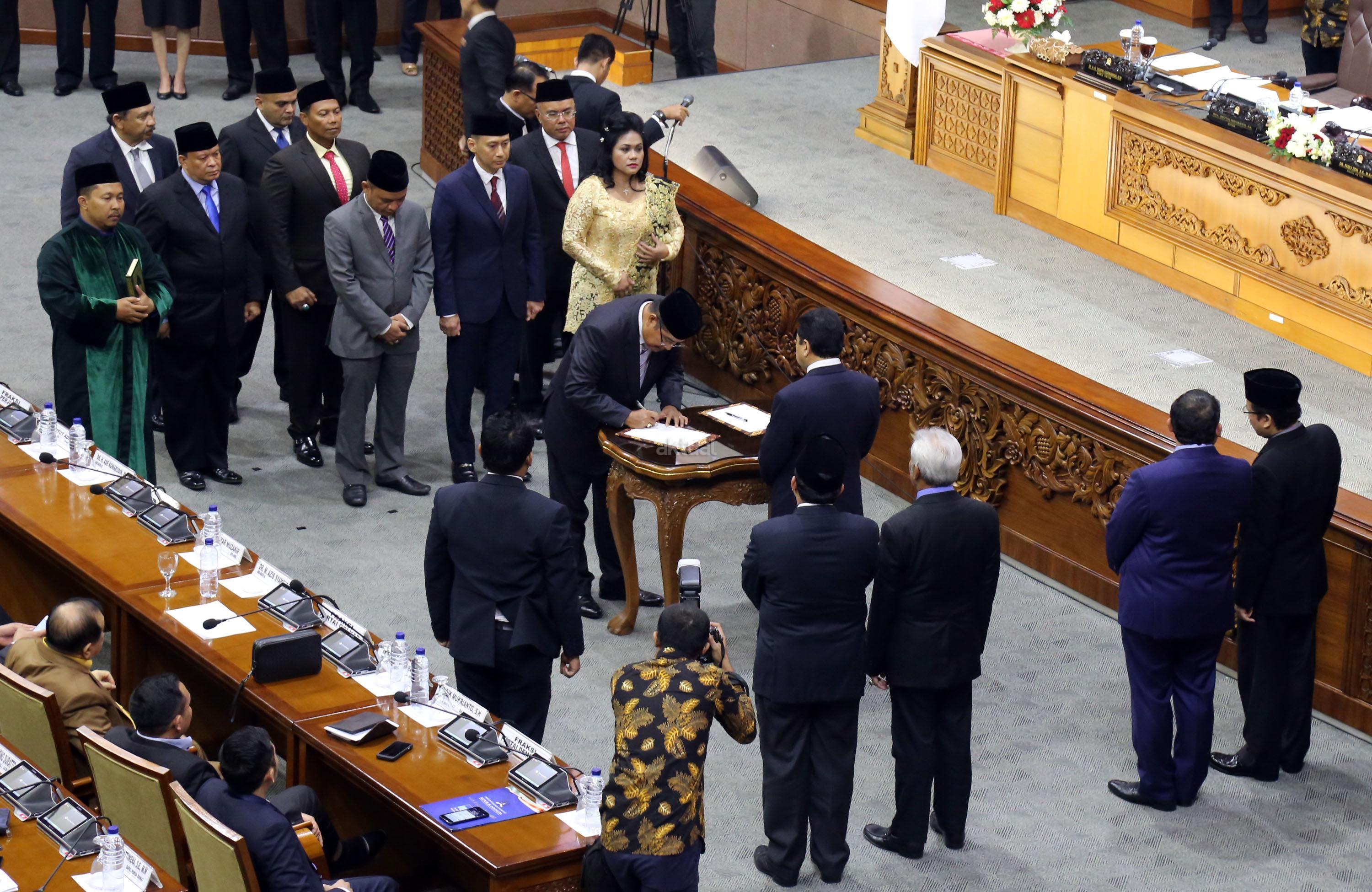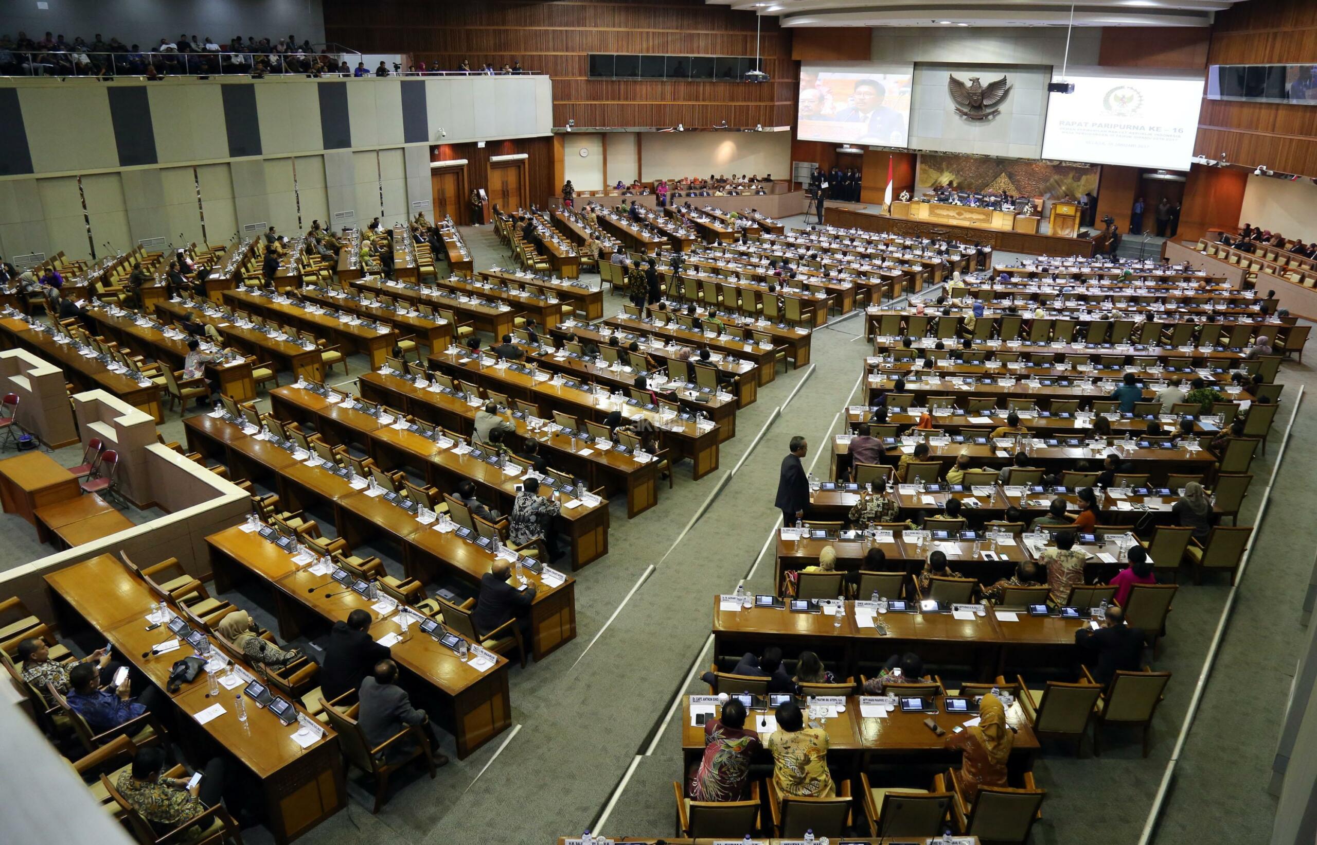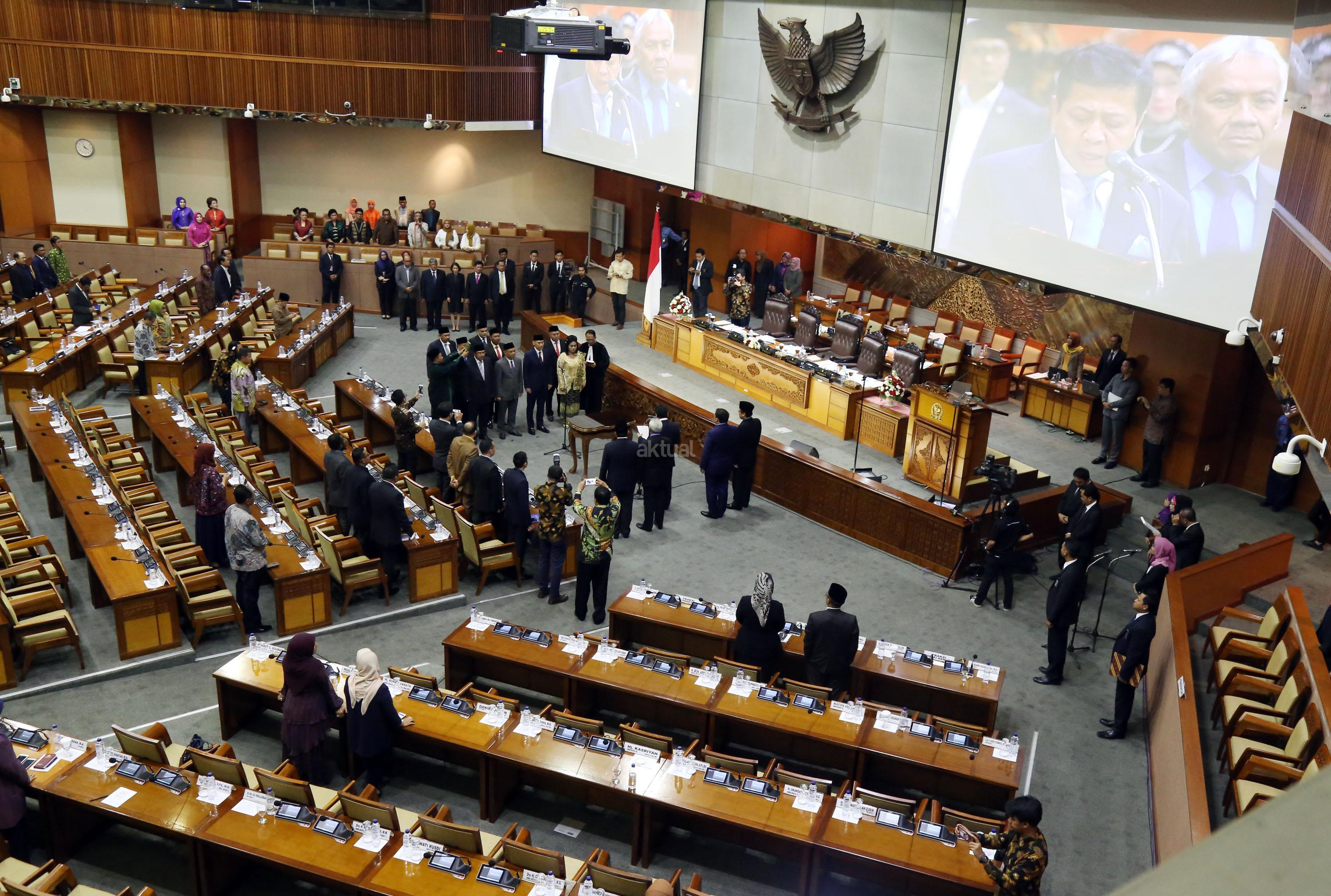 Dewan Perwakilan Rakyat (DPR) menggelar rapat paripurna sekaligus membuka masa persidangan III tahun sidang 2016-2017. Rapat Paripurna yang dipimpin oleh Ketua DPR Setya Novanto didampingi Wakil Ketua DPR Fadli Zon, Agus Hermanto, Taufik Kurniawan dan Fahri Hamzah ini dihadiri oleh 377 anggota dari seluruh fraksi di gedung Parlemen, Jakarta, Selasa (10/1/2017). DPR menetapkan Prolegnas RUU Prioritas Tahun 2017. Hasilnya, sekitar 50 RUU masuk dalam prolegnas 2017. Dengan rincian, 32 RUU dari DPR, 15 RUU berasal dari pemerintah dan 3 lainnya dari DPD. Serta pelantikan beberapa anggota baru atau PAW. AKTUAL/Tino Oktaviano