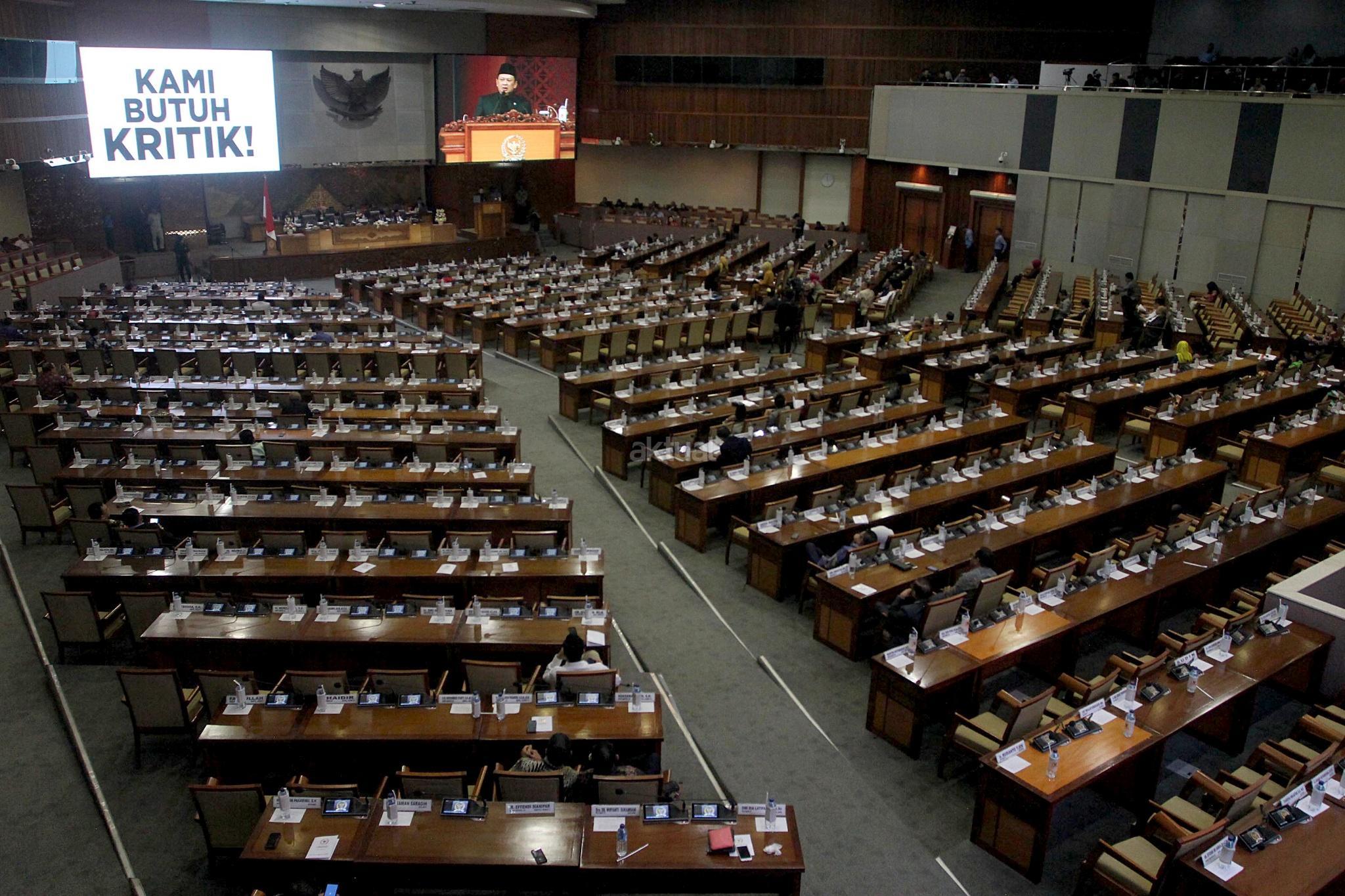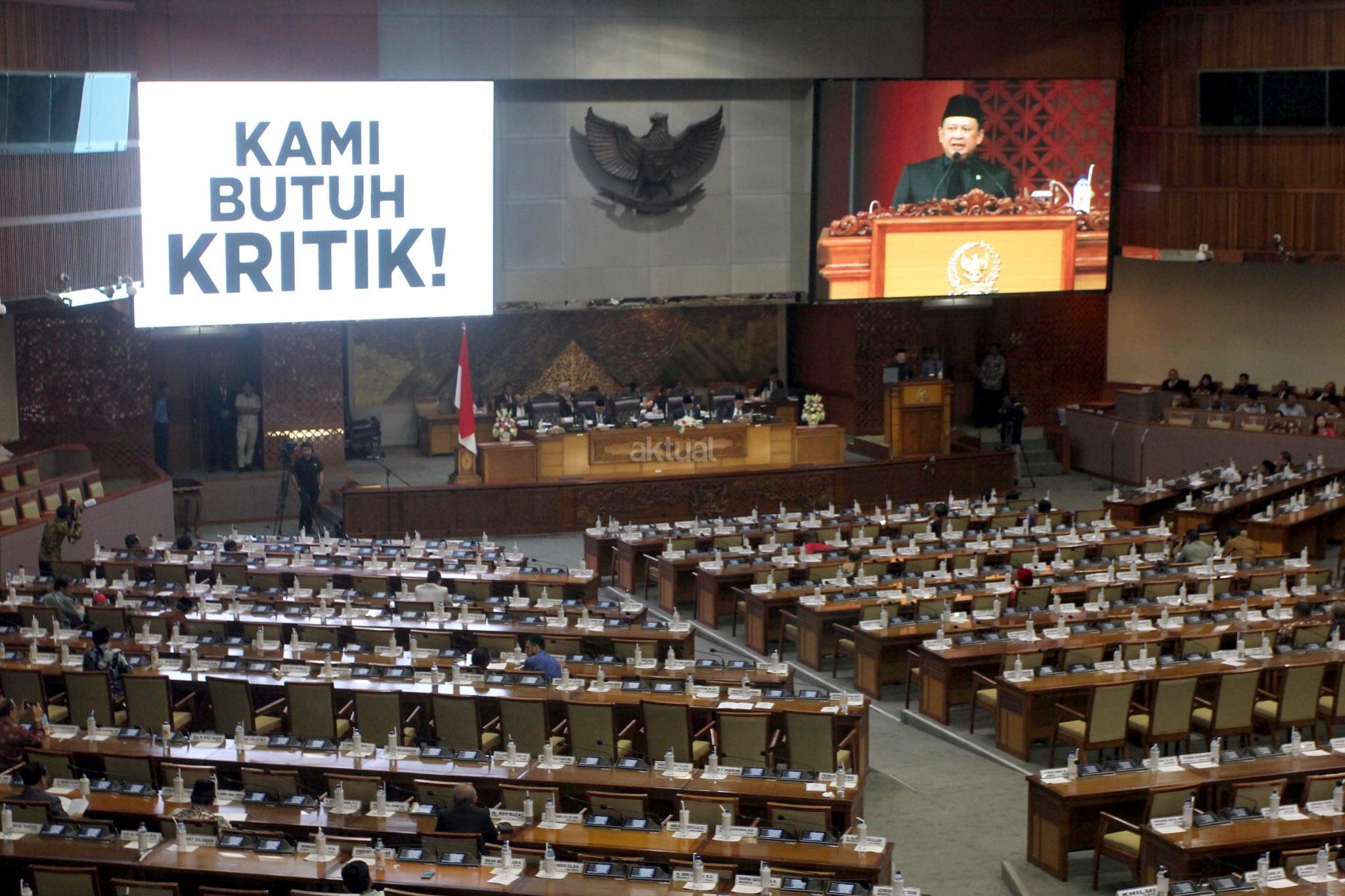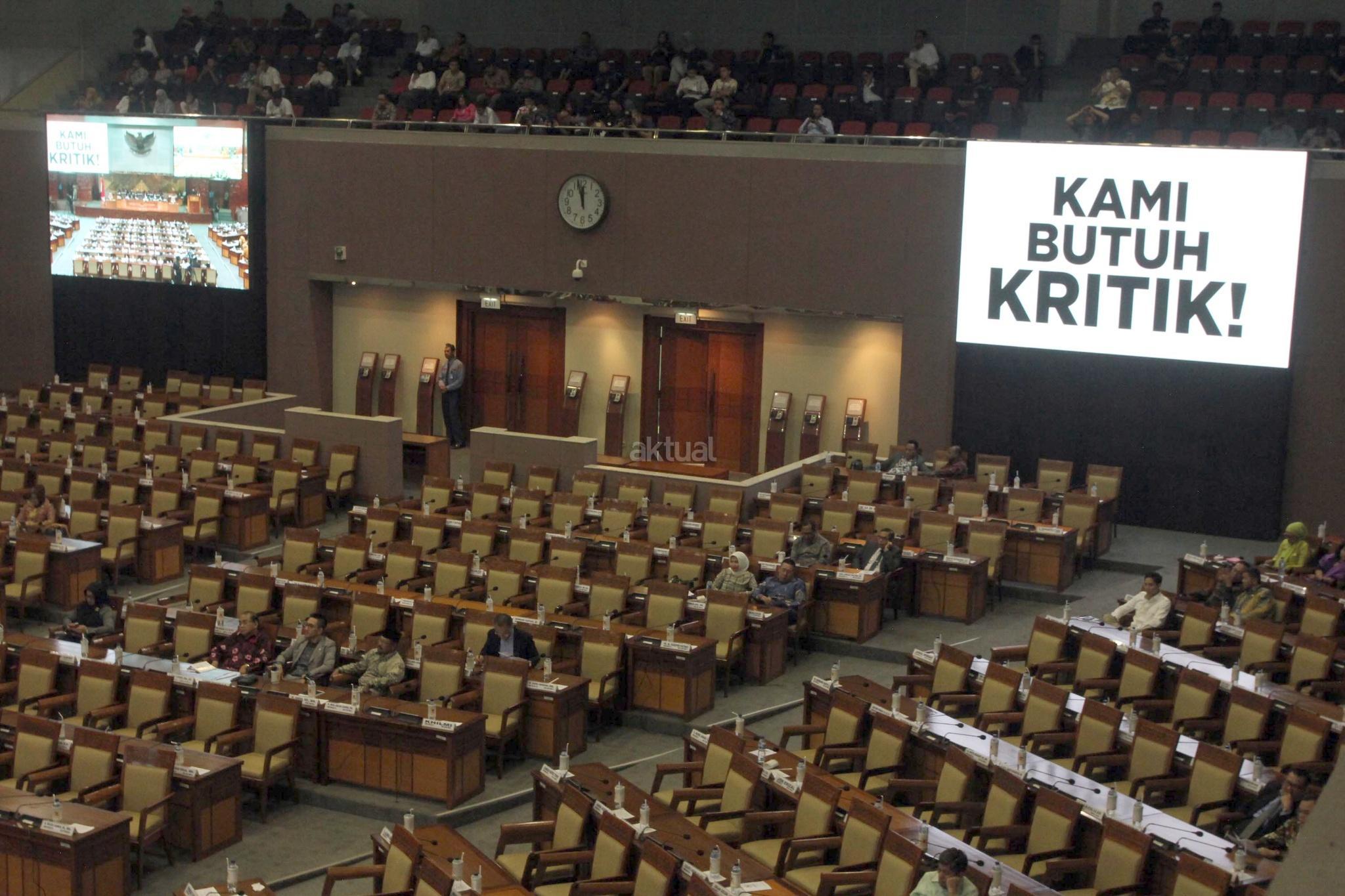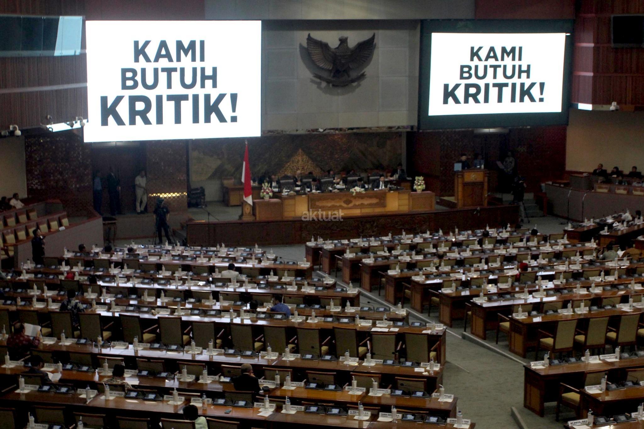 Tulisan raksasa “Kami Butuh Kritik” memenuhi layar LCD di ruang Rapat Paripurna, Gedung Nusanatara II, Kompleks Parlemen, Jakarta, Rabu (14/2), saat Ketua DPR Bambang Soesatyo, menyampaikan pidato pada Rapat Paripurna penutupan masa sidang. Tulisan raksasa ini diklaim sebagai bantahan atas kesan Oligarki DPR dan anti kritik yang akan diciptakan DPR terkait Hak imunitas dalamn Pasal 254 pada UU MD3 yang telah disahkan DPR. AKTUAL/Tino Oktaviano