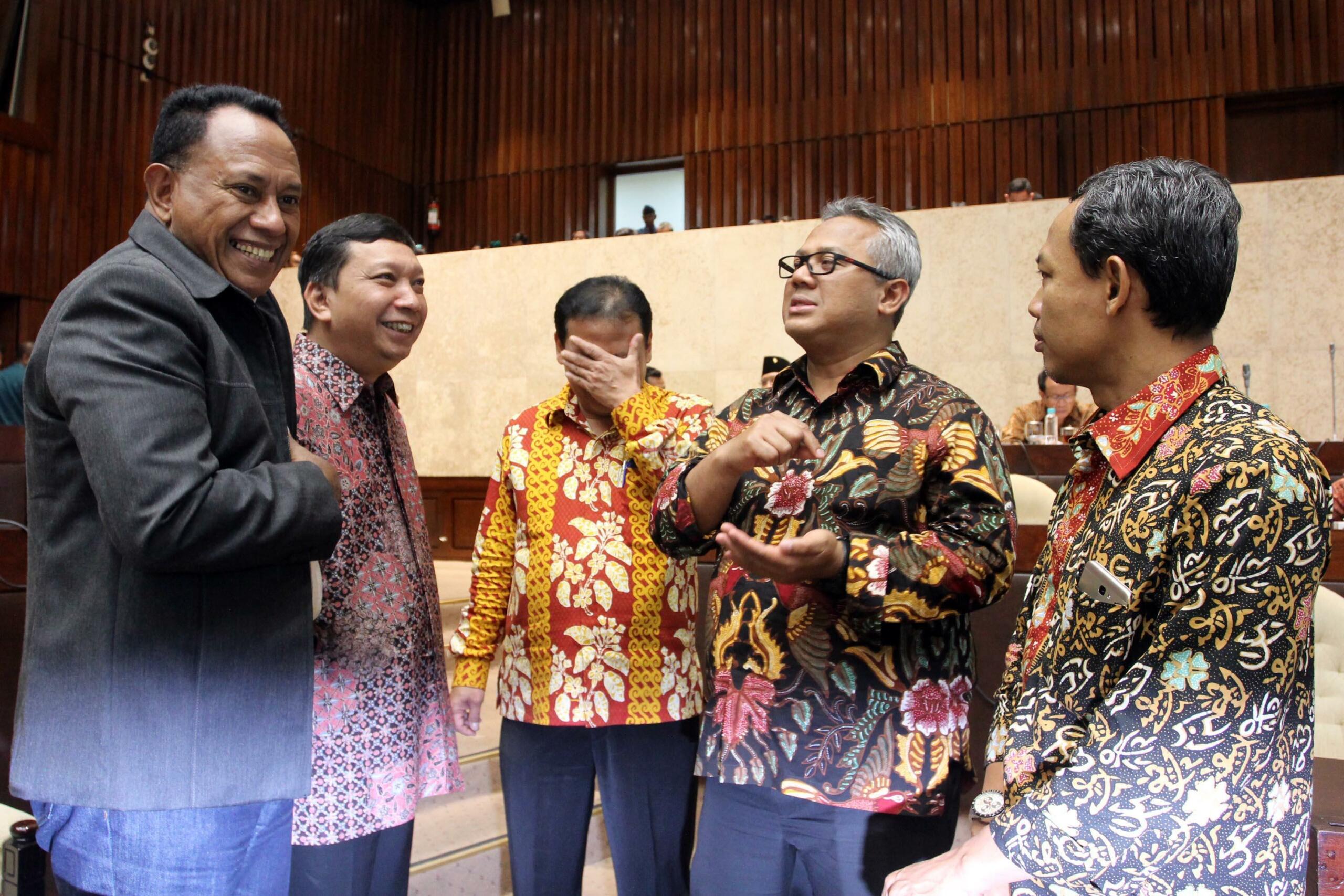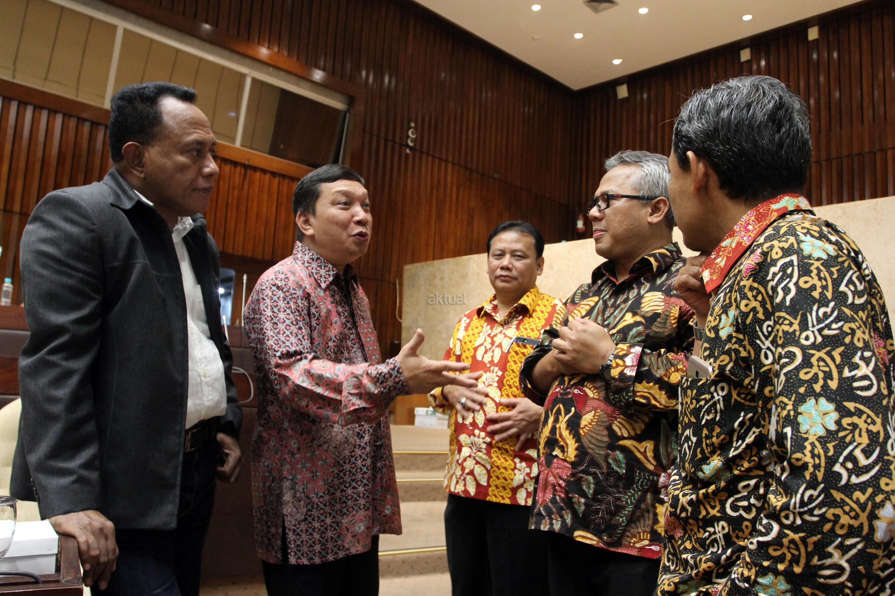 (dari kiri) Anggota Komisi II DPR Fraksi PDIP Komarudin Watubun Tanawani Mora, Wakil Ketua Komisi II dari Fraksi Demokrat Fandi Utomo, Ketua Bawaslu Abhan, Ketua KPU Arief Budiman dan Komisioner KPU Pramono Ubaid Tanthowi, berbincang sebelum mengikuti Rapat Dengar Pendapat (RDP) dengan Komisi II DPR, di Gedung Nusantara, Kompleks Parlemen, Senayan, Jakarta, Senin (9/4). Rapat tersebut membahas sejumlah Peraturan Komisi Pemilihan Umum (PKPU) diantaranya soal cuti Kampanye Presiden 2019, Dana Kampanye 2019 dan pelaksanaan Pilkada serentak sejumlah Daerah 2018. AKTUAL/Tino Oktaviano