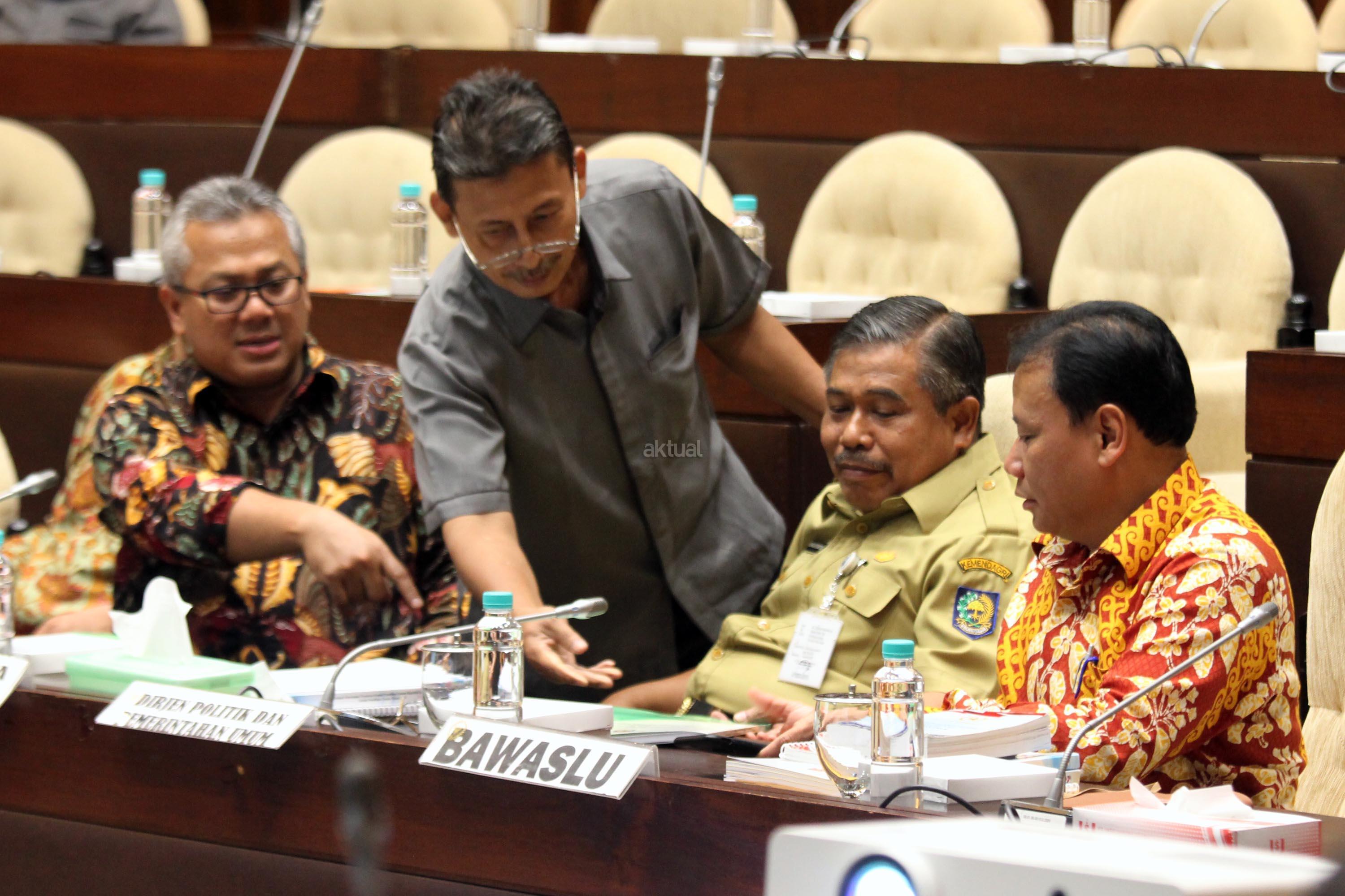 Ketua KPU Arief Budiman (kiri), Ketua Bawaslu Abhan (kanan) dan Staf Ahli Menteri Dalam Negeri Bidang Pemerintahan Suhajar Diantoro (kedua dari kanan) mengikuti Rapat Dengar Pendapat (RDP) dengan Komisi II DPR, di Gedung Nusantara, Kompleks Parlemen, Senayan, Jakarta, Senin (9/4). Rapat tersebut membahas sejumlah Peraturan Komisi Pemilihan Umum (PKPU) diantaranya soal cuti Kampanye Presiden 2019, Dana Kampanye 2019 dan pelaksanaan Pilkada serentak sejumlah Daerah 2018. AKTUAL/Tino Oktaviano