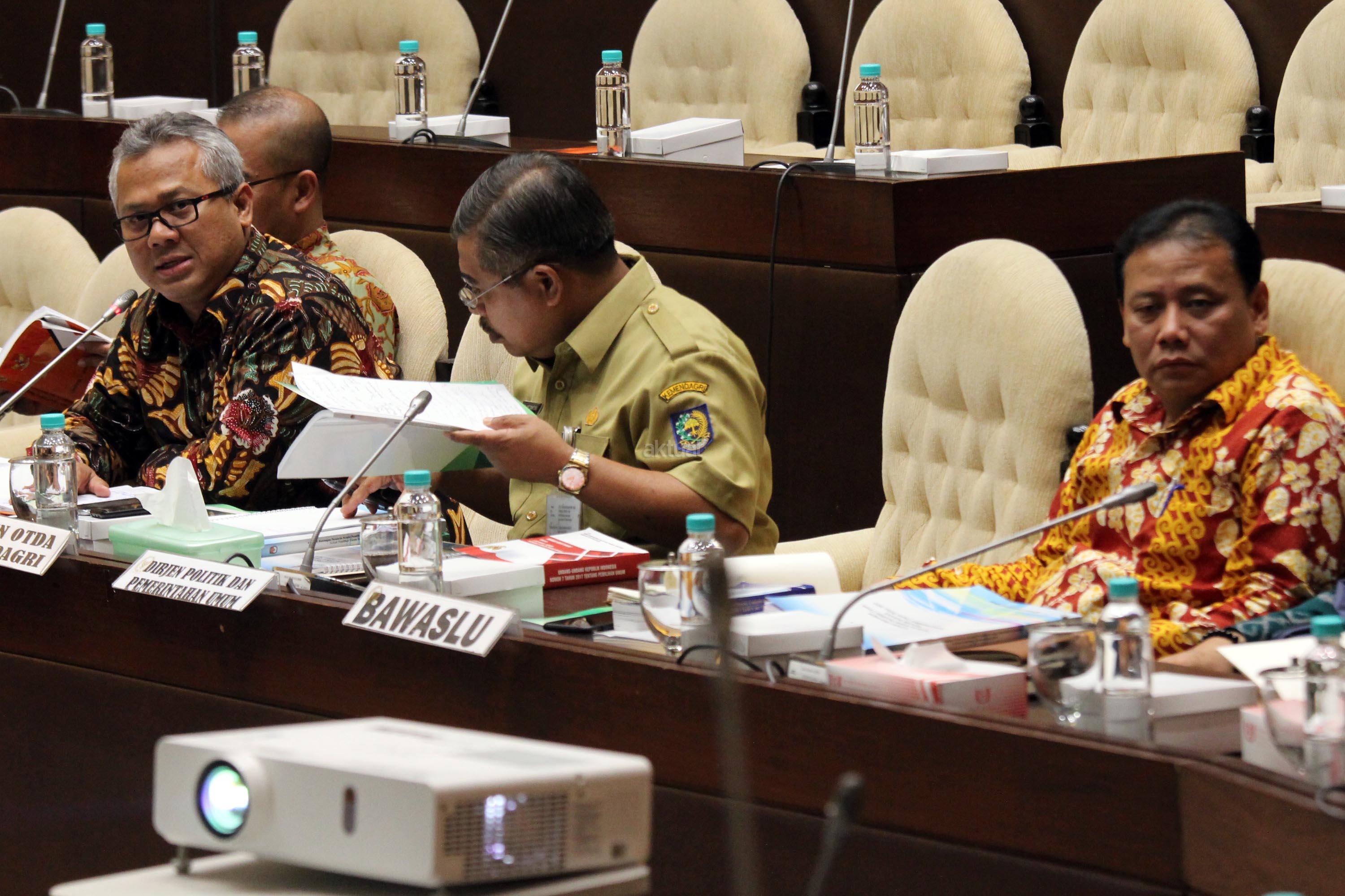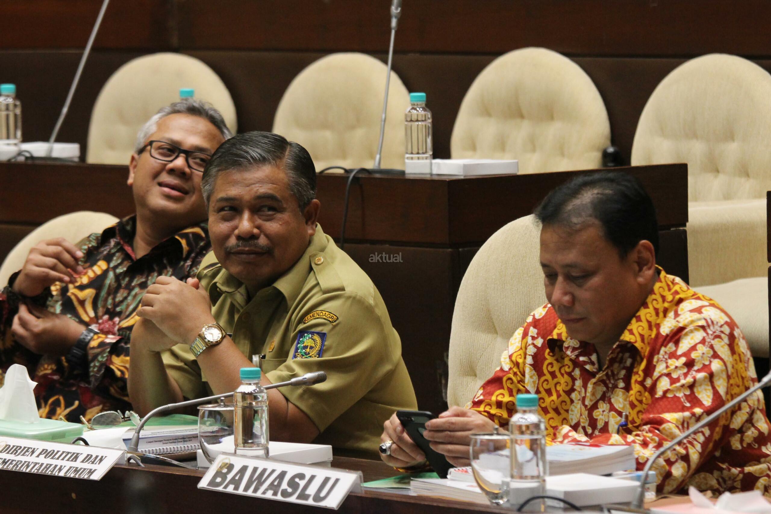 Ketua KPU Arief Budiman (kiri), Ketua Bawaslu Abhan (kanan) dan Staf Ahli Menteri Dalam Negeri Bidang Pemerintahan Suhajar Diantoro (tengah) mengikuti Rapat Dengar Pendapat (RDP) dengan Komisi II DPR, di Gedung Nusantara, Kompleks Parlemen, Senayan, Jakarta, Senin (9/4). Rapat tersebut membahas sejumlah Peraturan Komisi Pemilihan Umum (PKPU) diantaranya soal cuti Kampanye Presiden 2019, Dana Kampanye 2019 dan pelaksanaan Pilkada serentak sejumlah Daerah 2018. AKTUAL/Tino Oktaviano