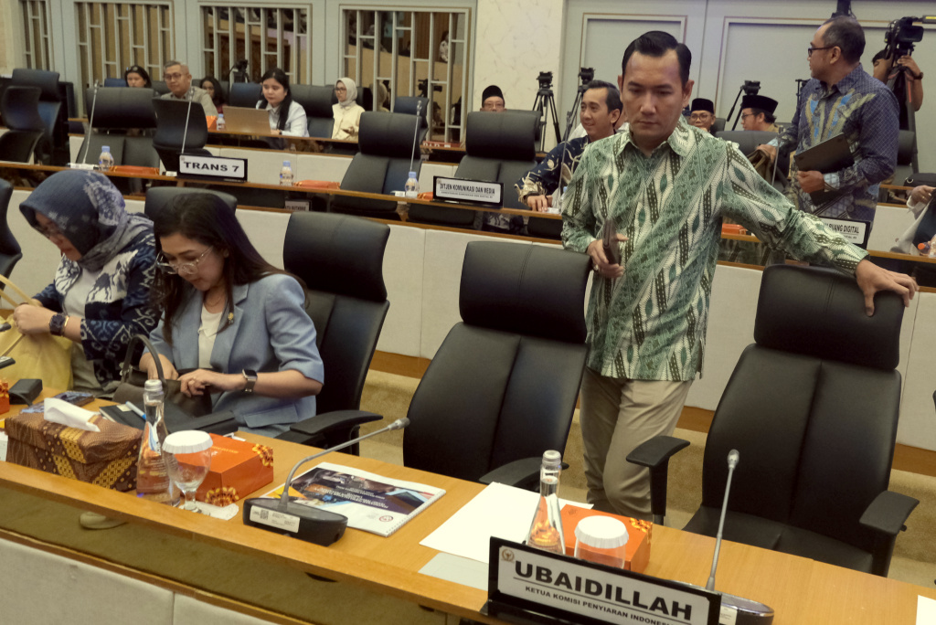 Ketua Komisi Penyiaran Indonesia (KPI) Pusat Ubaidillah saat akan mengikuti pertemuan antara Kementerian Komunikasi dan Digital, Komisi Penyiaran Indonesia (KPI), Trans7, dan Himpunan Alumni Santri Lirboyo di kompleks parlemen, Senayan, Jakarta, Kamis (16/10/2025). Aktual/TINO OKTAVIANO