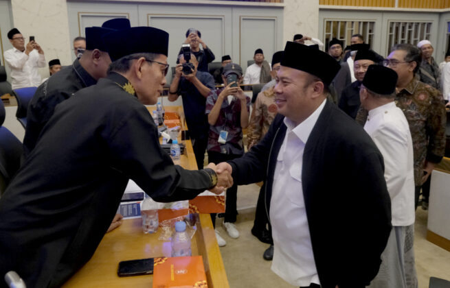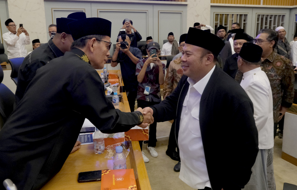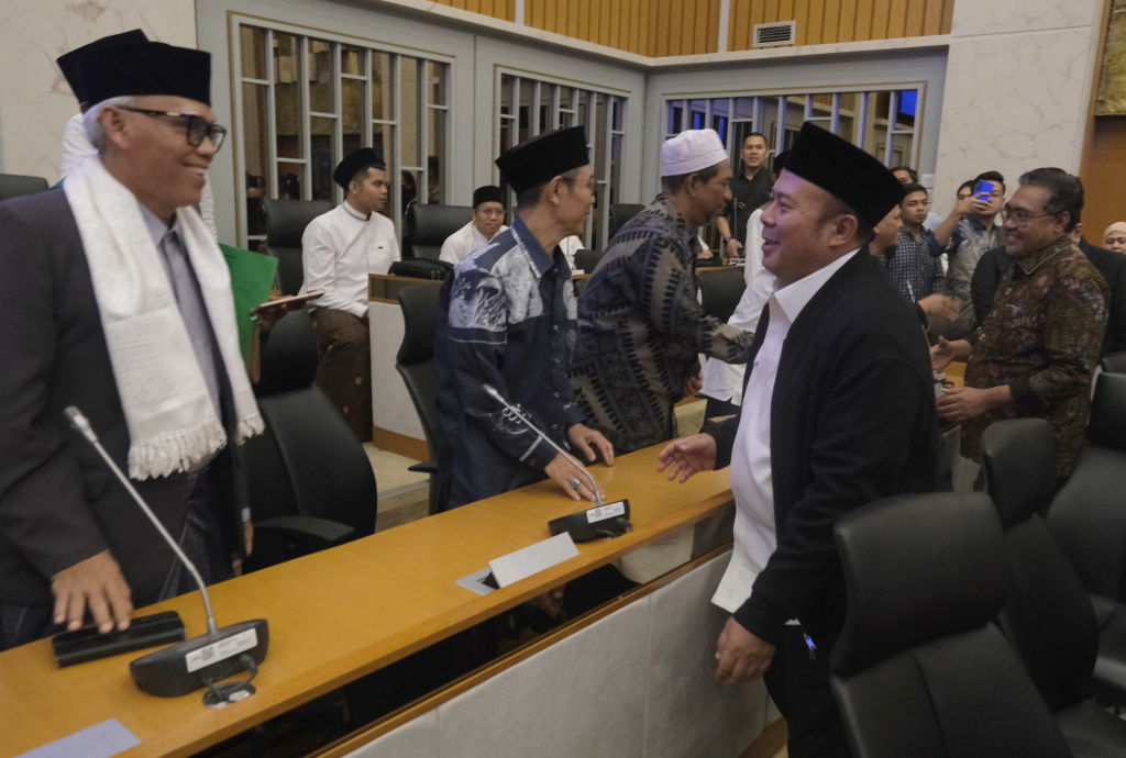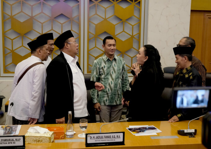 Wakil Ketua DPR RI Cucun Ahmad Syamsurizal didampingi Ketua Fraksi PKB DPR RI, Jazilul Fawaid menyalami anggota Himpunan Alumni Santri Lirboyo saat pertemuan antara Kementerian Komunikasi dan Digital, Komisi Penyiaran Indonesia (KPI), Trans7, di kompleks parlemen, Senayan, Jakarta, Kamis (16/10/2025). Aktual/TINO OKTAVIANO