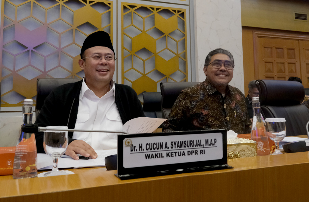 Wakil Ketua DPR RI Cucun Ahmad Syamsurizal didampingi Ketua Fraksi PKB DPR RI, Jazilul Fawaid saat pertemuan antara Kementerian Komunikasi dan Digital, Komisi Penyiaran Indonesia (KPI), Trans7, dan Himpunan Alumni Santri Lirboyo di kompleks parlemen, Senayan, Jakarta, Kamis (16/10/2025). Aktual/TINO OKTAVIANO