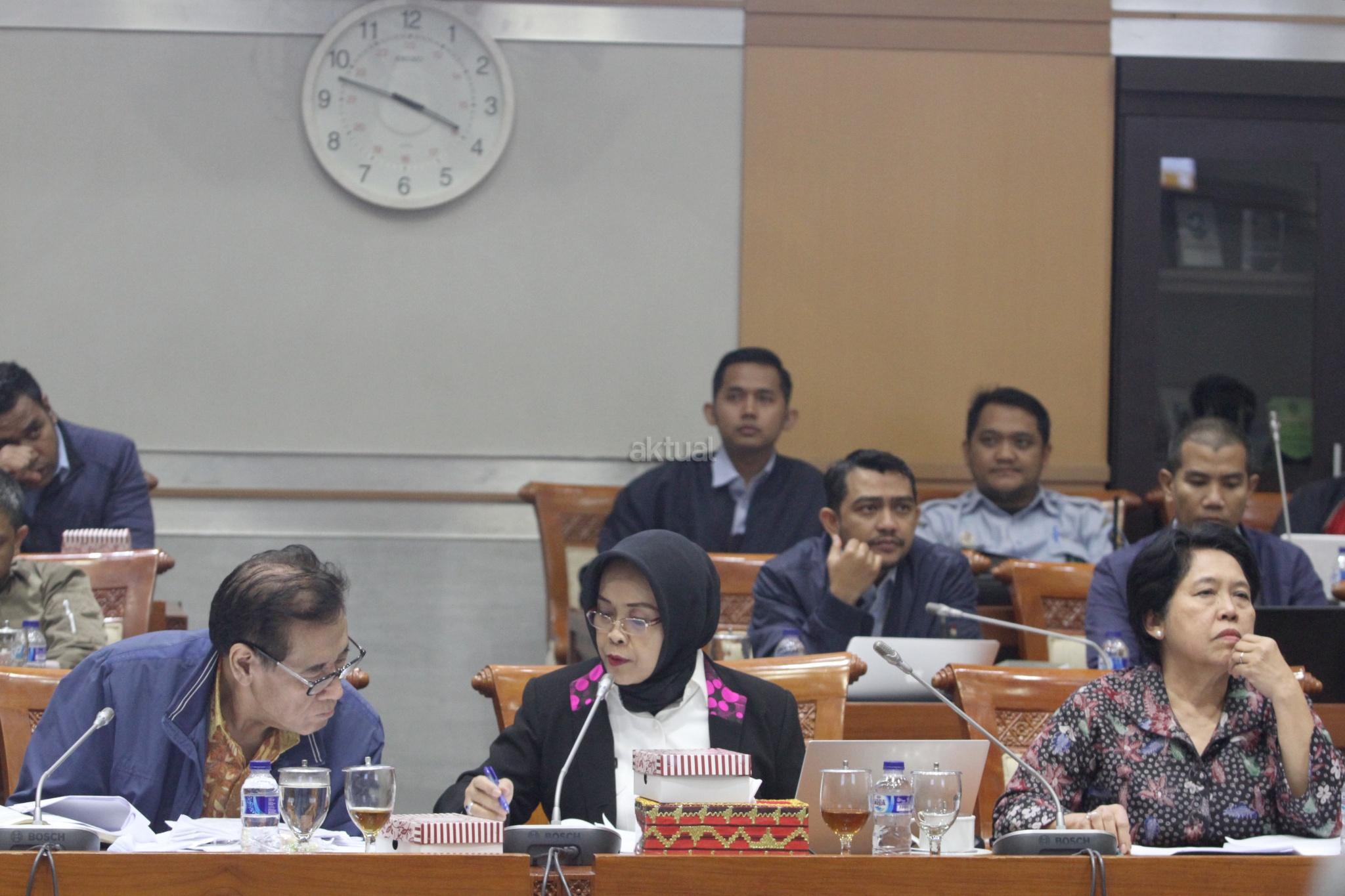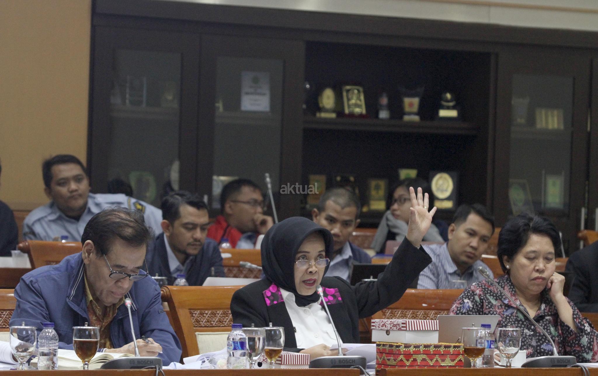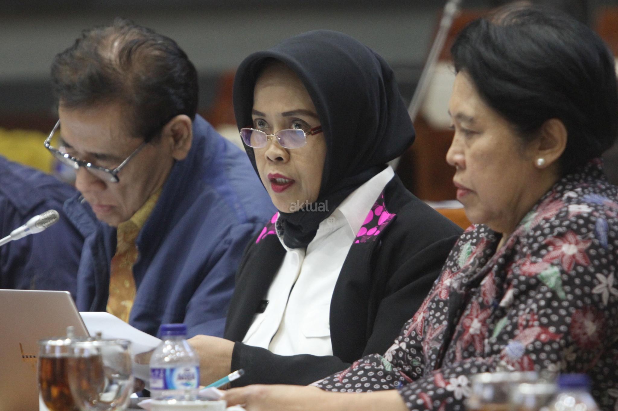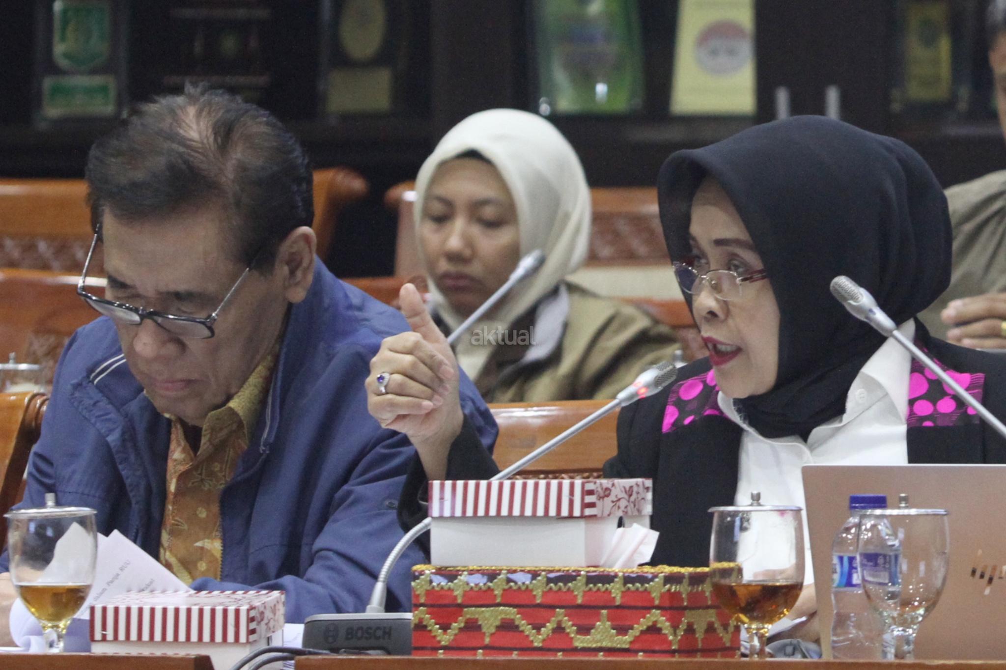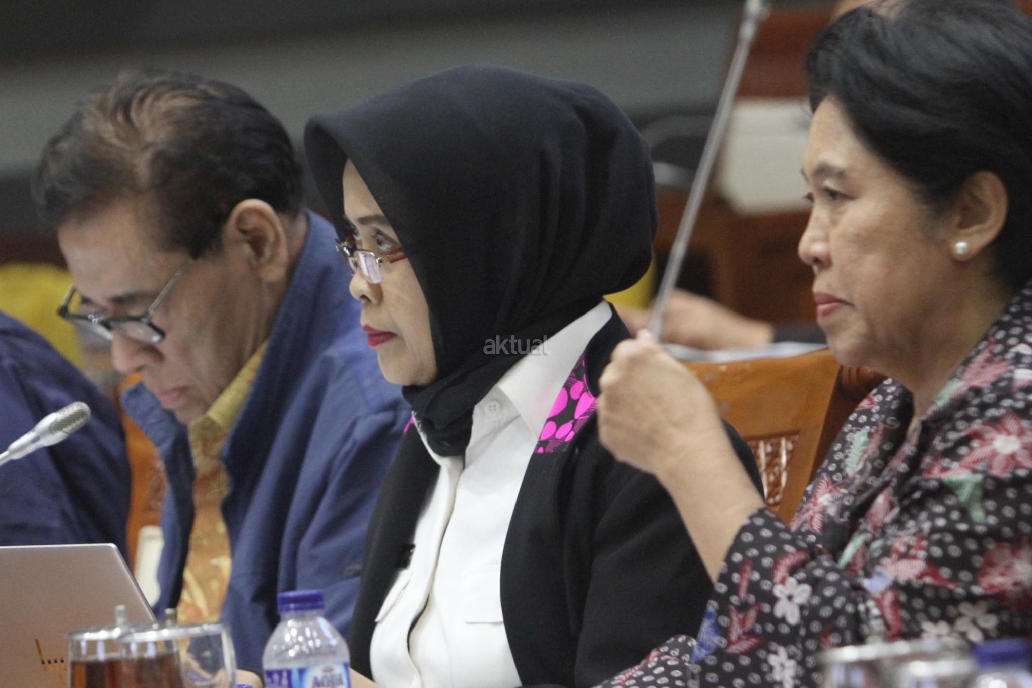 Kepala Badan Pembinaan Hukum Nasional Enny Nurbaningsih (tengah) dan anggota tim pemerintah pembahasan RUU KUHP yang juga pakar hukum Muladi (kiri) mengikuti rapat RUU KUHP dengan Komisi III DPR di kompleks Parlemen, Senayan, Jakarta, Senin (5/2/18). Rapat itu membahas isu-isu yang masih tertunda seperti pasal terkait pidana mati, penghinaan terhadap kepala negara, persoalan perzinaan dan LGBT. AKTUAL/Tino Oktaviano