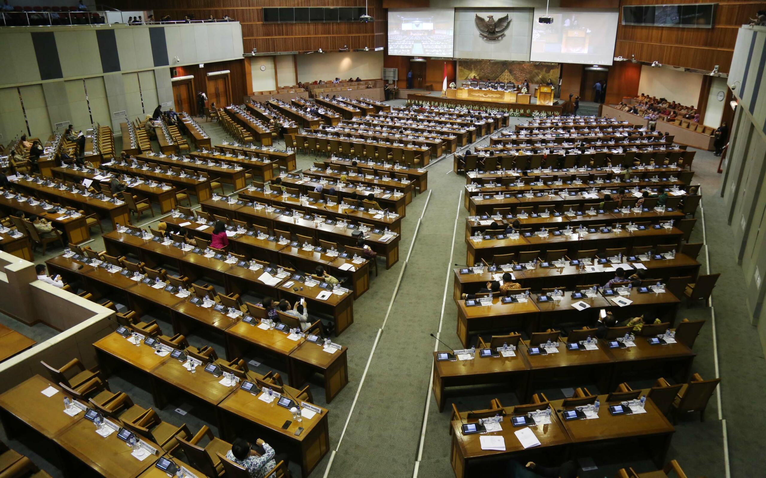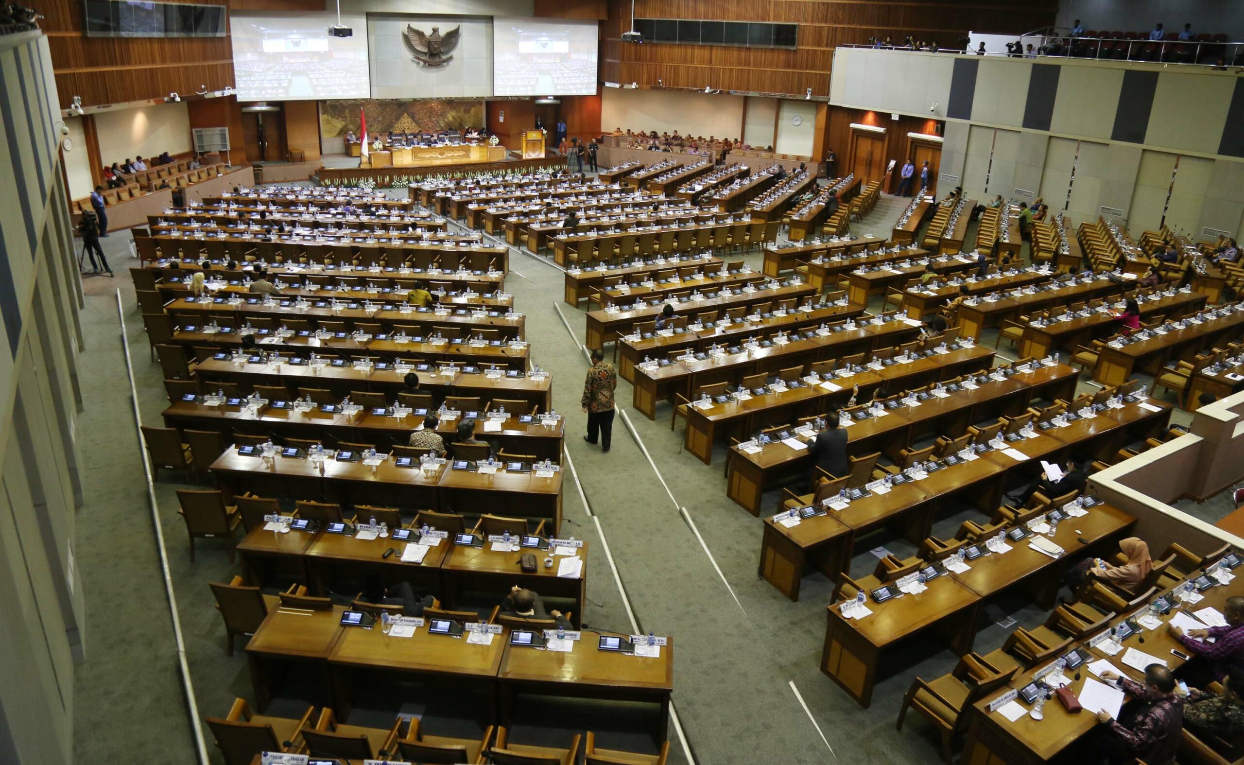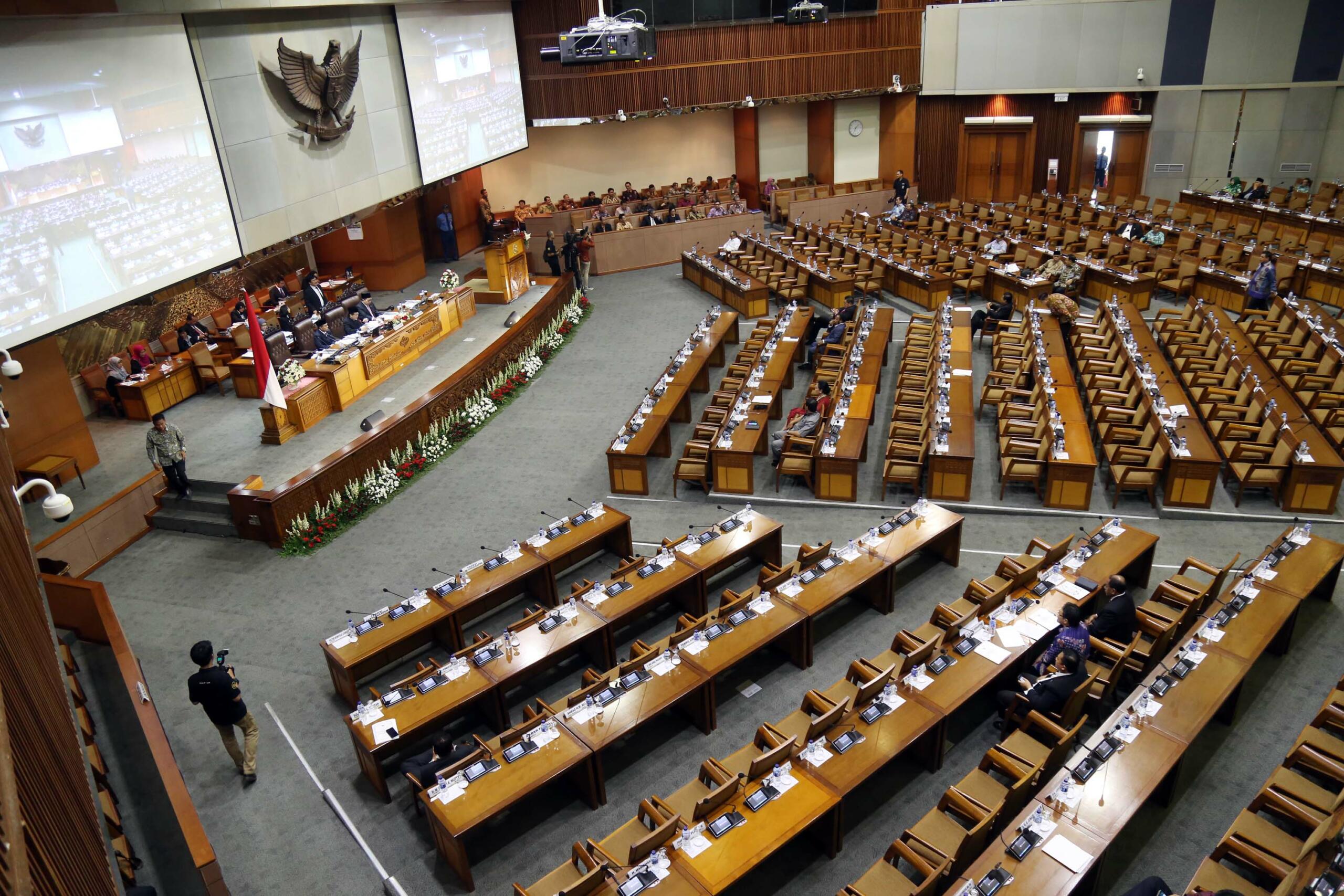 Suasana rapat paripurna membahas Rencana Anggaran Pendapatan dan Belanja Negara (R-APBN) 2017 di gedung Parlemen, Senayan, Jakarta, Selasa (30/8). Pembahasan Rencana Anggaran R-APBN 2017 ini mendengarkan jawaban pemerintah terhadap pandangan fraksi-fraksi yang akan dilakukan persetujuan tingkat dua terhadap pertanggungjawaban pelaksanaan APBN 2015. AKTUAL/TINO OKTAVIANO
