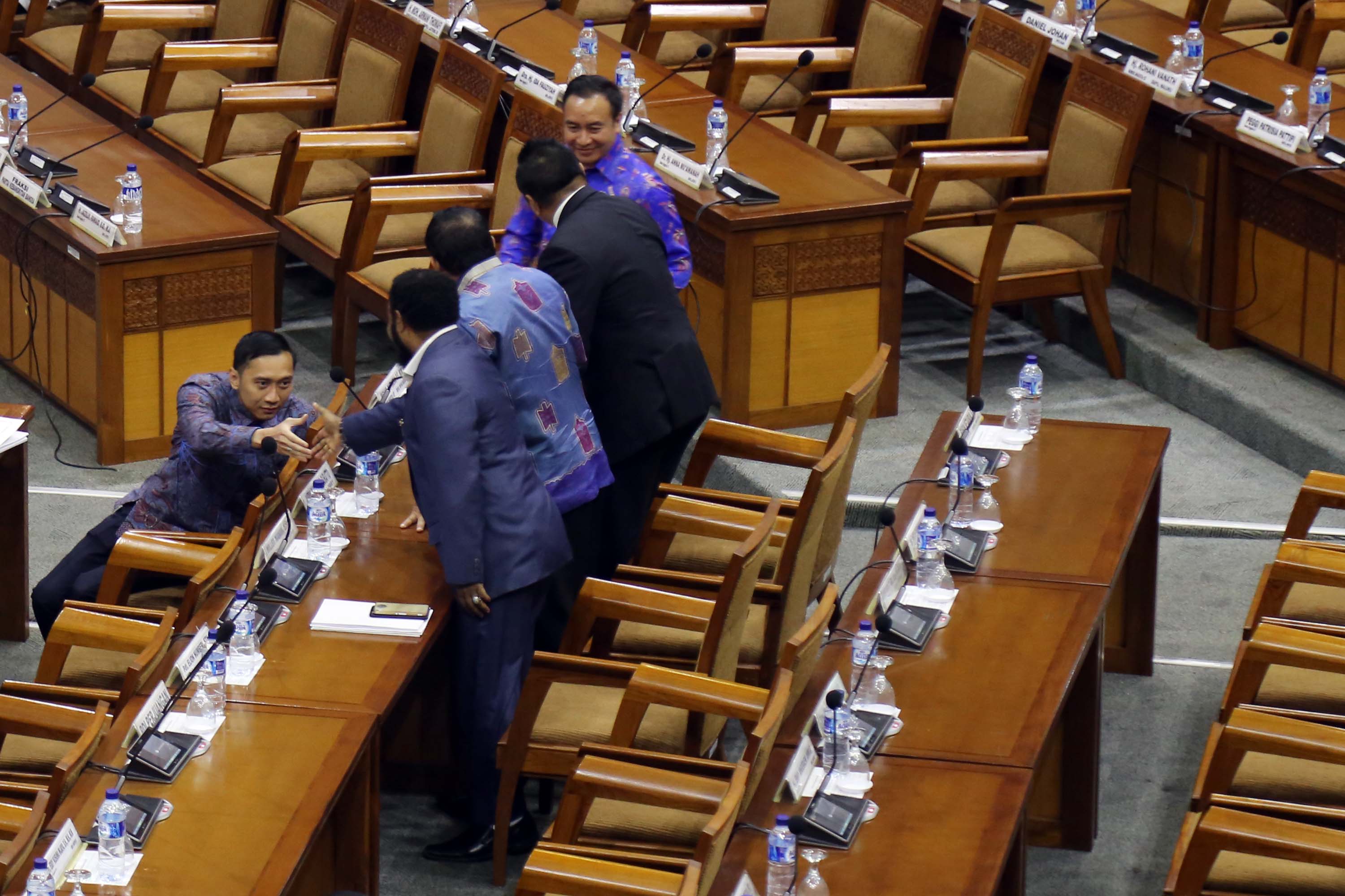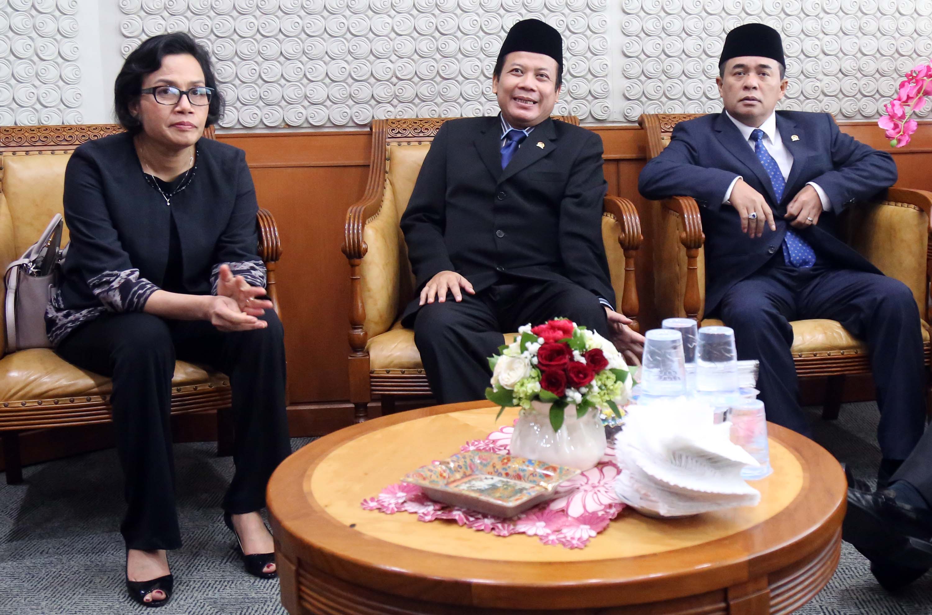 Ketua DPR, Ade Komarudin didampingi Wakil Ketua DPR, Taufik Kurniawan berbincang dengan Menteri Keuangan, Sri Mulyani saat akan membuka rapat paripurna membahas Rencana Anggaran Pendapatan dan Belanja Negara (R-APBN) 2017 di gedung Parlemen, Senayan, Jakarta, Selasa (30/8). Pembahasan Rencana Anggaran R-APBN 2017 ini mendengarkan jawaban pemerintah terhadap pandangan fraksi-fraksi yang akan dilakukan persetujuan tingkat dua terhadap pertanggungjawaban pelaksanaan APBN 2015. AKTUAL/TINO OKTAVIANO