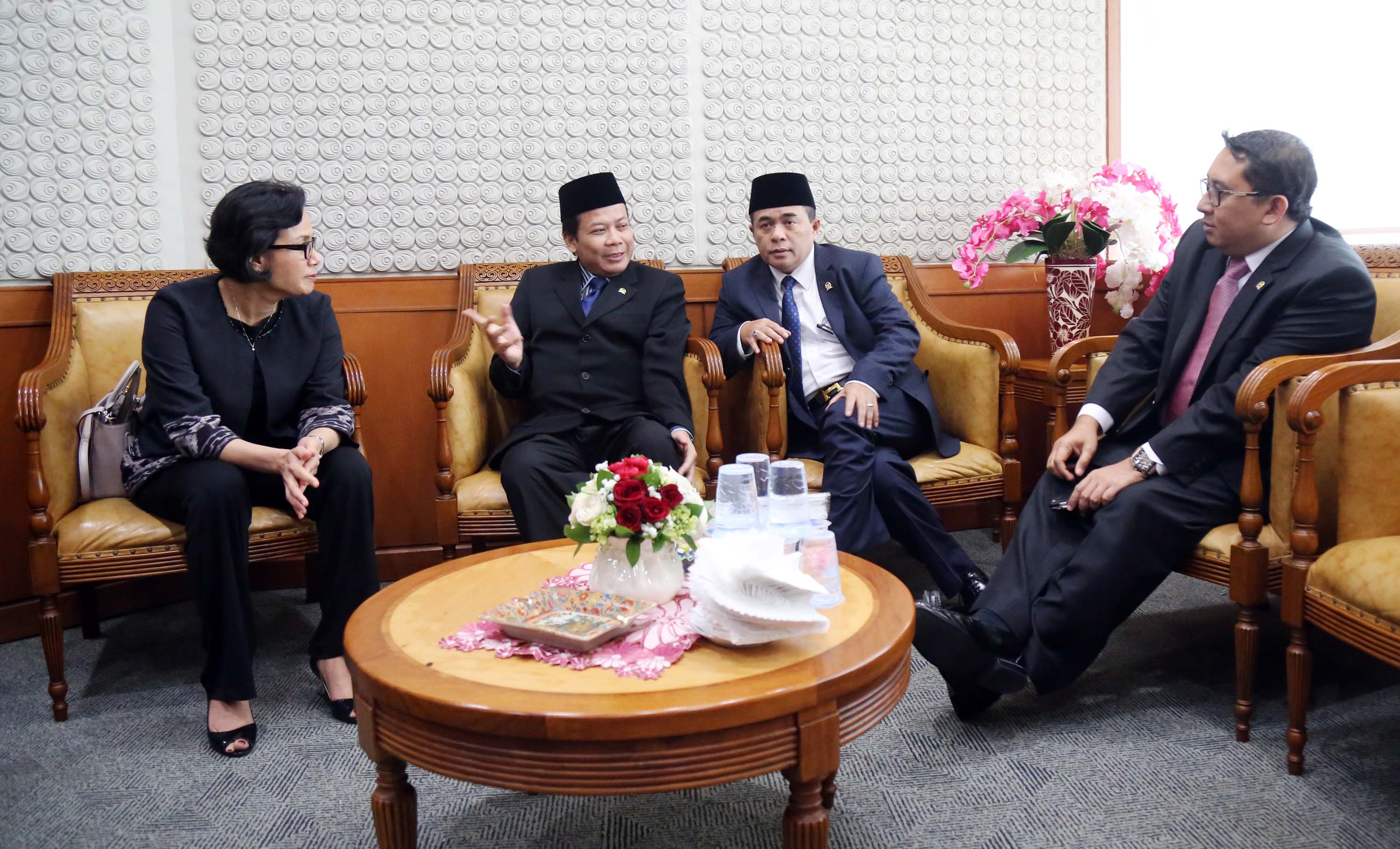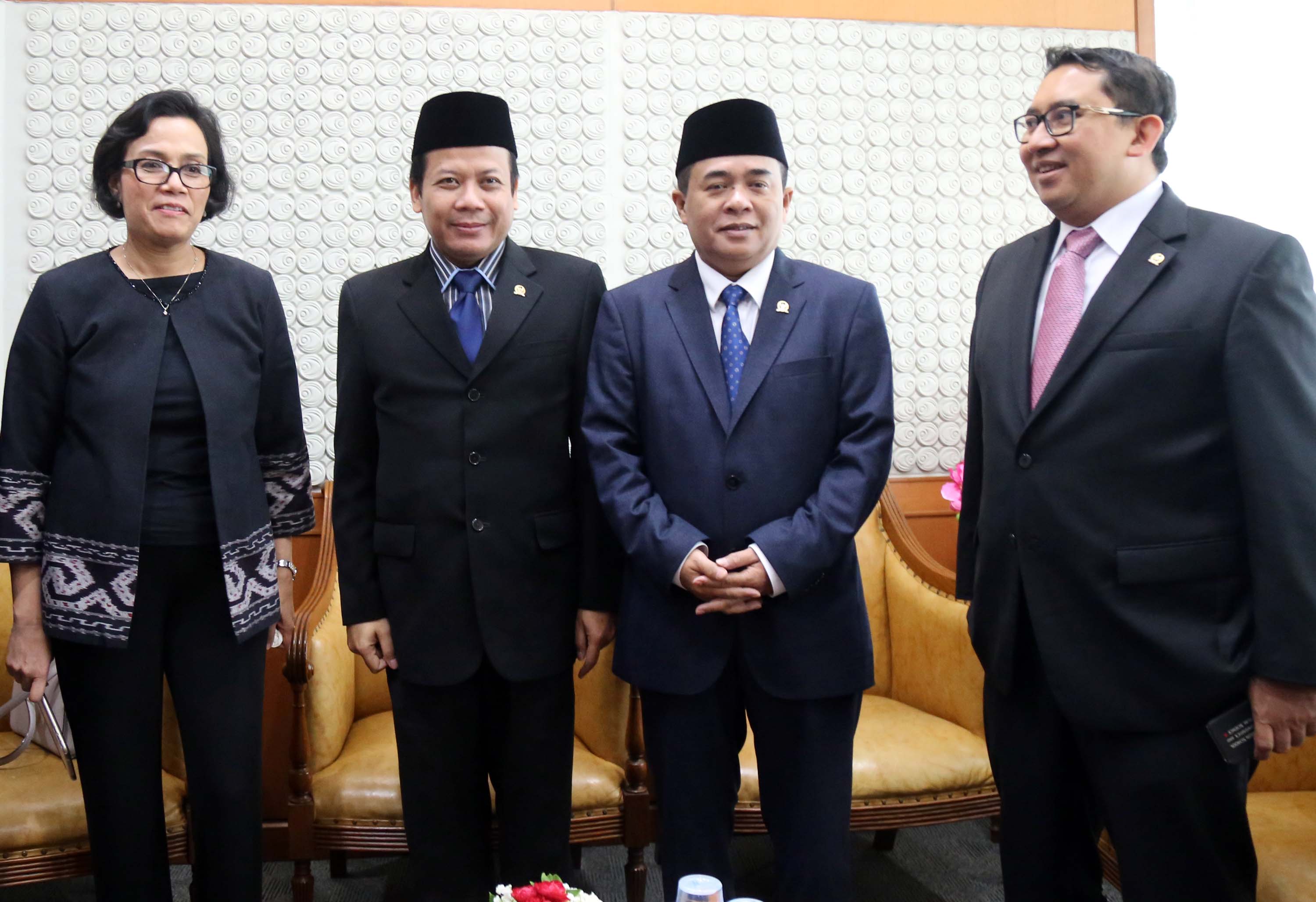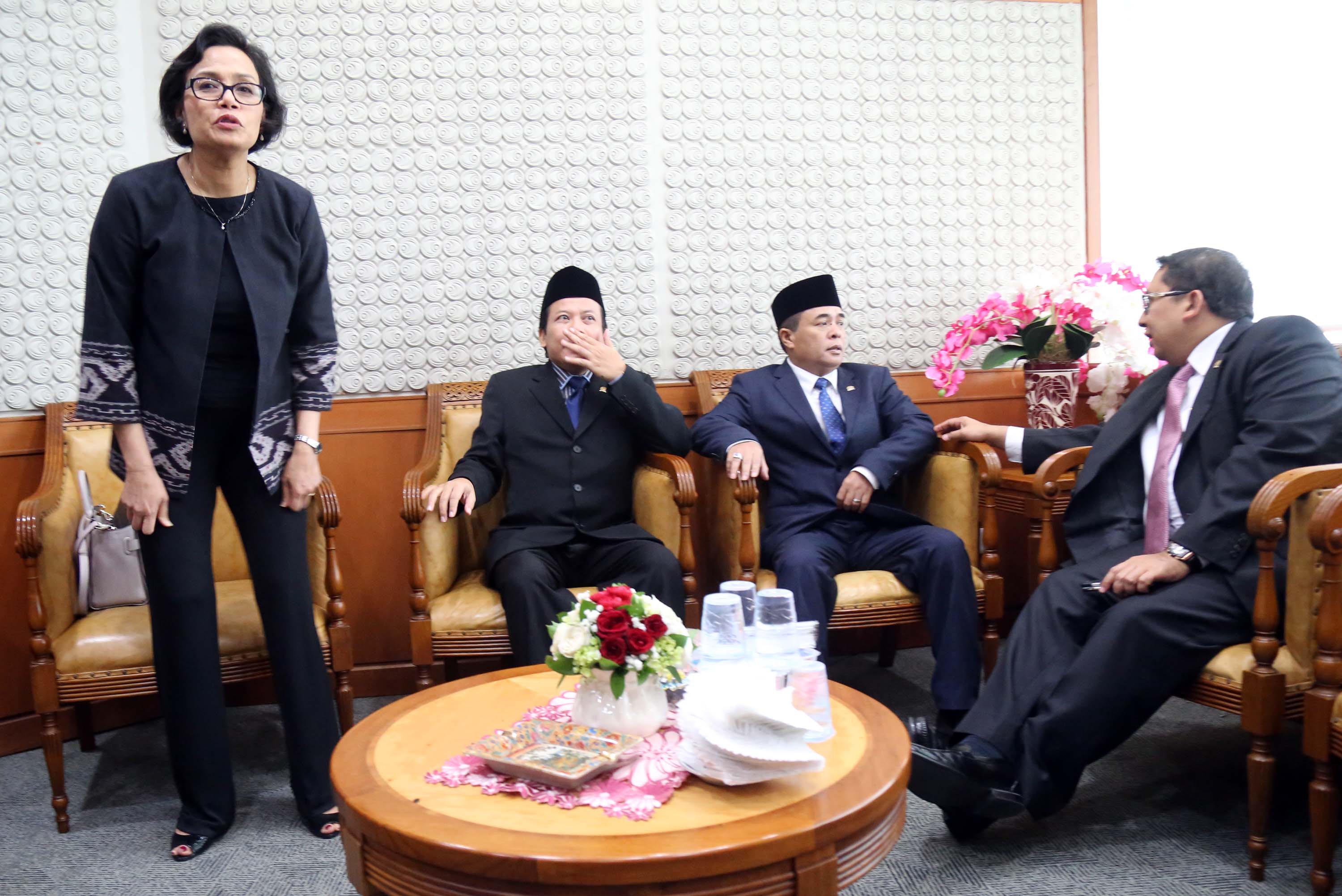 Ketua DPR, Ade Komarudin didampingi Wakil Ketua DPR, Taufik Kurniawan dan Wakil Ketua DPR Fadli Zon berbincang dengan Menteri Keuangan, Sri Mulyani saat akan membuka rapat paripurna membahas Rencana Anggaran Pendapatan dan Belanja Negara (R-APBN) 2017 di gedung Parlemen, Senayan, Jakarta, Selasa (30/8). Pembahasan Rencana Anggaran R-APBN 2017 ini mendengarkan jawaban pemerintah terhadap pandangan fraksi-fraksi yang akan dilakukan persetujuan tingkat dua terhadap pertanggungjawaban pelaksanaan APBN 2015. AKTUAL/TINO OKTAVIANO