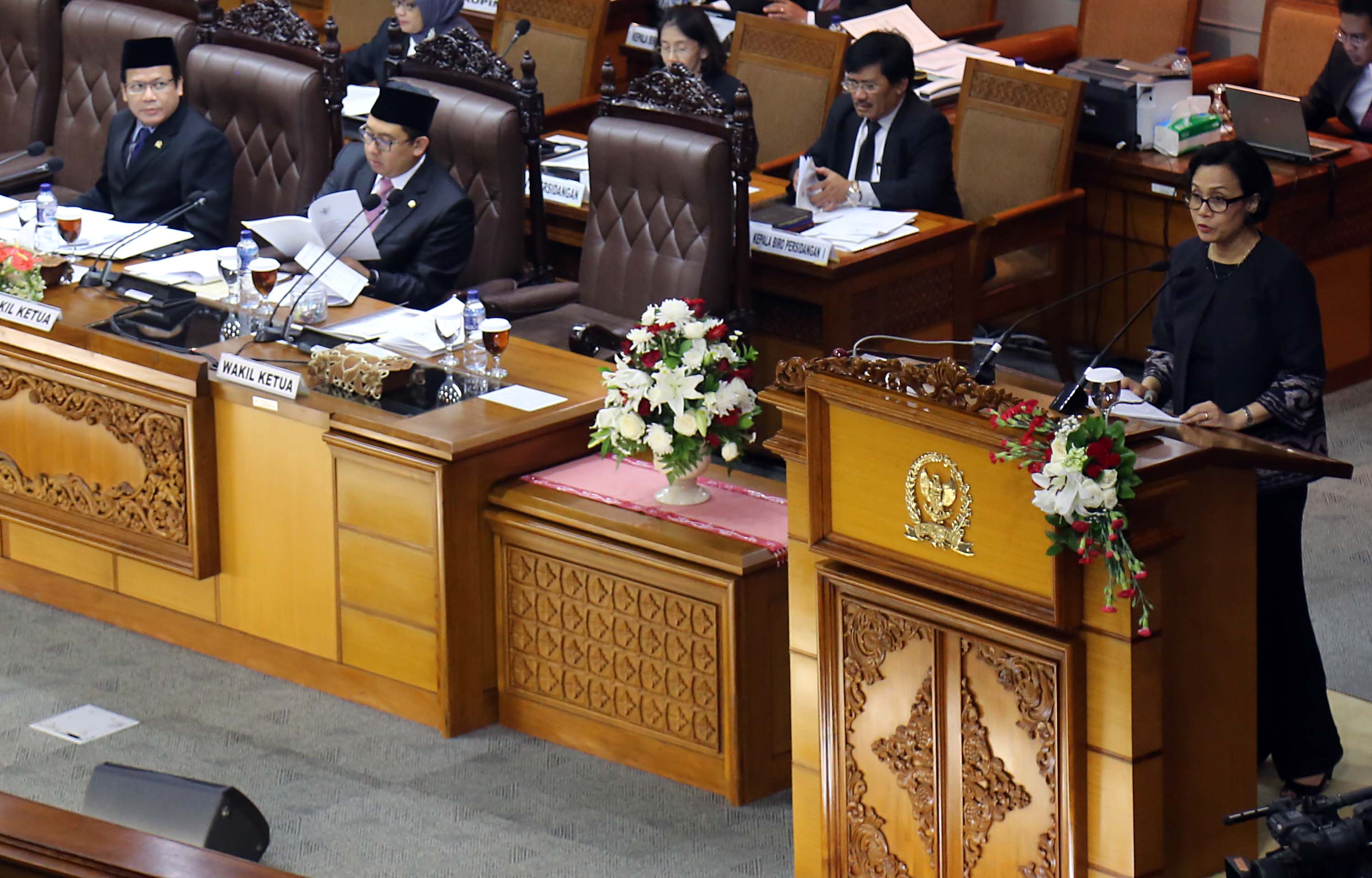 Menteri Keuangan Sri Mulyani (kanan) saat rapat paripurna membahas Rencana Anggaran Pendapatan dan Belanja Negara (R-APBN) 2017 di gedung Parlemen, Senayan, Jakarta, Selasa (30/8). Pembahasan Rencana Anggaran R-APBN 2017 ini mendengarkan jawaban pemerintah terhadap pandangan fraksi-fraksi yang akan dilakukan persetujuan tingkat dua terhadap pertanggungjawaban pelaksanaan APBN 2015. AKTUAL/TINO OKTAVIANO