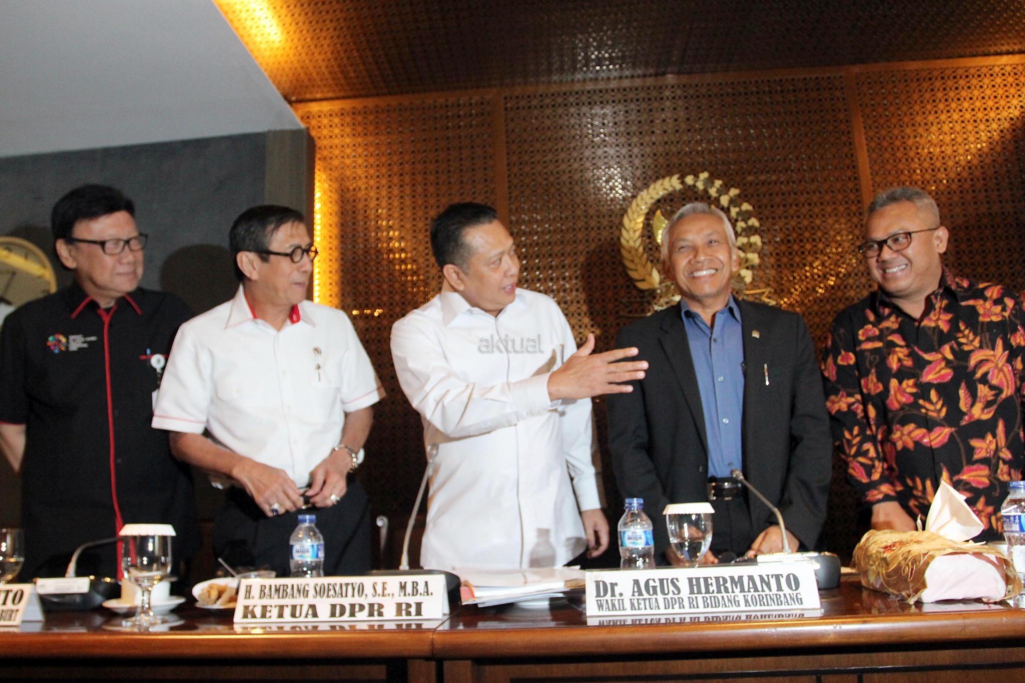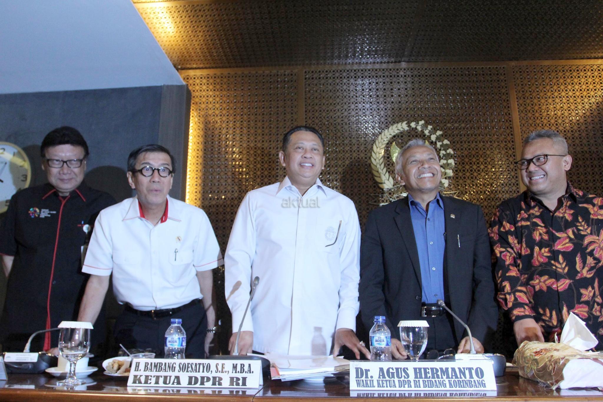 (dari kiri) Mendagri Tjahjo Kumolo, Menkumham Yasonna Laoly, Ketua DPR Bambang Soesatyo, Wakil Ketua Agus Hermanto dan Ketua KPU Arief Budiman, usai melakukan pertemuan membahas PKPU Nomor 20 Tahun 2018, di Gedung Nusantara III, Kompleks Parlemen Senayan, Jakarta, Kamis (5/7). Hasil dari Pertemuan tersebut menyepakati untuk memberikan kesempatan kepada semua pihak untuk mendaftar menjadi caleg, namun sambil menunggu verifikasi, masyarakat juga dipersilakan menggugat PKPU soal larangan Narapidana Korupsi, ke Mahkamah Agung (MA). AKTUAL/Tino Oktaviano