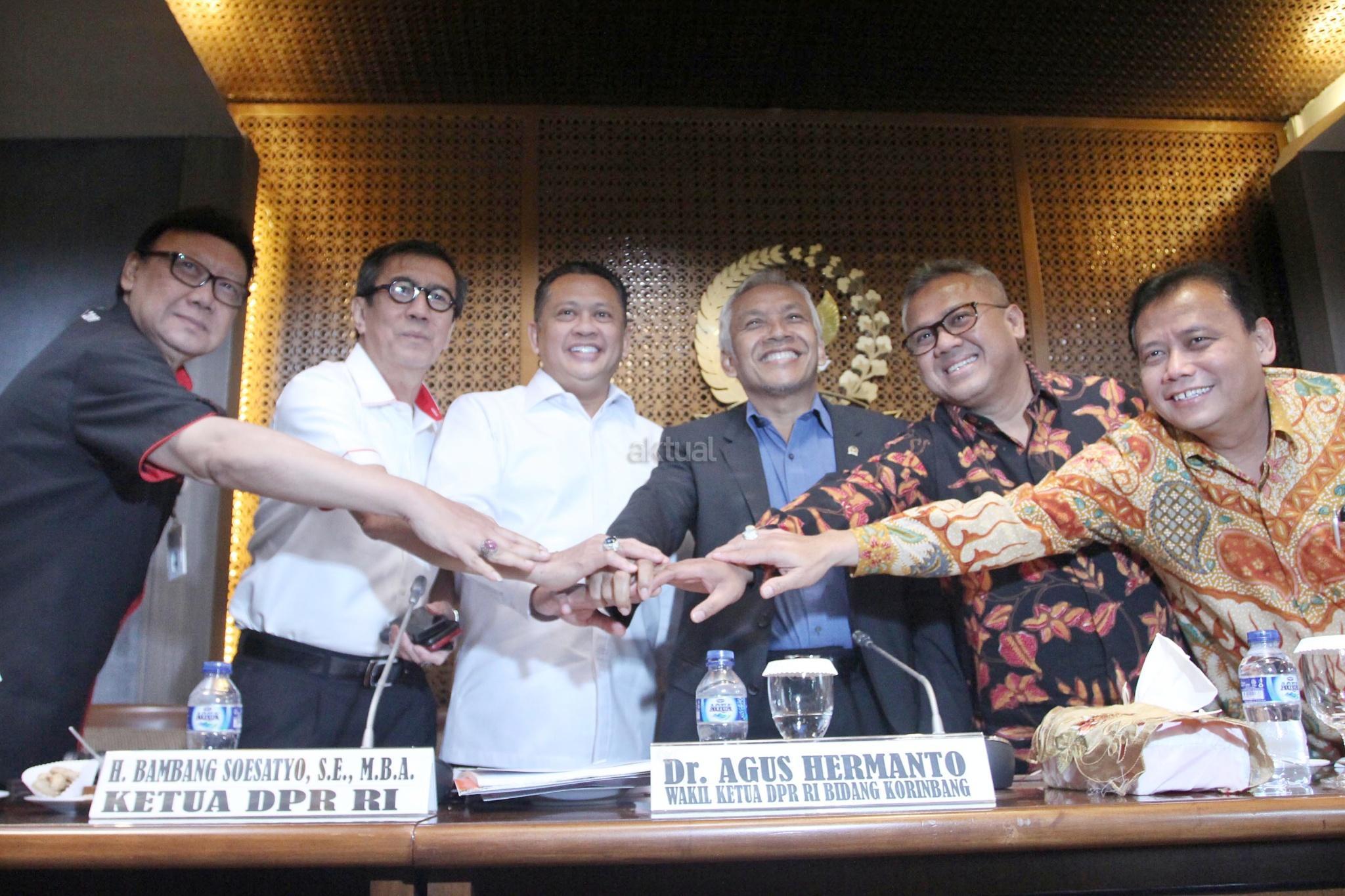 (dari kiri) Mendagri Tjahjo Kumolo, Menkumham Yasonna Laoly, Ketua DPR Bambang Soesatyo, Wakil Ketua Agus Hermanto, Ketua KPU Arief Budimandan Ketua Bawaslu Abhan, menumpuk tangan usai melakukan pertemuan membahas PKPU Nomor 20 Tahun 2018, di Gedung Nusantara III, Kompleks Parlemen Senayan, Jakarta, Kamis (5/7). Hasil dari Pertemuan tersebut menyepakati untuk memberikan kesempatan kepada semua pihak untuk mendaftar menjadi caleg, namun sambil menunggu verifikasi, masyarakat juga dipersilakan menggugat PKPU soal larangan Narapidana Korupsi, ke Mahkamah Agung (MA). AKTUAL/Tino Oktaviano