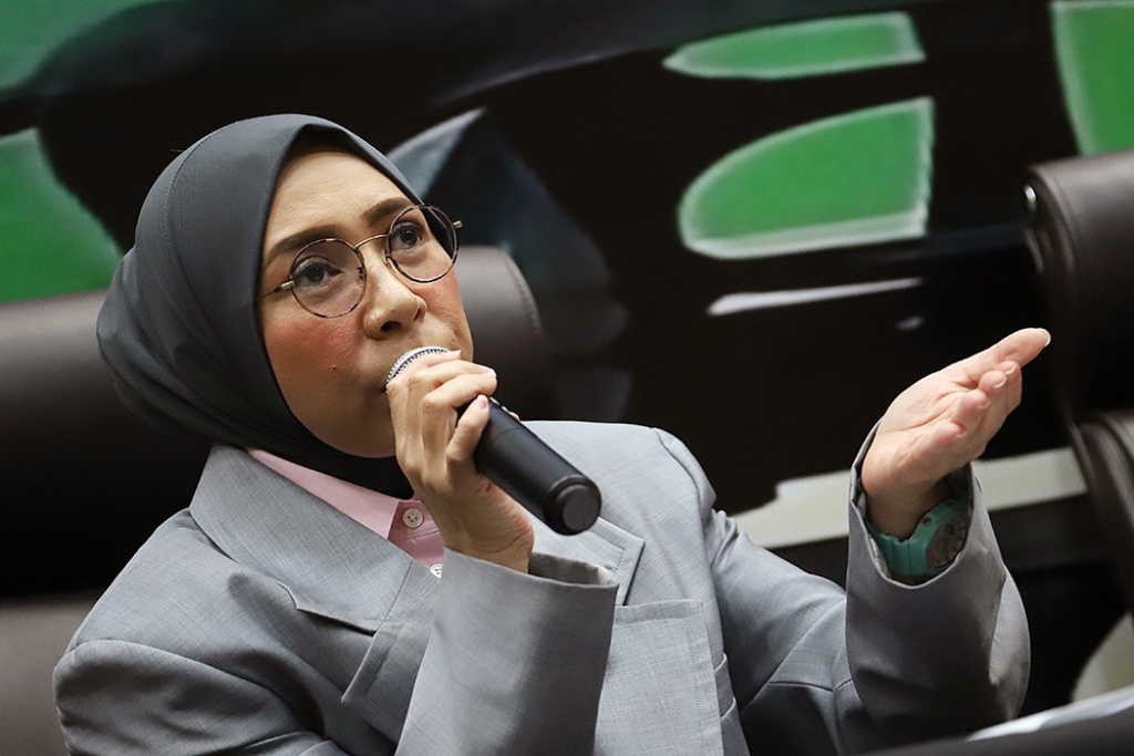 Anggota DPR Fraksi Gerindra yang juga Penyanyi sekaligus pencipta lagu, Melly Goeslaw, saat diskusi Forum Legislasi dengan tema “RUU Perubahan atas UU Nomor 28 Tahun 2014 tentang Hak Cipta, Demi Lindungi Hak Pencipta" di Ruang PPIP Gedung Nusantara I Kompleks Parlemen, Senayan, Jakarta. Selasa (4/3/2025).