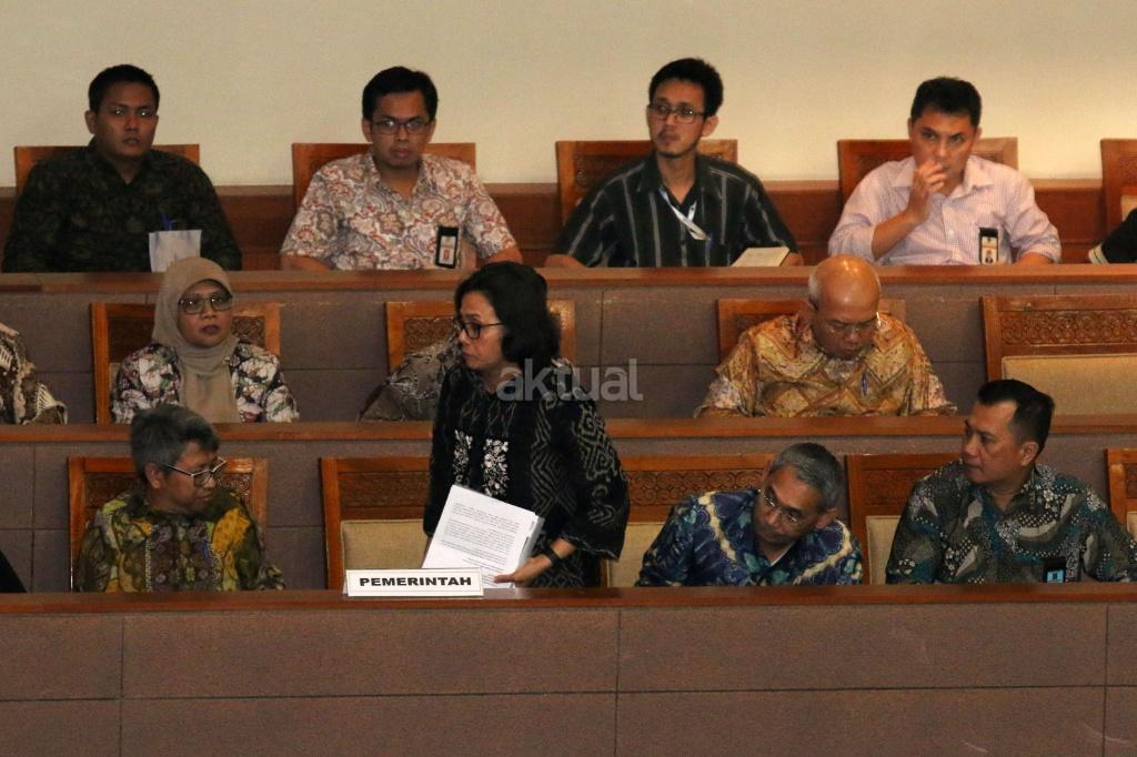 Menteri Keuangan Sri Mulyani (tengah) didampingi sejumlah pejabat, hadir dalam Rapat Paripurna DPR, di Gedung Nusantara II, Kompleks Parlemen, Senayan, Jakarta, Kamis (26/4). Dalam Rapat Paripurna tersebut Rancangan Undang-Undang tentang Protokol untuk Melaksanakan Paket Komitmen Keenam Bidang Jasa Keuangan dalam Persetujuan Kerangka Kerja ASEAN di Bidang Jasa (ASEAN Framework Agrement on Services/AFAS) disahkan menjadi Undang-Undang. AKTUAL/Tino Oktaviano