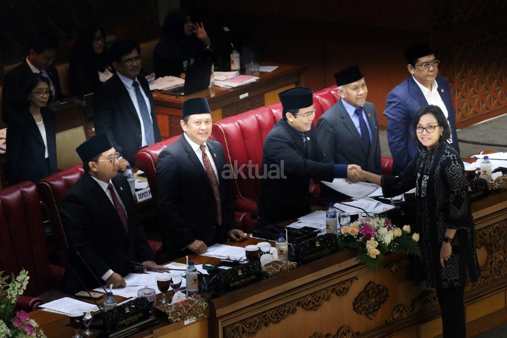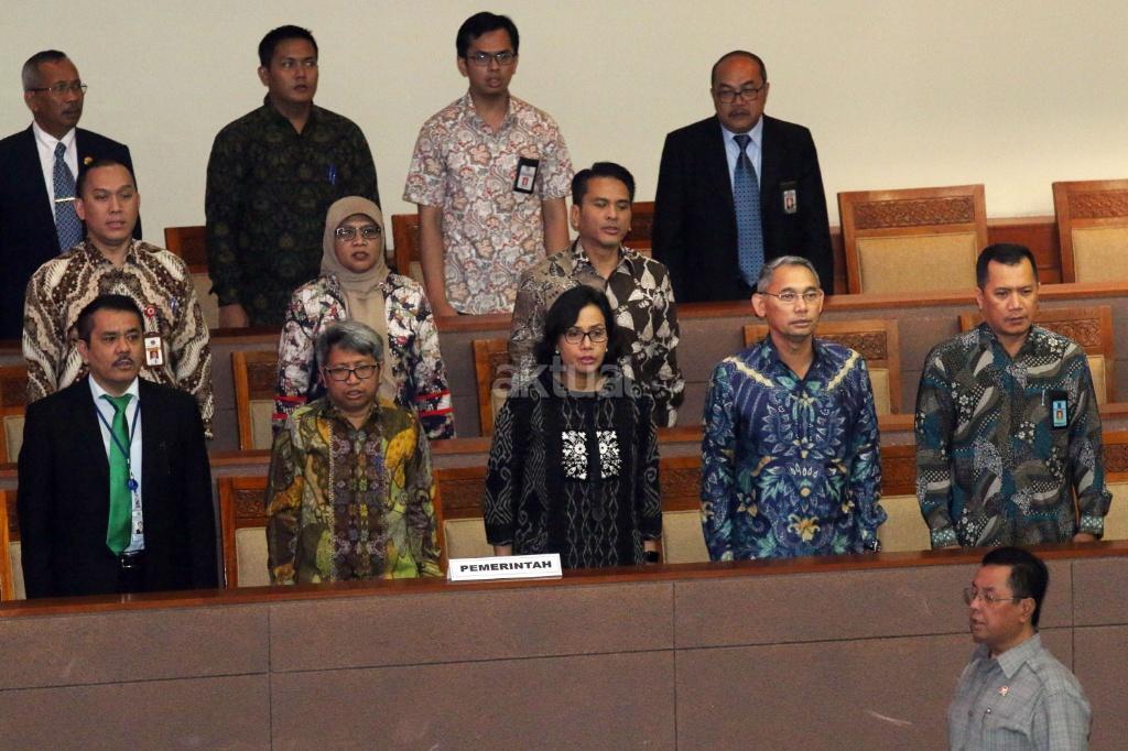 Menteri Keuangan Sri Mulyani (tengah) didampingi sejumlah pejabat, hadir dalama Rapat Paripurna DPR, di Gedung Nusantara II, Kompleks Parlemen, Senayan, Jakarta, Kamis (26/4). Dalam Rapat Paripurna tersebut Rancangan Undang-Undang tentang Protokol untuk Melaksanakan Paket Komitmen Keenam Bidang Jasa Keuangan dalam Persetujuan Kerangka Kerja ASEAN di Bidang Jasa (ASEAN Framework Agrement on Services/AFAS) disahkan menjadi Undang-Undang. AKTUAL/Tino Oktaviano