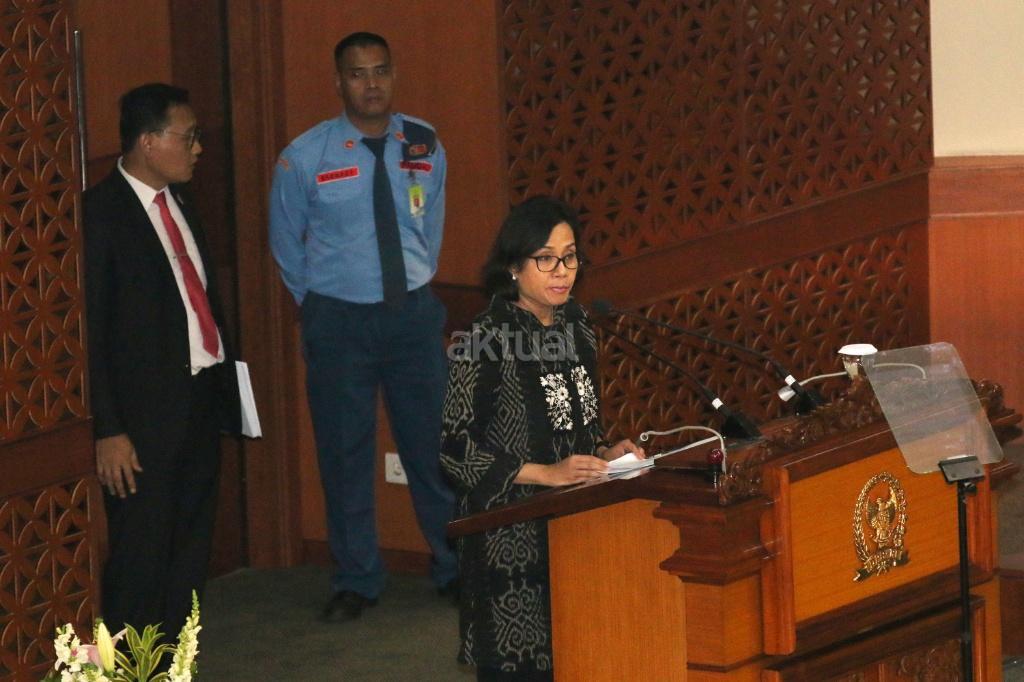 Menteri Keuangan Sri Mulyani , membacakan pandangan akhir pemerintah soal Rancangan Undang-Undang tentang Protokol untuk Melaksanakan Paket Komitmen Keenam Bidang Jasa Keuangan dalam Persetujuan Kerangka Kerja ASEAN di Bidang Jasa (ASEAN Framework Agrement on Services/AFAS), usai dibacakan dalam Rapat Paripurna DPR, di Gedung Nusantara II, Kompleks Parlemen, Senayan, Jakarta, Kamis (26/4). Dalam Rapat Paripurna tersebut Rancangan Undang-Undang tentang Protokol untuk Melaksanakan Paket Komitmen Keenam Bidang Jasa Keuangan dalam Persetujuan Kerangka Kerja ASEAN di Bidang Jasa (ASEAN Framework Agrement on Services/AFAS) disahkan menjadi Undang-Undang. AKTUAL/Tino Oktaviano
