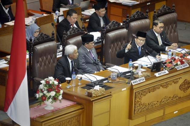 Ketua Rapat Taufik Kurniawan (kedua kanan) disaksikan Ketua DPR Ade Komaruddin (kedua kiri), serta Wakil Ketua DPR Agus Hermanto (kiri) dan Fadli Zon (kedua kanan) mengetuk palu saat mengesahkan revisi Undang-Undang Nomor 8 Tahun 2015 tentang Pemilihan Kepala Daerah dalam Rapat Paripurna DPR di Kompleks Parlemen Senayan, Jakarta, Kamis (2/6). UU Pilkada yang disahkan DPR sesuai dengan keputusan MK yang menerapkan bahwa anggota DPR, DPD, dan DPRD pun tidak perlu mundurkan diri, cukup cuti jika akan maju mencalonkan diri dalam Pemilihan Kepala Daerah (Pilkada). ANTARA FOTO/Yudhi Mahatma/pd/16