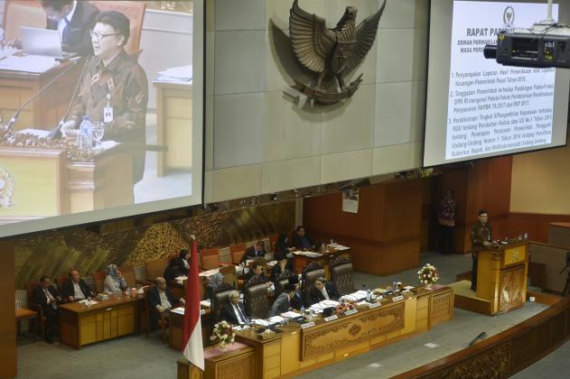 Mendagri Tjahjo Kumolo (kanan) membacakan draft revisi Undang-Undang Nomor 8 Tahun 2015 tentang Pemilihan Kepala Daerah saat Rapat Paripurna DPR di Kompleks Parlemen Senayan, Jakarta, Kamis (2/6). UU Pilkada yang disahkan DPR sesuai dengan keputusan MK yang menerapkan bahwa anggota DPR, DPD, dan DPRD pun tidak perlu mundurkan diri, cukup cuti jika akan maju mencalonkan diri dalam Pemilihan Kepala Daerah (Pilkada). ANTARA FOTO/Yudhi Mahatma/pd/16