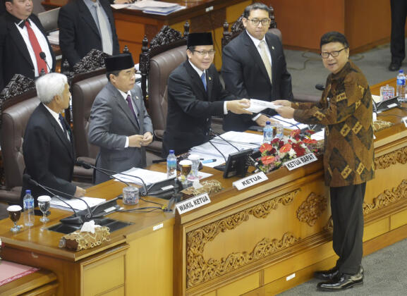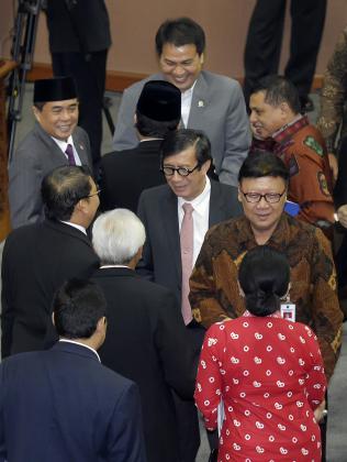 Mendagri Tjahjo Kumolo (tengah) bersama Menkum HAM Yasonna Laoly (kanan) serta Ketua DPR Ade Komaruddin (kiri) menyalami anggota DPR usai Rapat Paripurna DPR dengan agenda revisi Undang-Undang Nomor 8 Tahun 2015 tentang Pemilihan Kepala Daerah di Kompleks Parlemen Senayan, Jakarta, Kamis (2/6). UU Pilkada yang disahkan DPR sesuai dengan keputusan MK yang menerapkan bahwa anggota DPR, DPD, dan DPRD pun tidak perlu mundurkan diri, cukup cuti jika akan maju mencalonkan diri dalam Pemilihan Kepala Daerah (Pilkada). ANTARA FOTO/Yudhi Mahatma/pd/16