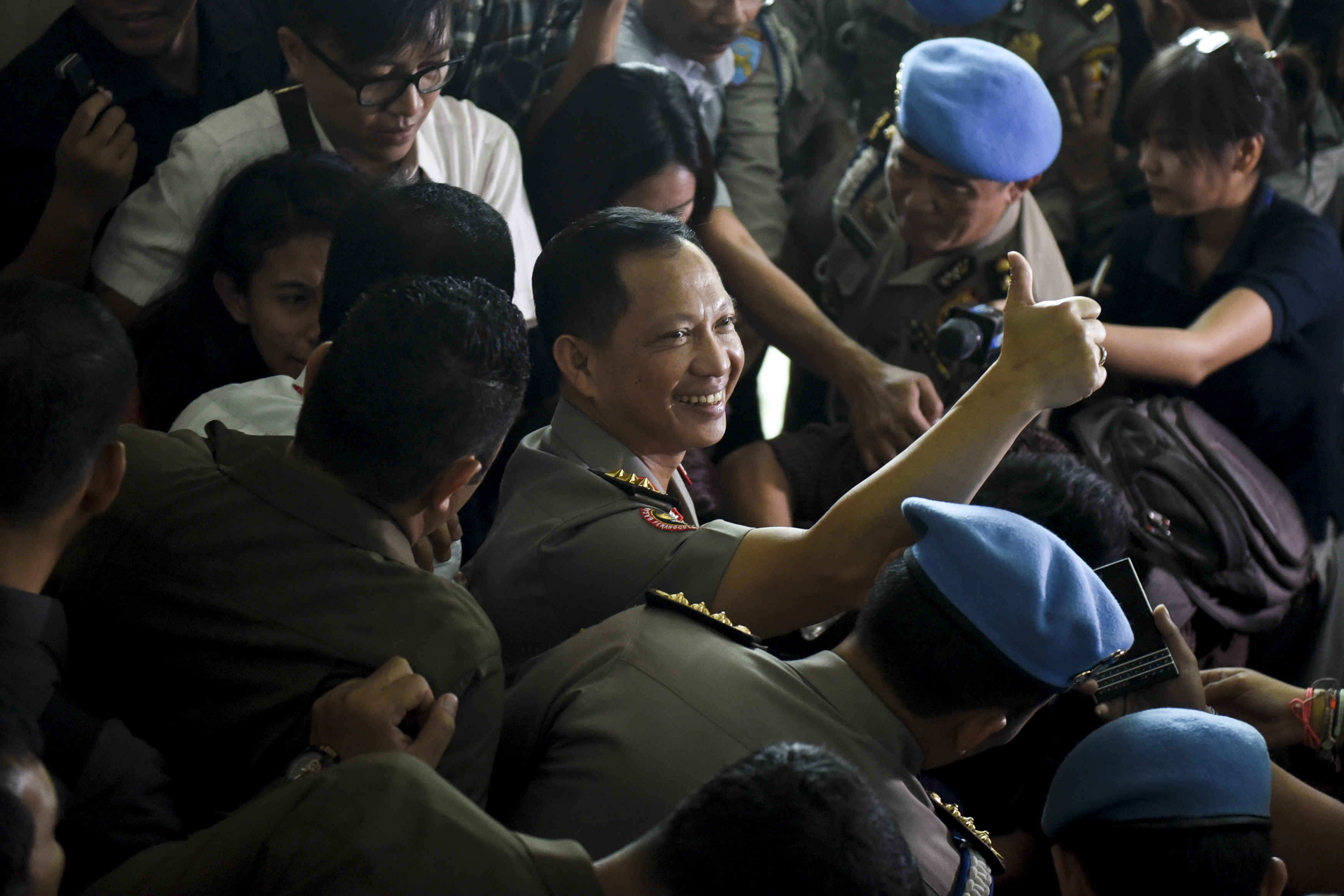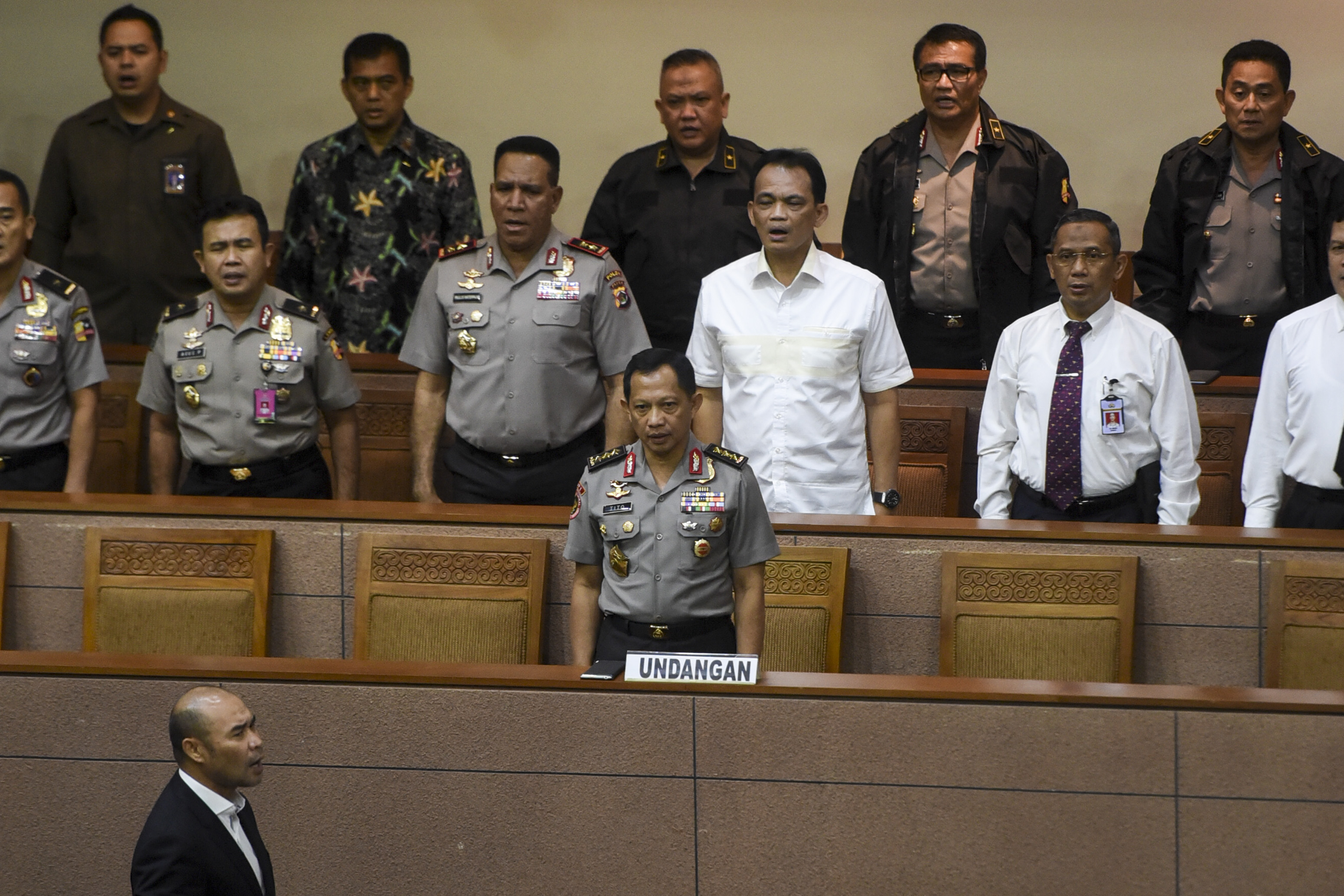 Calon Kapolri Komjen Pol Tito Karnavian (tengah) mengikuti rapat paripurna DPR di Kompleks Parlemen, Senayan, Jakarta, Senin (27/6). DPR mengesahkan pencalonan Komjen Pol Tito Karnavian sebagai Kapolri dalam rapat paripurna tersebut. ANTARA FOTO/Hafidz Mubarak A./aww/16.