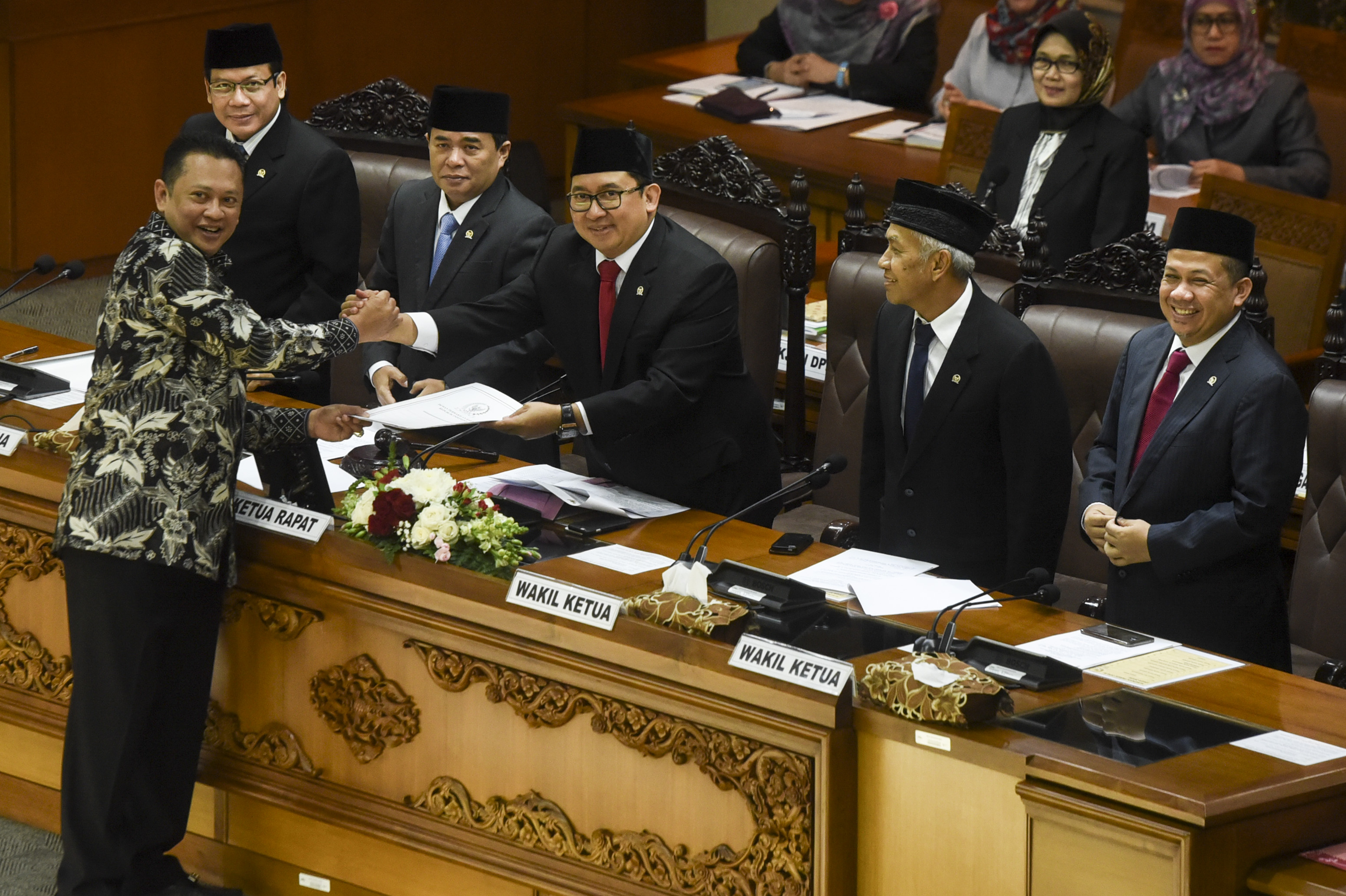 Ketua Komisi III DPR Bambang Soesatyo (kiri) menyerahkan laporan uji kelayakan dan kepatutan Komjen Pol Tito Karnavian kepada pimpinan DPR saat rapat paripurna di Kompleks Parlemen, Senayan, Jakarta, Senin (27/6). DPR mengesahkan pencalonan Komjen Pol Tito Karnavian sebagai Kapolri dalam sidang paripurna tersebut. ANTARA FOTO/Hafidz Mubarak A./aww/16.