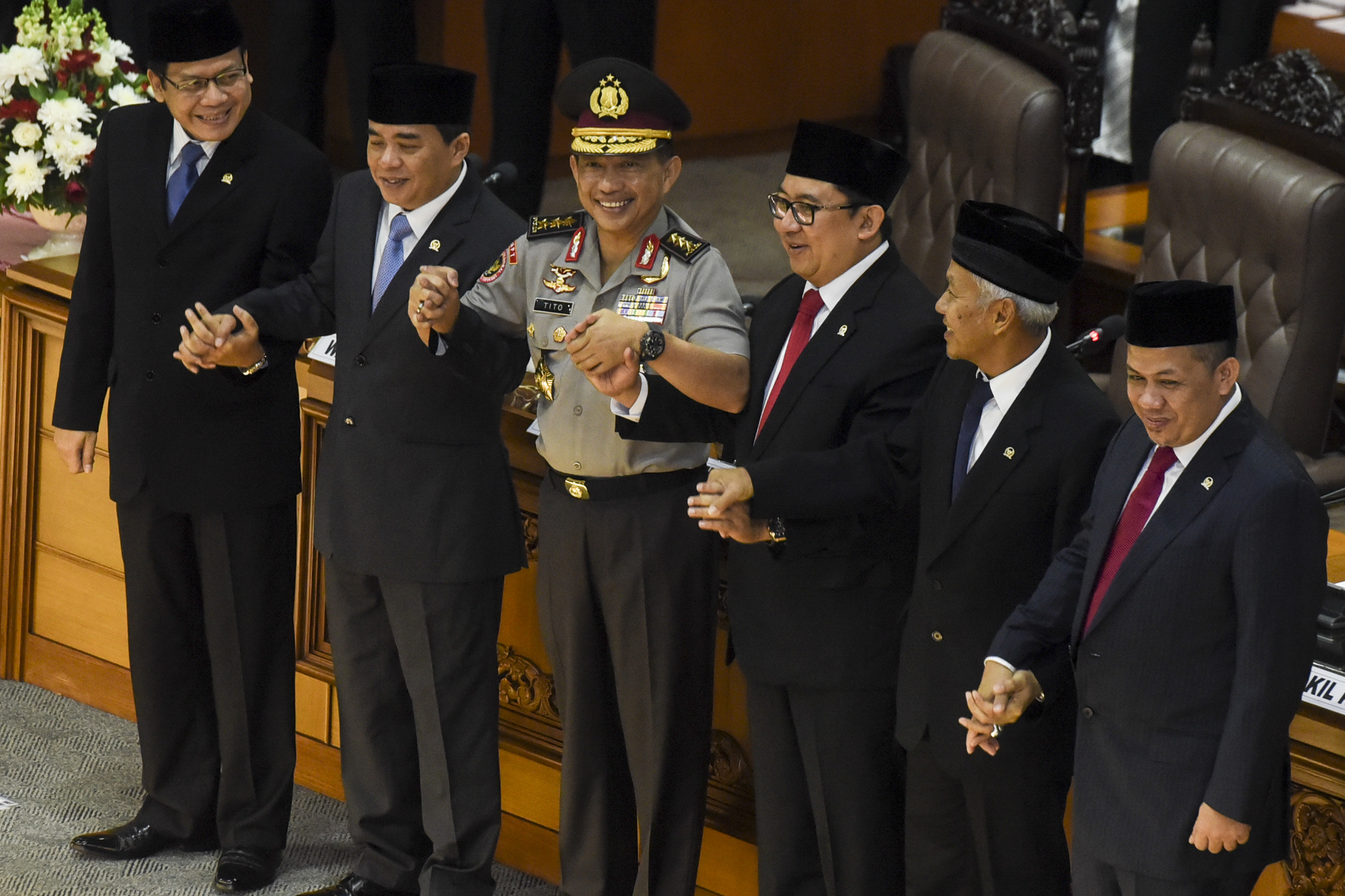 Calon Kapolri Komjen Pol Tito Karnavian (ketiga kiri) bergandengan tangan dengan lima pimpinan DPR saat rapat paripurna di Kompleks Parlemen, Senayan, Jakarta, Senin (27/6). DPR mengesahkan pencalonan Komjen Pol Tito Karnavian sebagai Kapolri dalam sidang paripurna tersebut. ANTARA FOTO/Hafidz Mubarak A./aww/16.