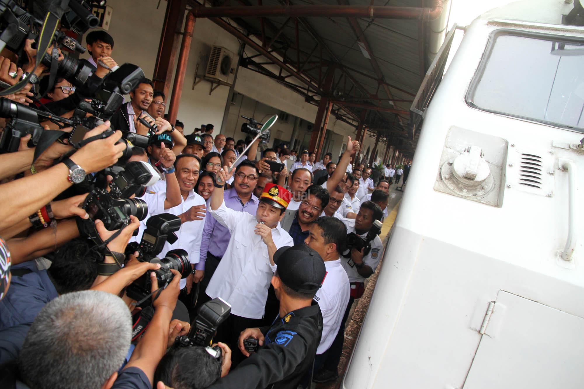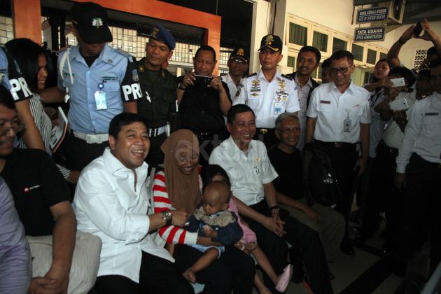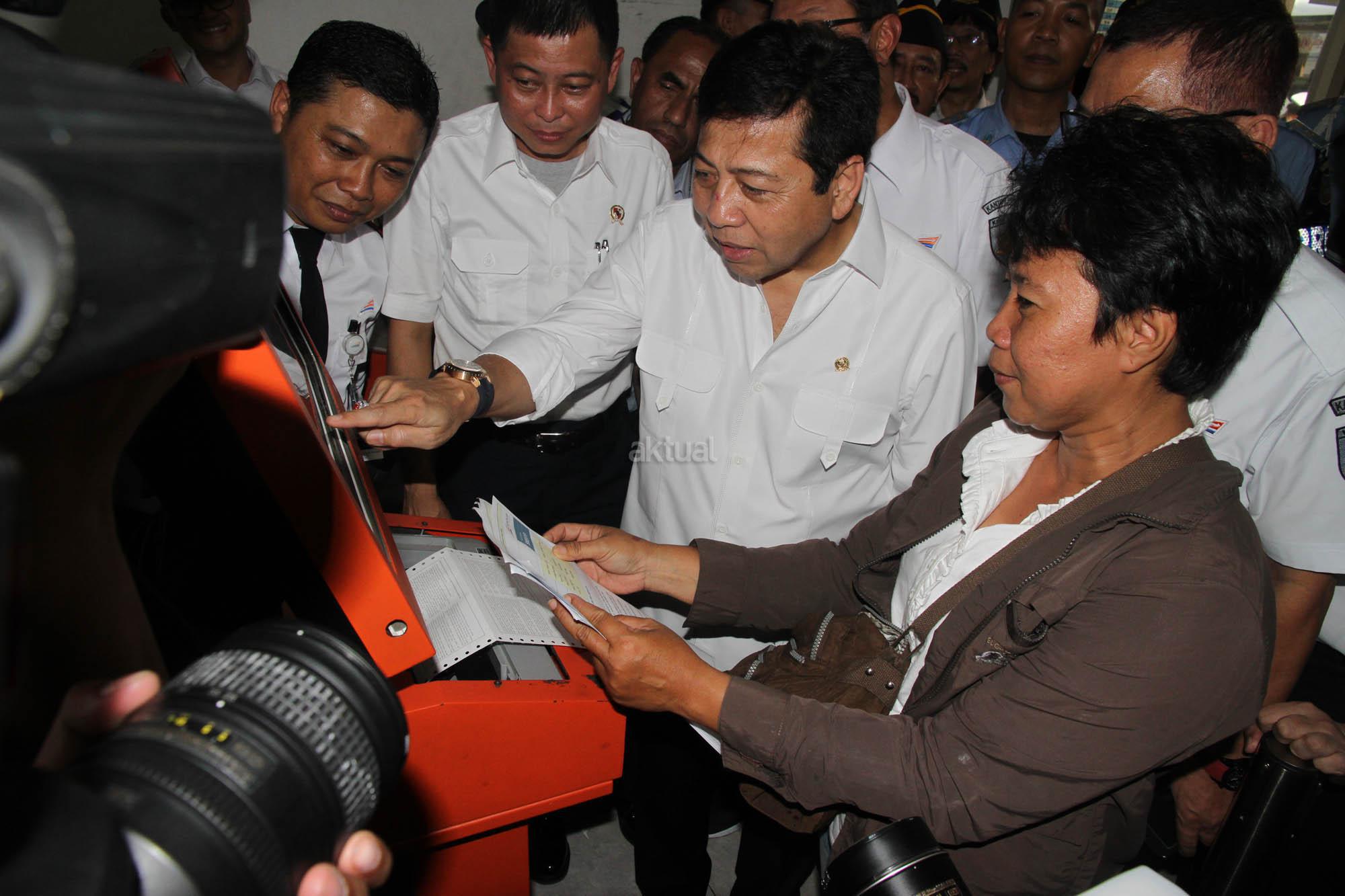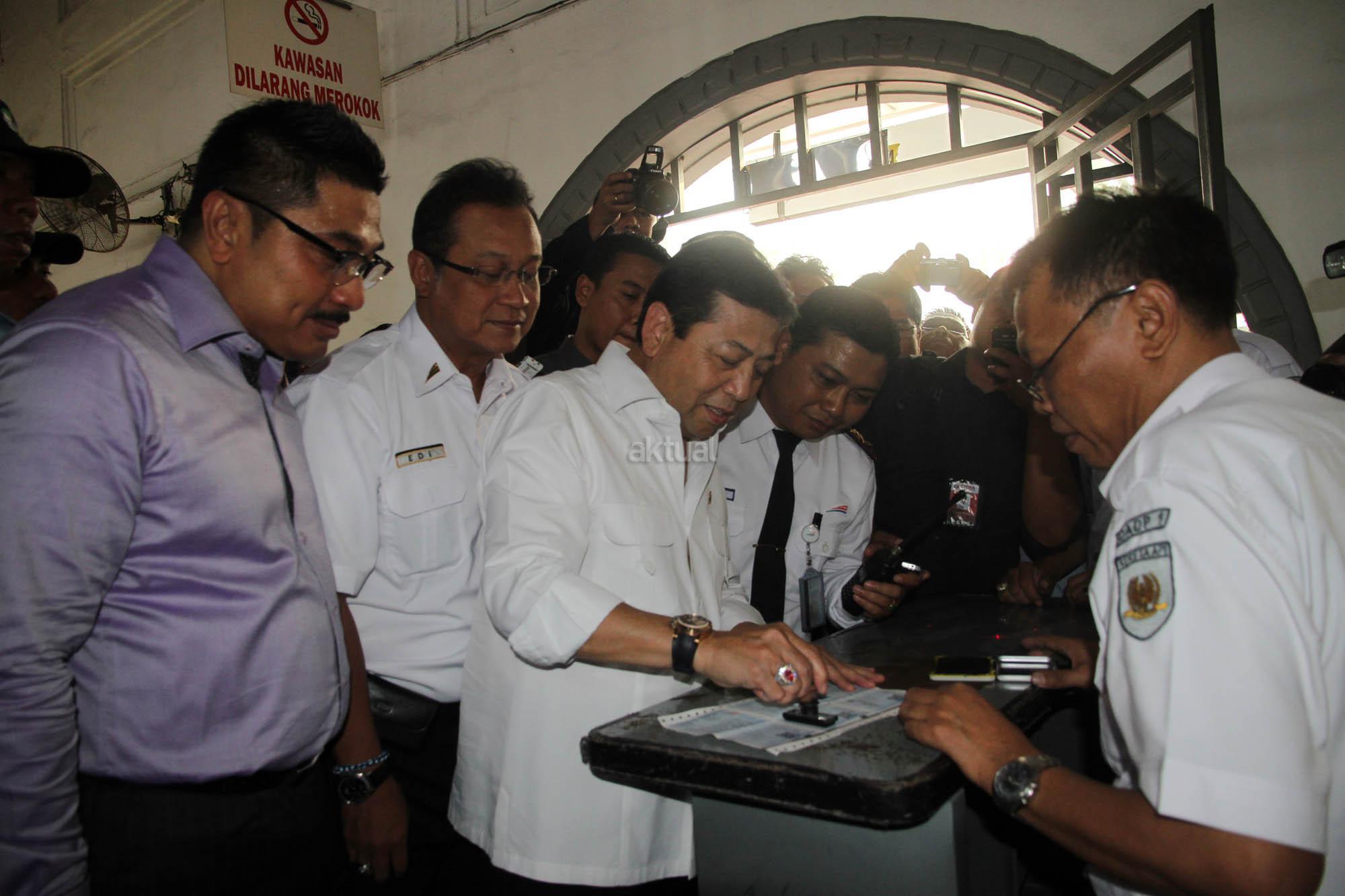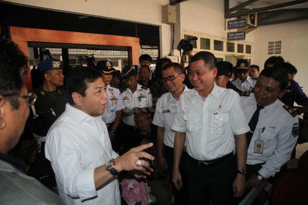Ketua DPR Setya Novanto bersama rombongan anggota komisi V dan Menteri Perhubungan Ignasius Jonan meninjau calon penumpang yang akan mudik di Stasiun Senen, Jakarta, Selasa (7/7/2015). Kunjungan itu dilakukan untuk meninjau kesiapan transportasi kereta api pada arus mudik hari raya Idul Fitri 1436 H.