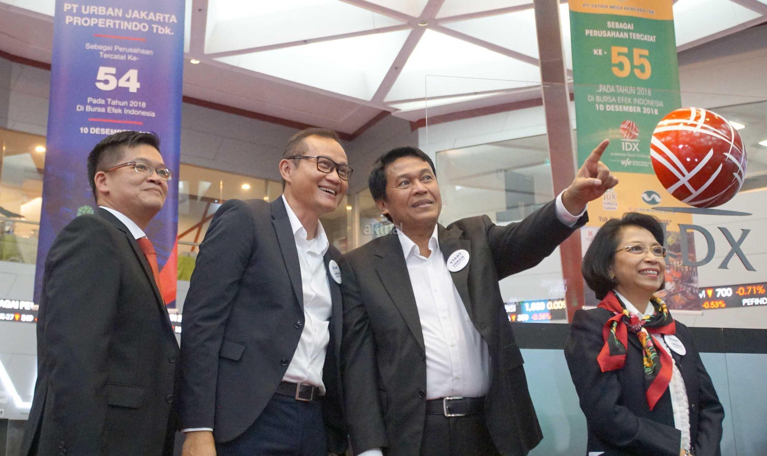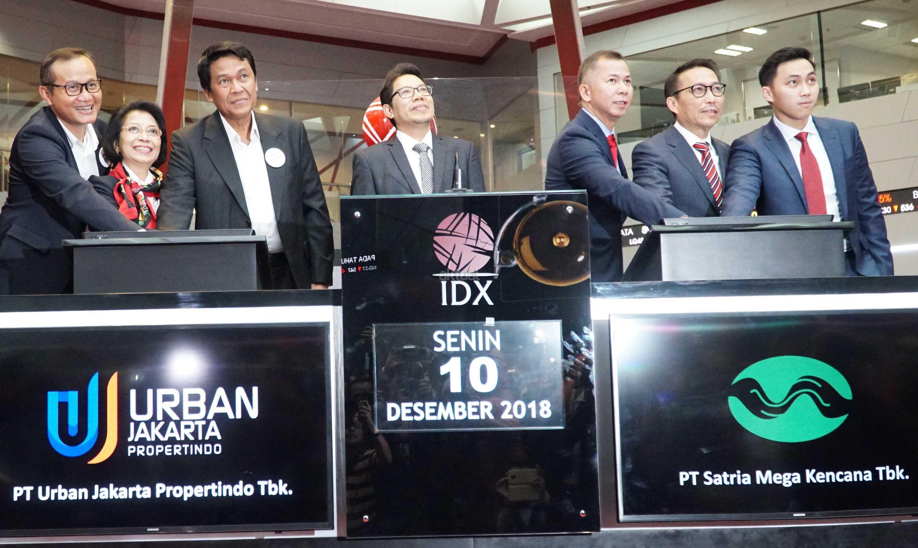 Dua emiten properti dan kawasan pariwisata resmi mencatatkan sahamnya di Bursa Efek Indonesia, Senin (10/12/18). Kedua perusahaan tersebut adalah PT Urban Jakarta Propertindo Tbk (URBN) dan PT Satria Mega Kencana Tbk (SOTS). Jumlah saham yang dilepas oleh URBN adalah 360 juta lembar saham atau sebanyak 11,24% dengan harga Rp 1.200 perlembar saham melalui mekanisme Penawaran Umum Perdana Saham yang dilaksanakan pada 3 Oktober lalu. Penawaran Umum Perdana Saham tersebut mendapat respon positif dengan membukukan kelebihan permintaan (oversubscribed) sebesar 2,6 kali dari jumlah saham yang ditawarkan. Melalui IPO tersebut URBN berhasil memperoleh dana sebesar Rp 430 miliar. Sementara itu, SOTS menawarkan sebanyak 400 juta saham dengan nilai nominal Rp 100 atau mewakili 40% dari modal disetor perseroan setelah Penawaran Umum Perdana Saham yang ditawarkan ke masyarakat dengan harga Rp 165 per lembar saham, dan total hasil Penawaran Umum sebanyak Rp 66 miliar. Mirip dengan URBN, SOTS pun mengalami oversubscribesd lebih dari 5,06 kali terhadap polling 407,66 kali dari 400 juta saham yang ditawarkan dengan jumlah permintaan sebanyak 2.026.644.900 saham. AKTUAL/Eko S Hilman