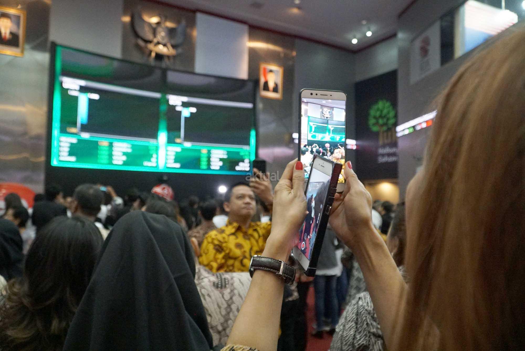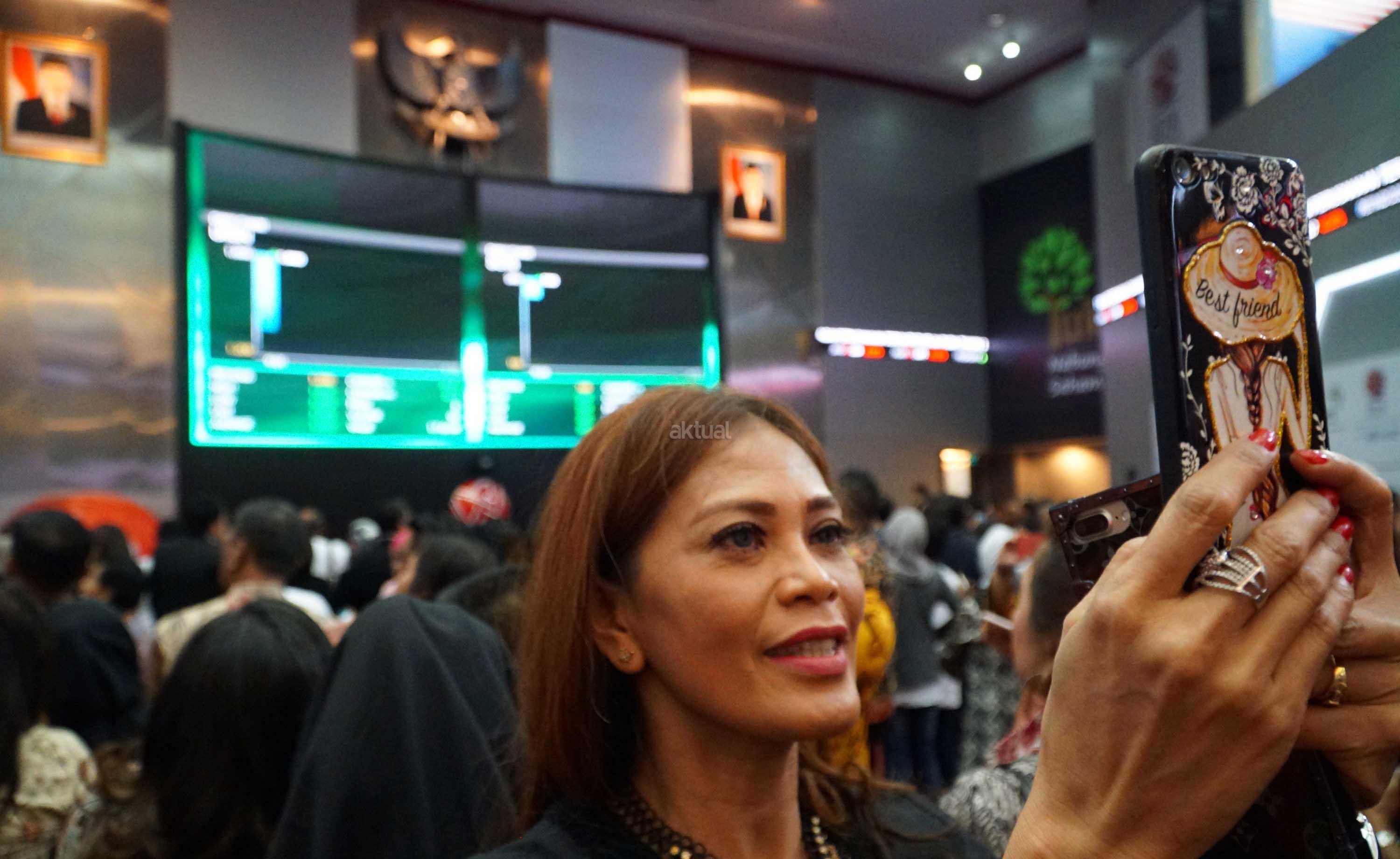 Pengunjung saat pencatatan saham PT Urban Jakarta Propertindo Tbk dan PT Satria Mega Kencana Tbk di BEI, Jakarta, Senin (10/12/18). Dua emiten properti dan kawasan pariwisata tersebut resmi mencatatkan sahamnya di Bursa Efek Indonesia. AKTUAL/Eko S Hilman