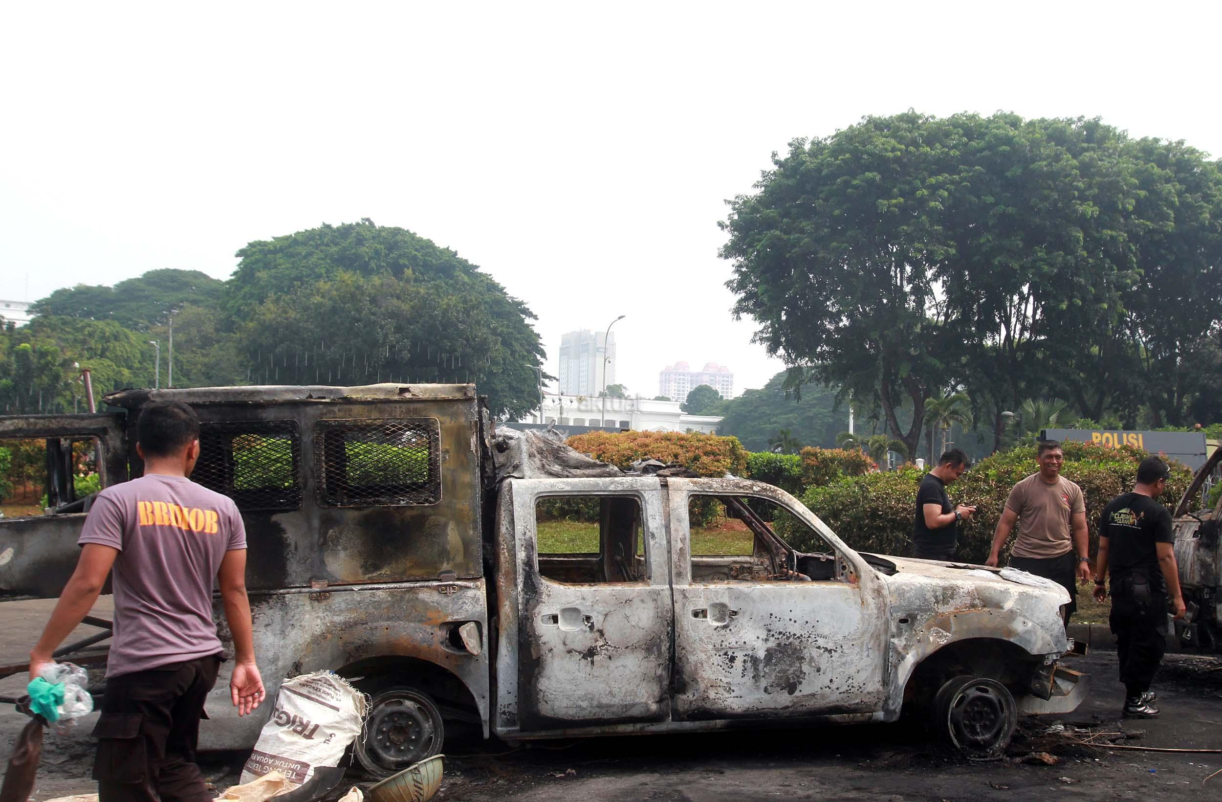 Petugas Kepolisian mengecek kondisi dua kendaraan Polisi yang hangus terbakar tadi malam saat terjadi bentrokan di depan Istana Merdeka, Jakarta, Sabtu (5/11/2016). Sebelumnya dalam aksi bentrokan tadi malam antara pihak Kepolisisan dengan massa aksi 4 November dan dua kendaraan dinas milik Kepolisian hangus terbakar.