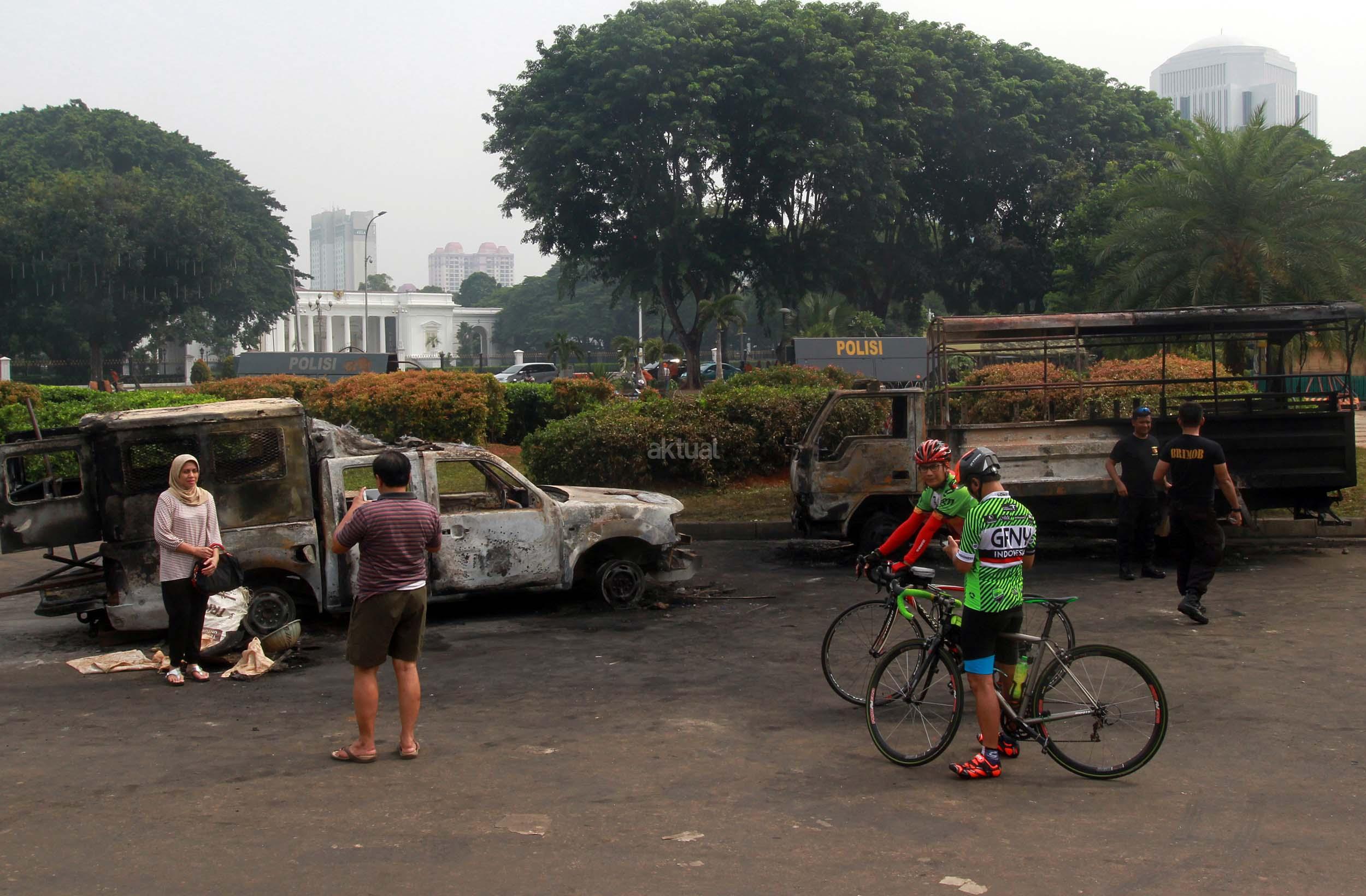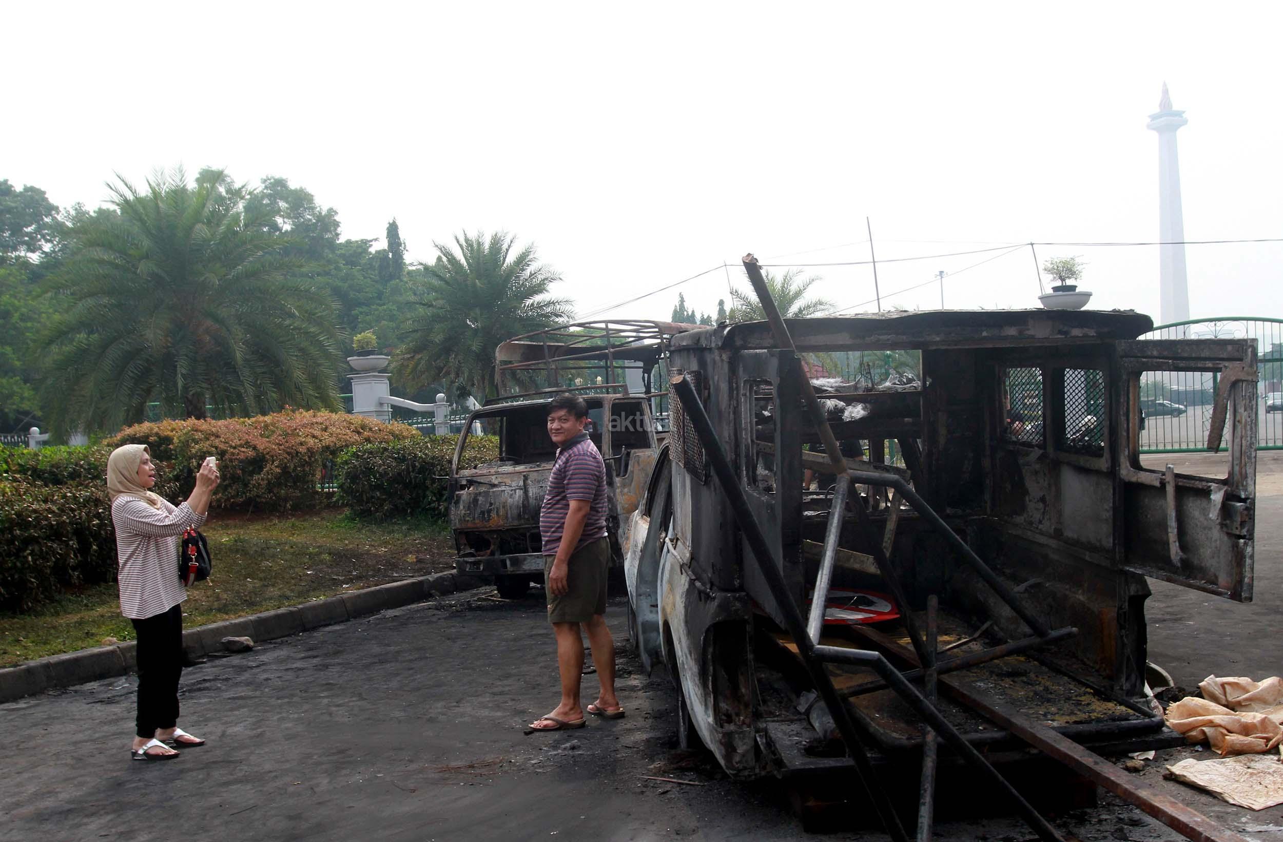 Warga sedang berfoto di belakang kendaraan milik Kepolisian yang terbakar tadi malam saat terjadi bentrokan di depan Istana Merdeka, Jakarta, Sabtu (5/11/2016). Sebelumnya dalam aksi bentrokan tadi malam antara pihak Kepolisisan dengan massa aksi 4 November, dua kendaraan dinas milik Kepolisian hangus terbakar. AKTUAL/Munzir