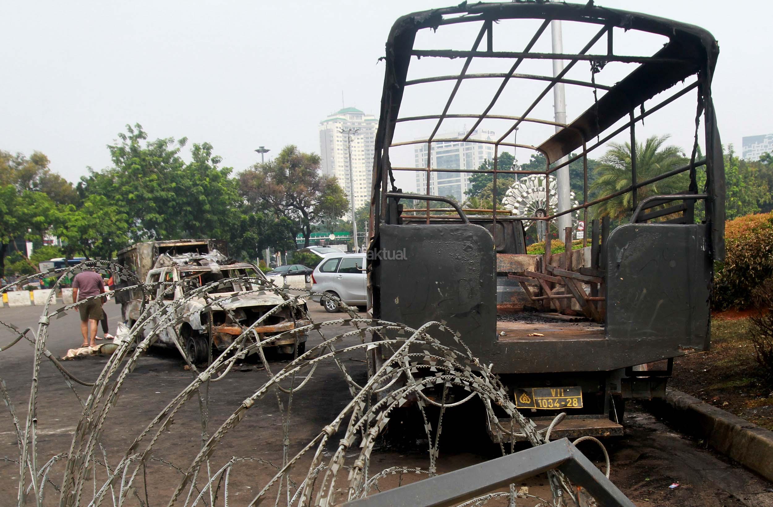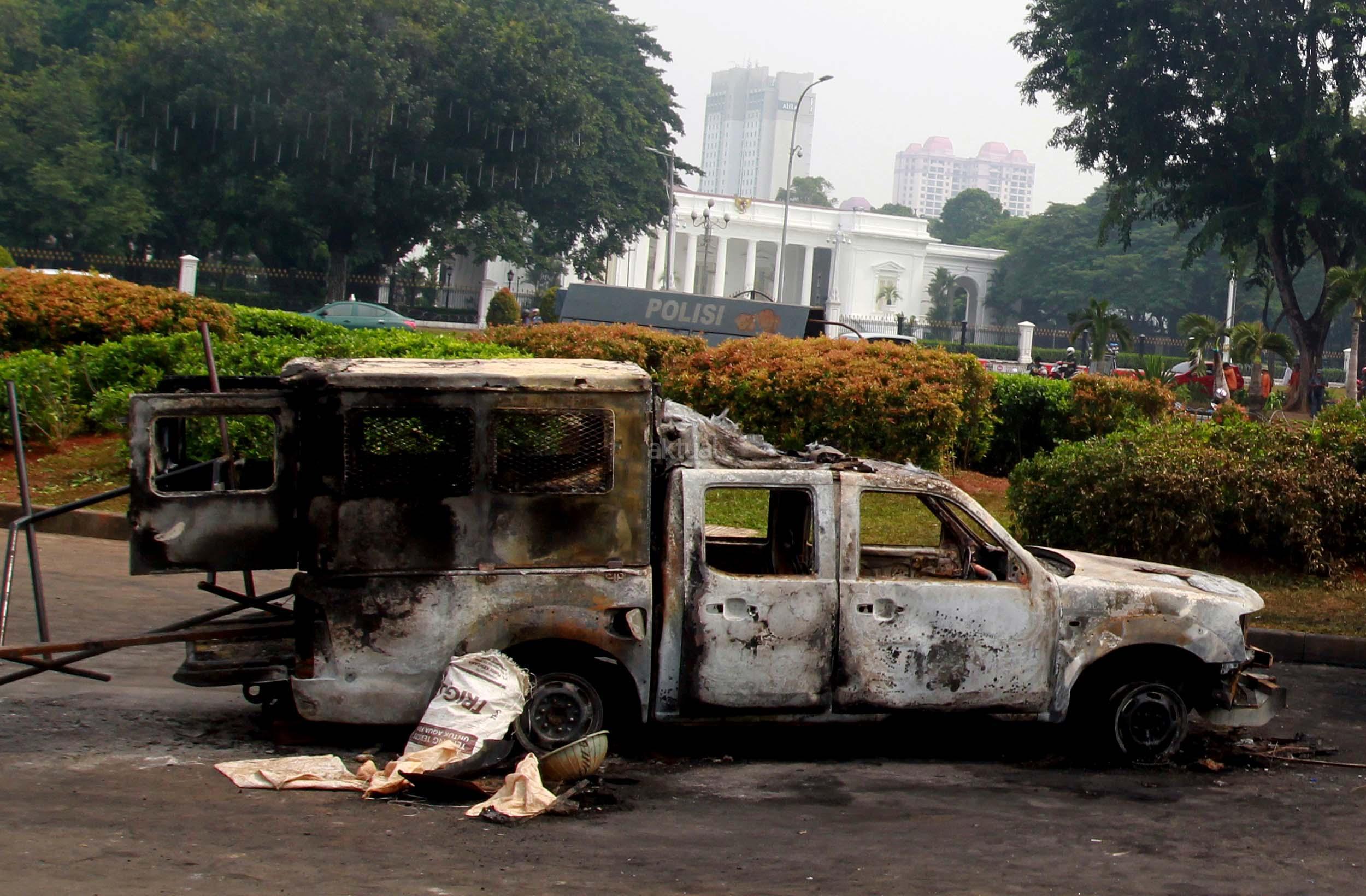Sebelumnya dalam aksi bentrokan tadi malam antara pihak Kepolisisan dengan massa aksi 4 November, dua kendaraan dinas milik Kepolisian hangus terbakar. AKTUAL/Munzir