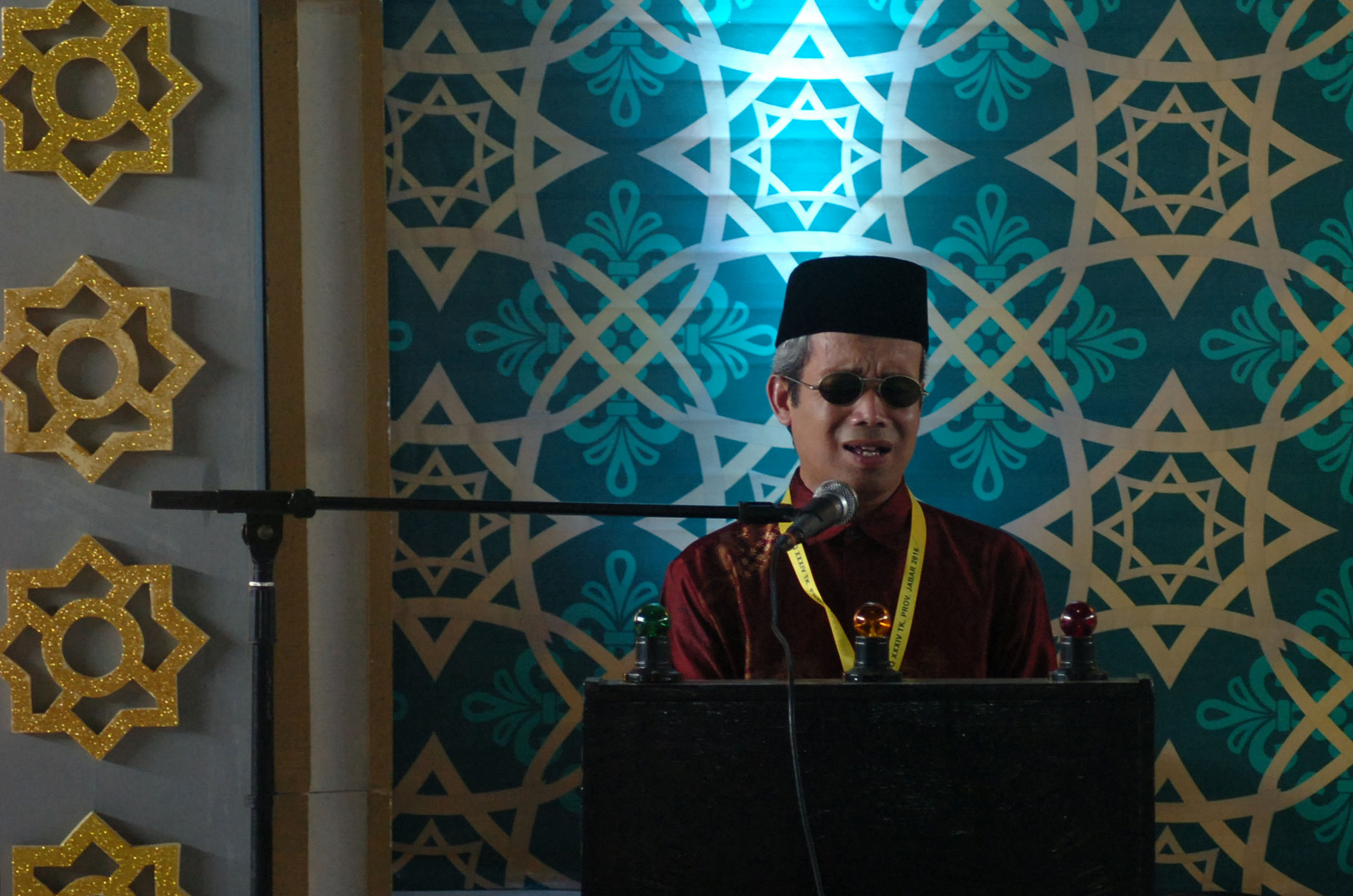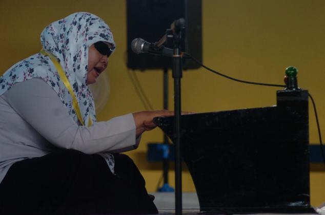 Peserta Musabaqoh Tilawatul Quran (MTQ) cacat netra membacakan ayat suci Alquran di Gelanggang Generasi Muda (GGM) Dadaha, Tasikmalaya, Jawa Barat, Senin (18/4). MTQ ke-34 tingkat Jawa Barat dari peserta cacat netra itu diikuti delapan peserta dari Kota/Kabupaten se-Jawa Barat. ANTARA FOTO/Adeng Bustomi/kye/16