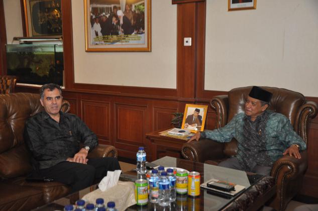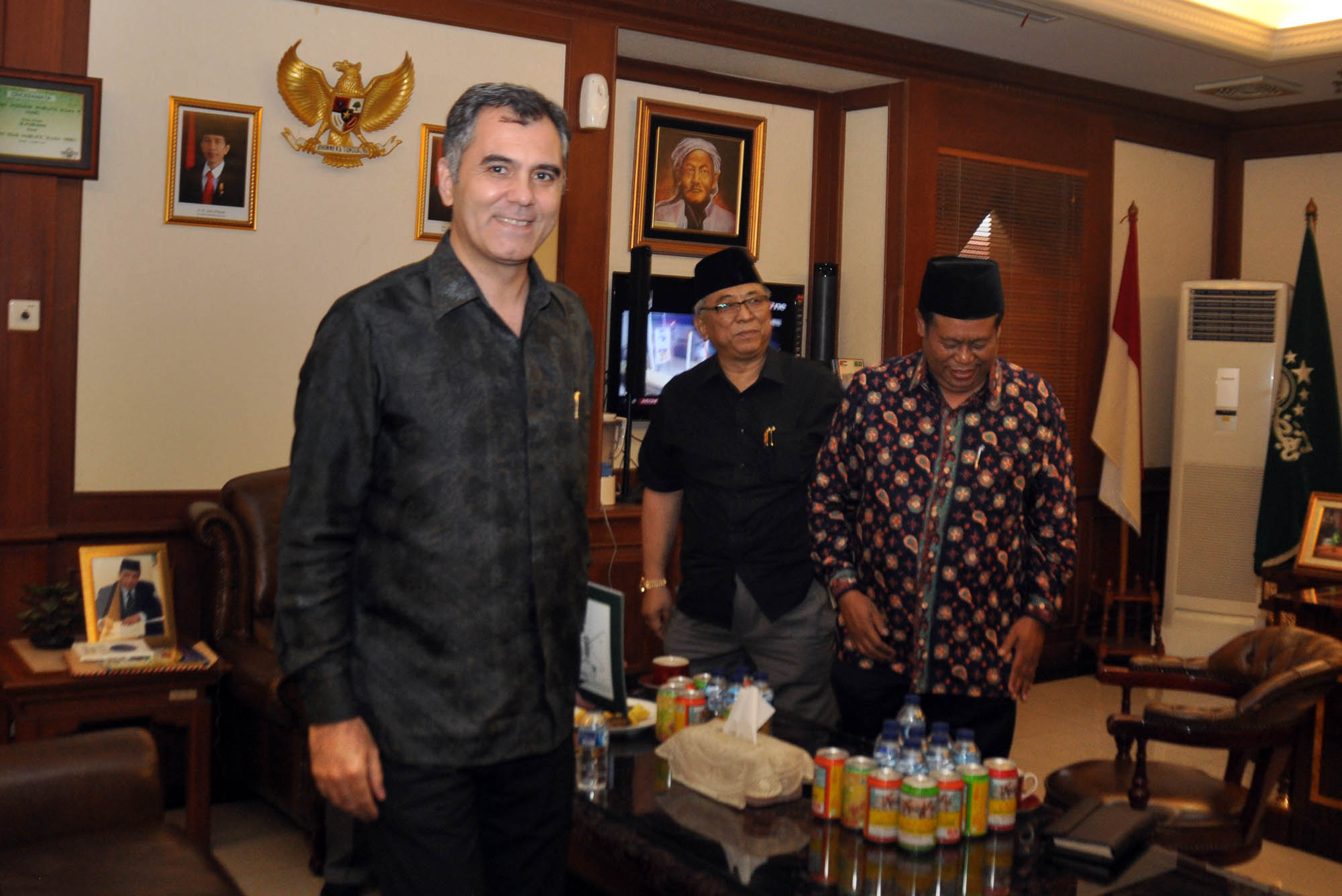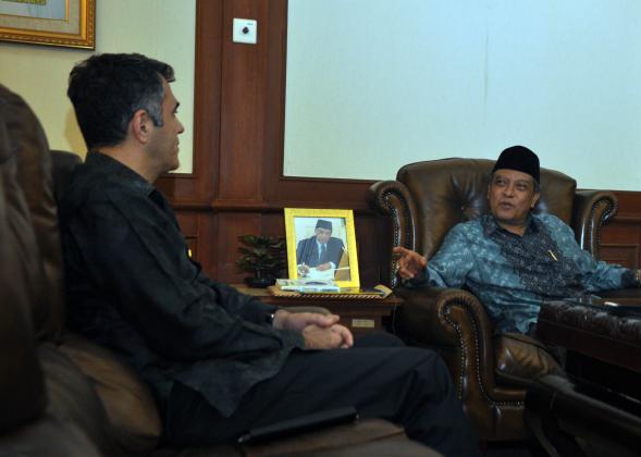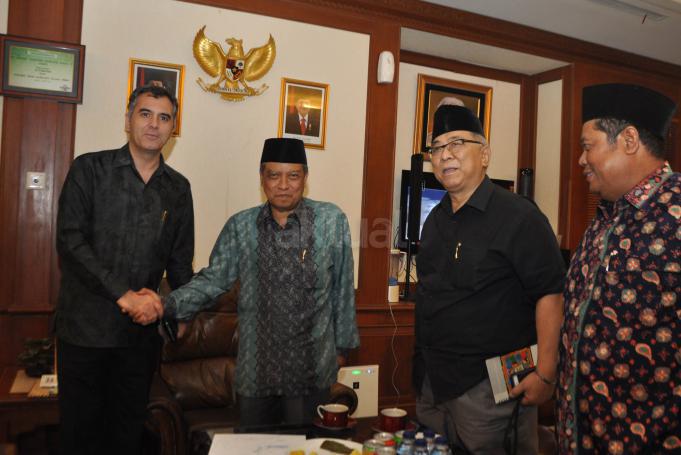 Duta Besar (Dubes) Turki HE Mr Zekeria Akcam (kiri) berjabat tangan dengan Ketua Umum PBNU KH Said Aqil Siroj (dua dari kiri) di Kantor PBNU, Kramat, Jakarta, Jumat (11/9/2015). Kunjungan Dubes Turki dalam rangka mengenal Islam Nusantara dan Demokrasi di Indonesia.