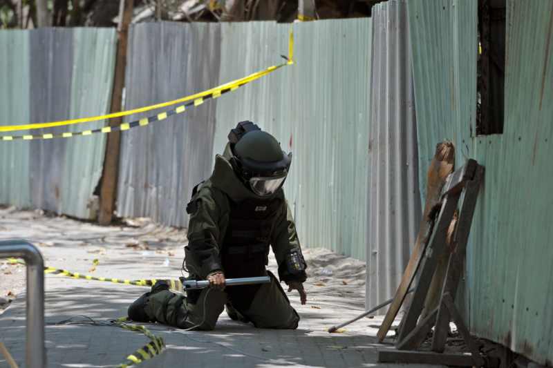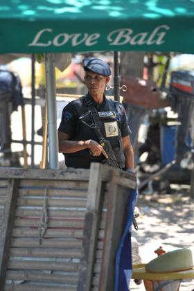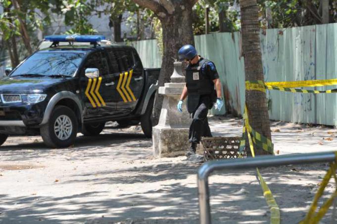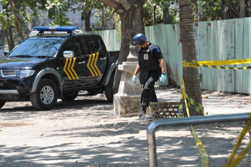 Anggota Brimobda Bali menyisir kawasan pantai untuk mencari serpihan benda yang diduga bom setelah diledakkan di Pantai Jerman, Kuta, Jumat (25/9). Benda mencurigakan yang ditemukan di pinggir pantai kawasan wisata itu diledakkan sebelum diteliti lebih lanjut oleh tim Gegana Polda Bali. ANTARA FOTO/Nyoman Budhiana