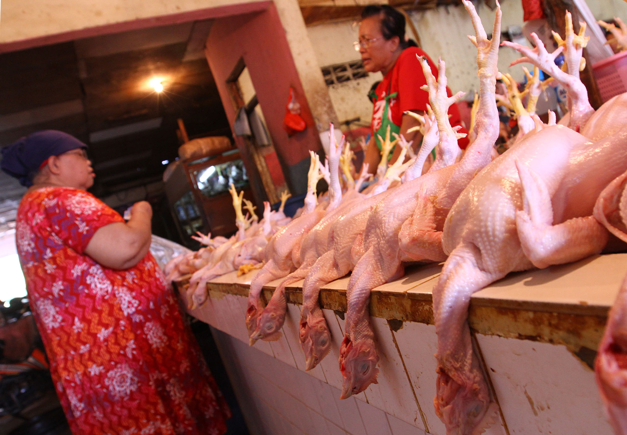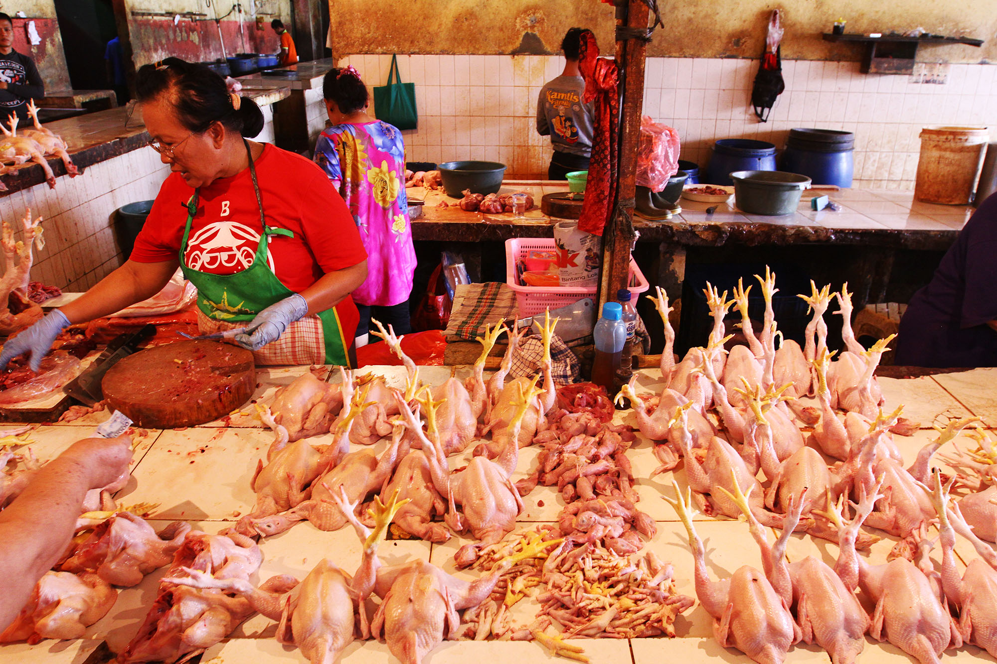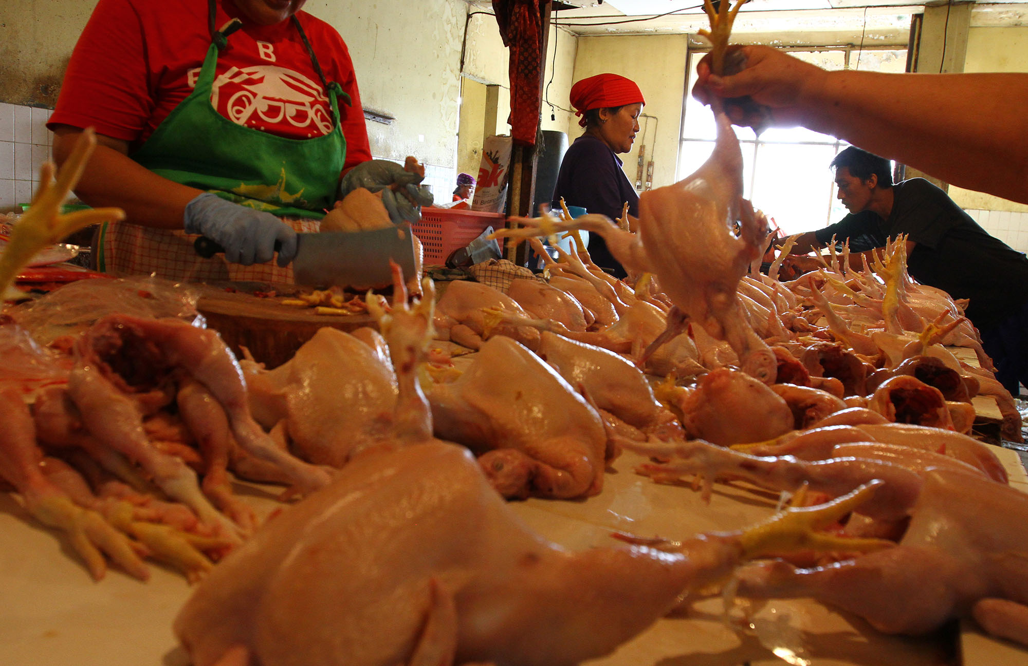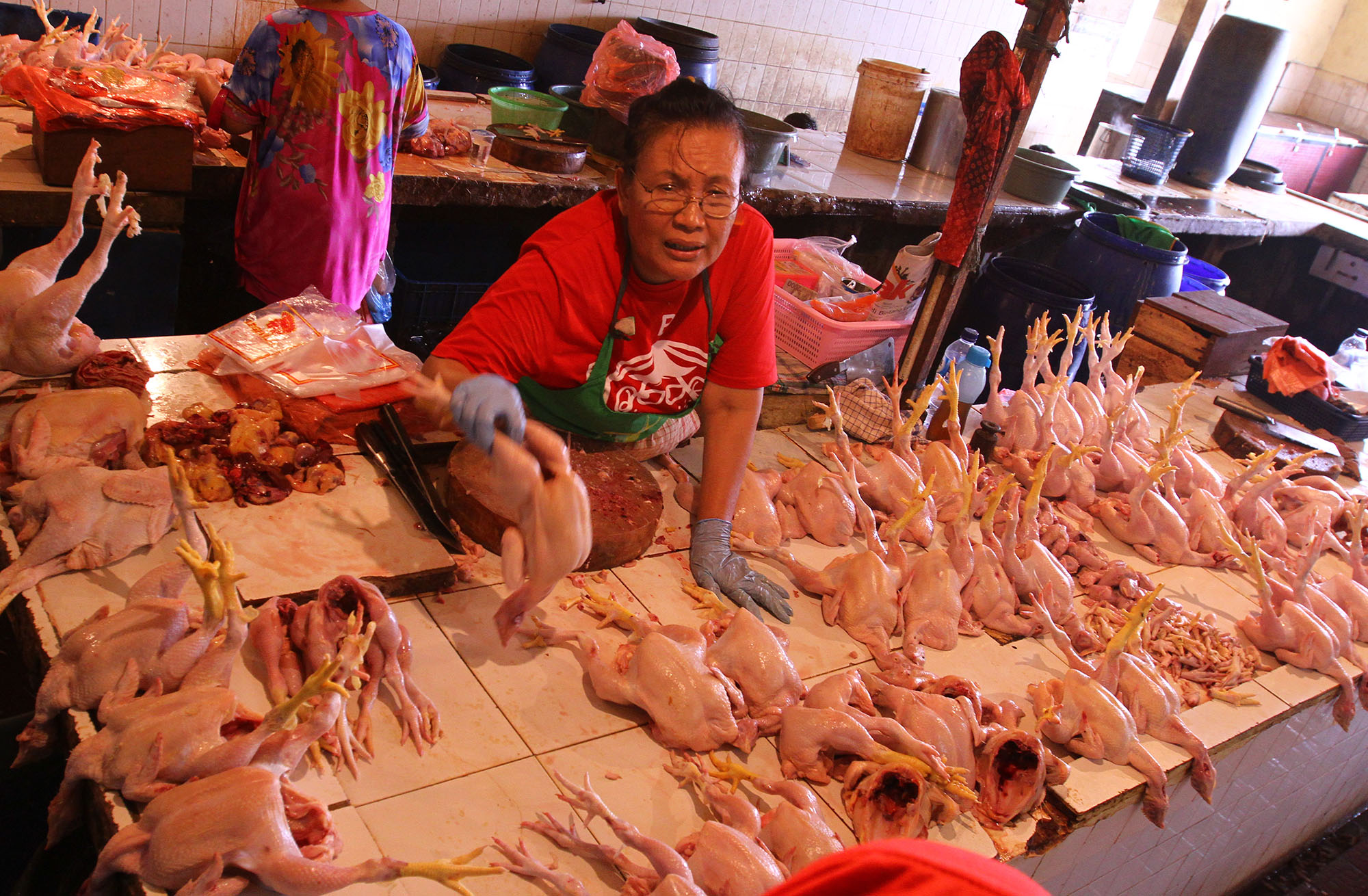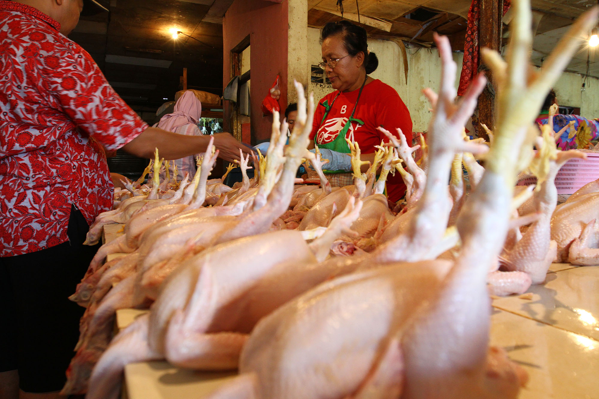 Pedagang melayani pembeli ayam di Pasar Rumput, Jakarta Selatan, Selasa (9/8). Komisi Pengawas Persaingan Usaha (KPPU) memanggil 12 perusahaan yang diduga melakukan praktik kartel dengan mengatur stok daging ayam. Dua belas perusahaan tersebut diduga bersekongkol memusnahkan enam juta ekor bibit ayam. Praktik ini diduga sebagai penyebab naiknya harga daging ayam beberapa waktu lalu. AKTUAL/TINO OKTAVIANO